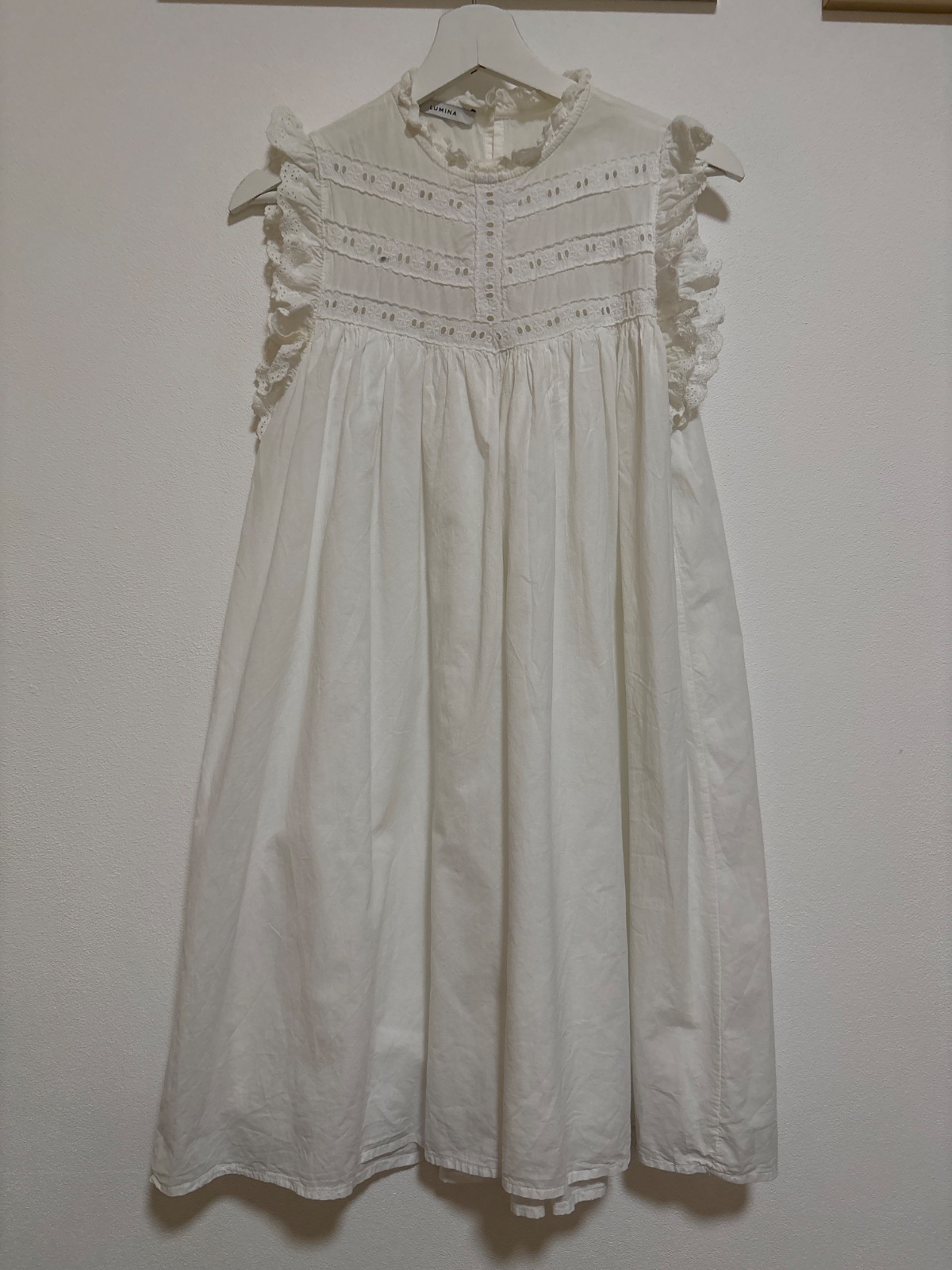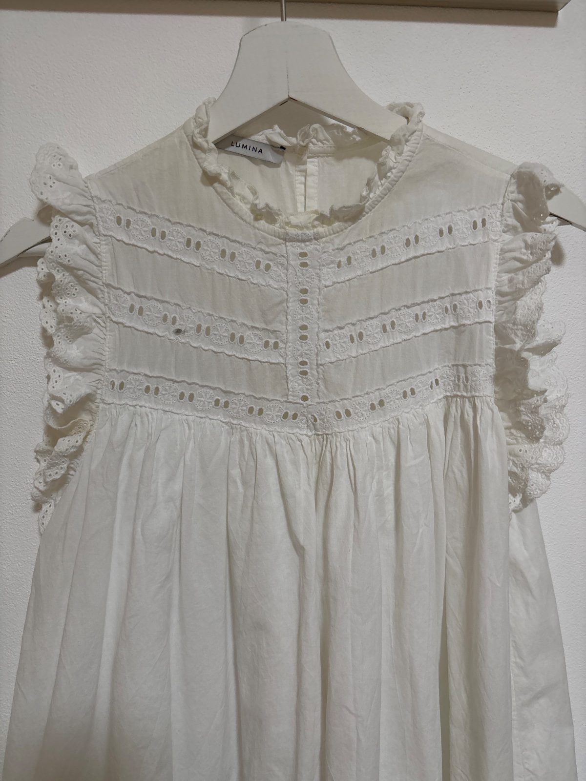 Biele krásne talianske voľne vzdušné saty s podsivkou, čiže nepresvitaju, vzadu na gombík, vpredu výšivky s krajkou ku krku. Bavlna 100%. Bez poskidenia. Môžete nosiť samostatne, s opaskom alebo k leginam, džínsom. Veľkosť S/M, ale v podstate uni.