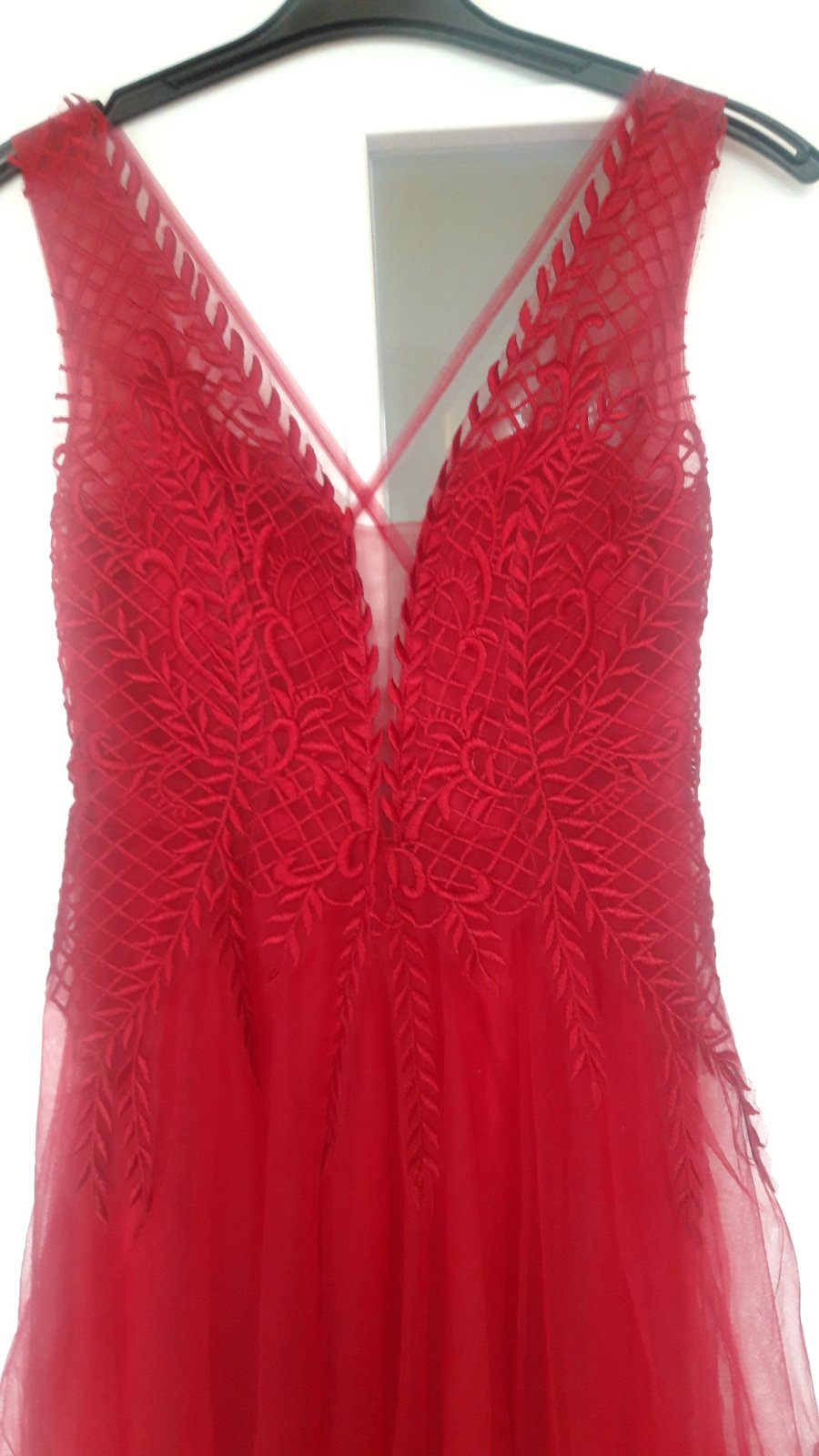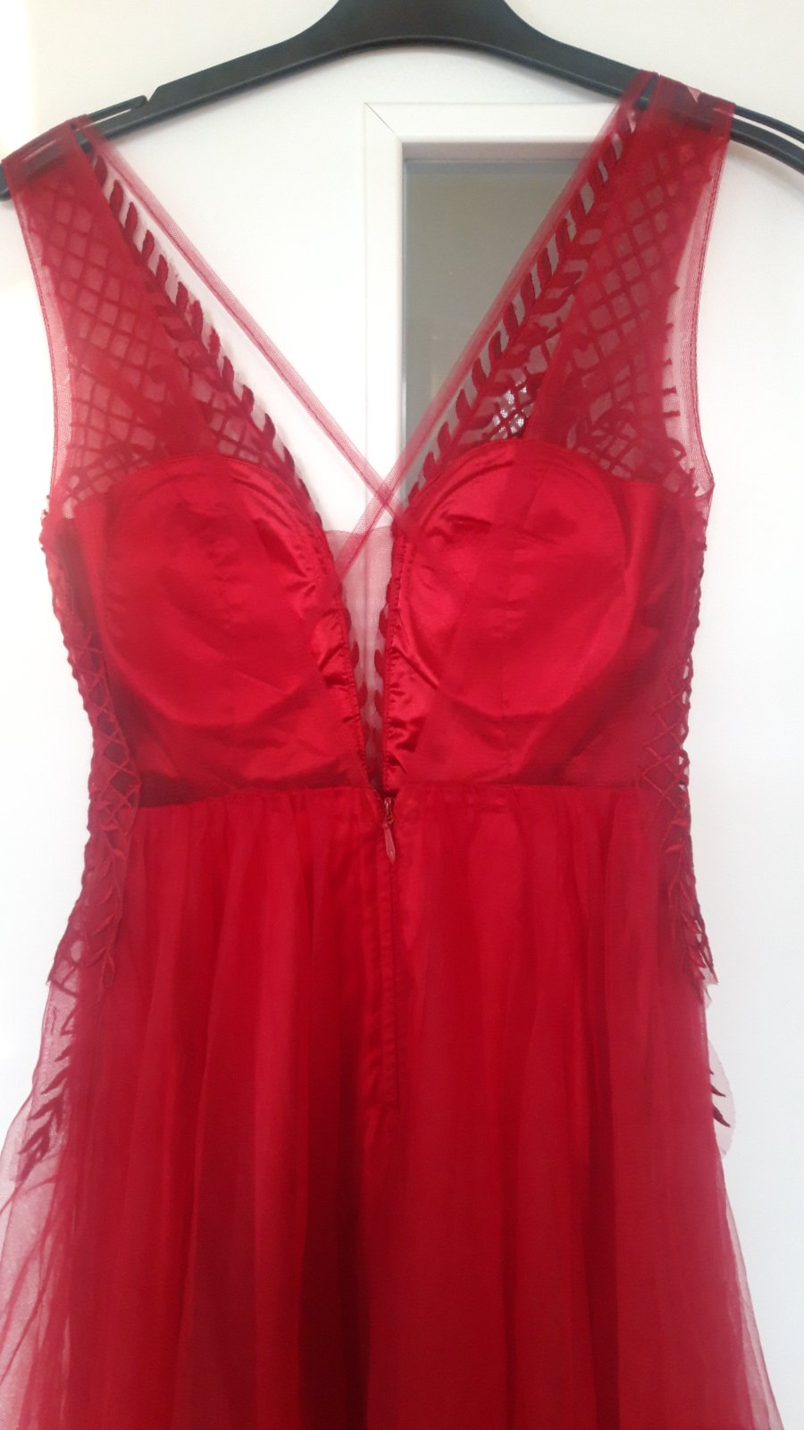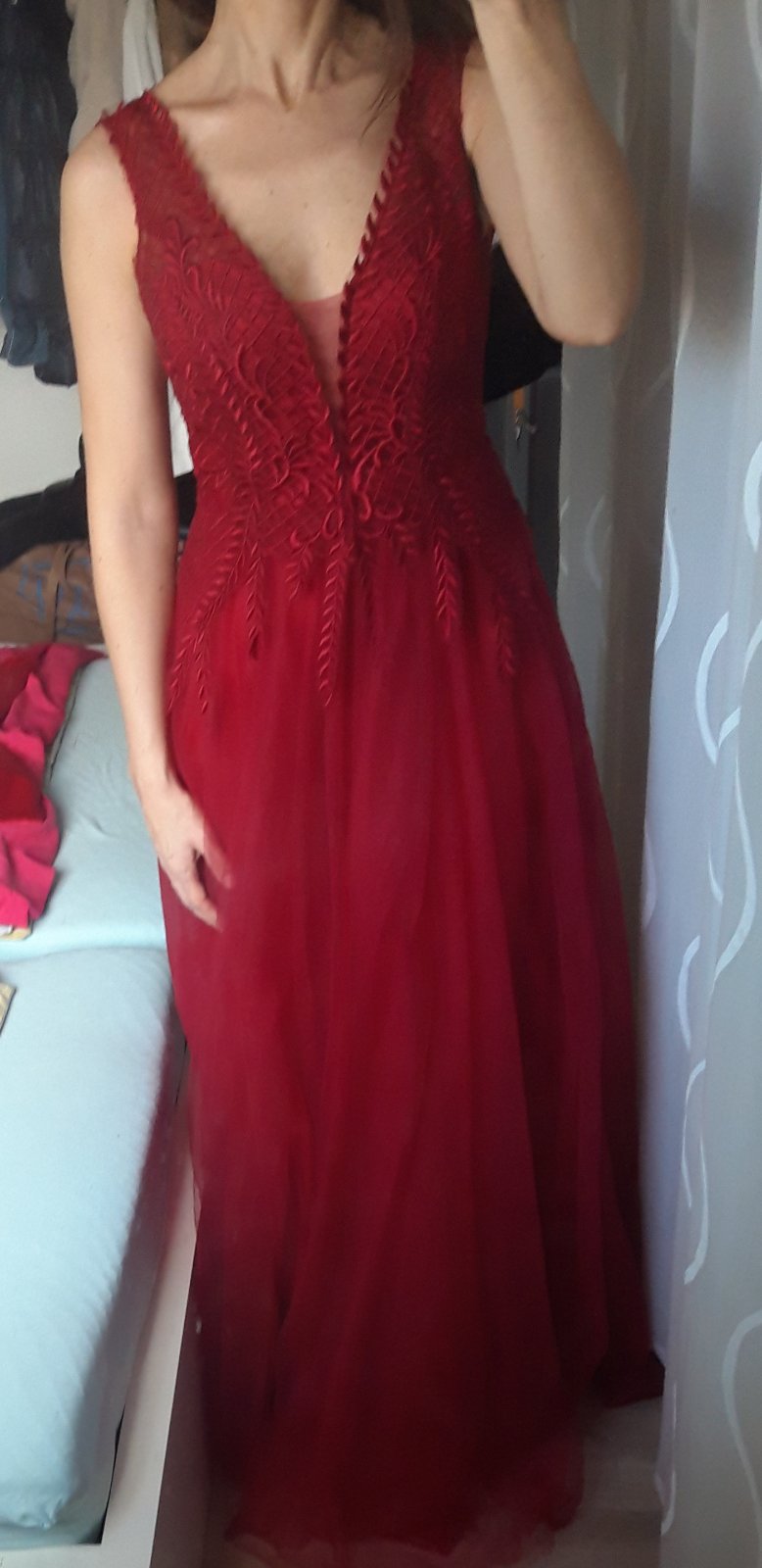 Krásne v predu vystuzené, nieje treba podprsenku. Dĺžka od ramena 156 cm v páse 34 cm, farba je krásna krvavo červená. Reálna farba ako na úplne prvej foto veľmi ťažko sa to dá odfotiť.