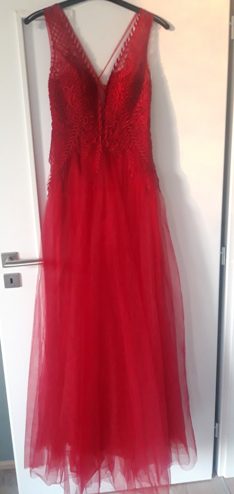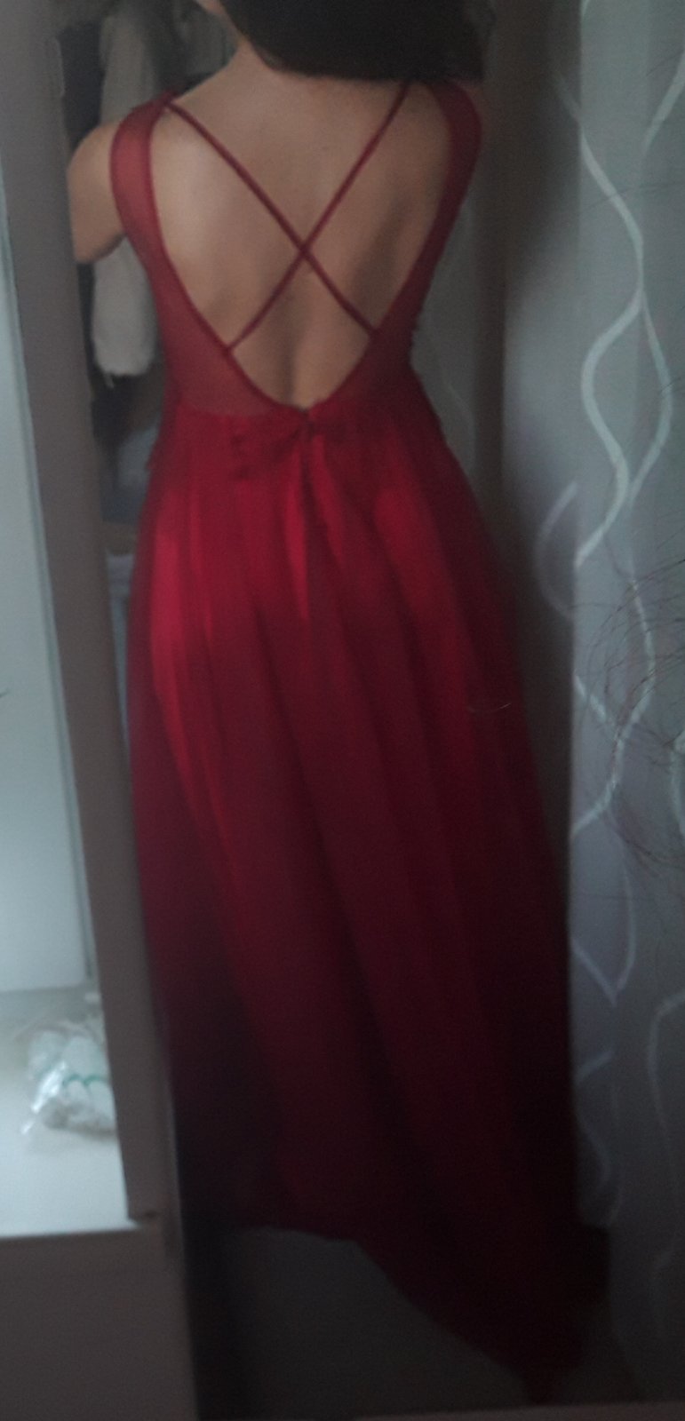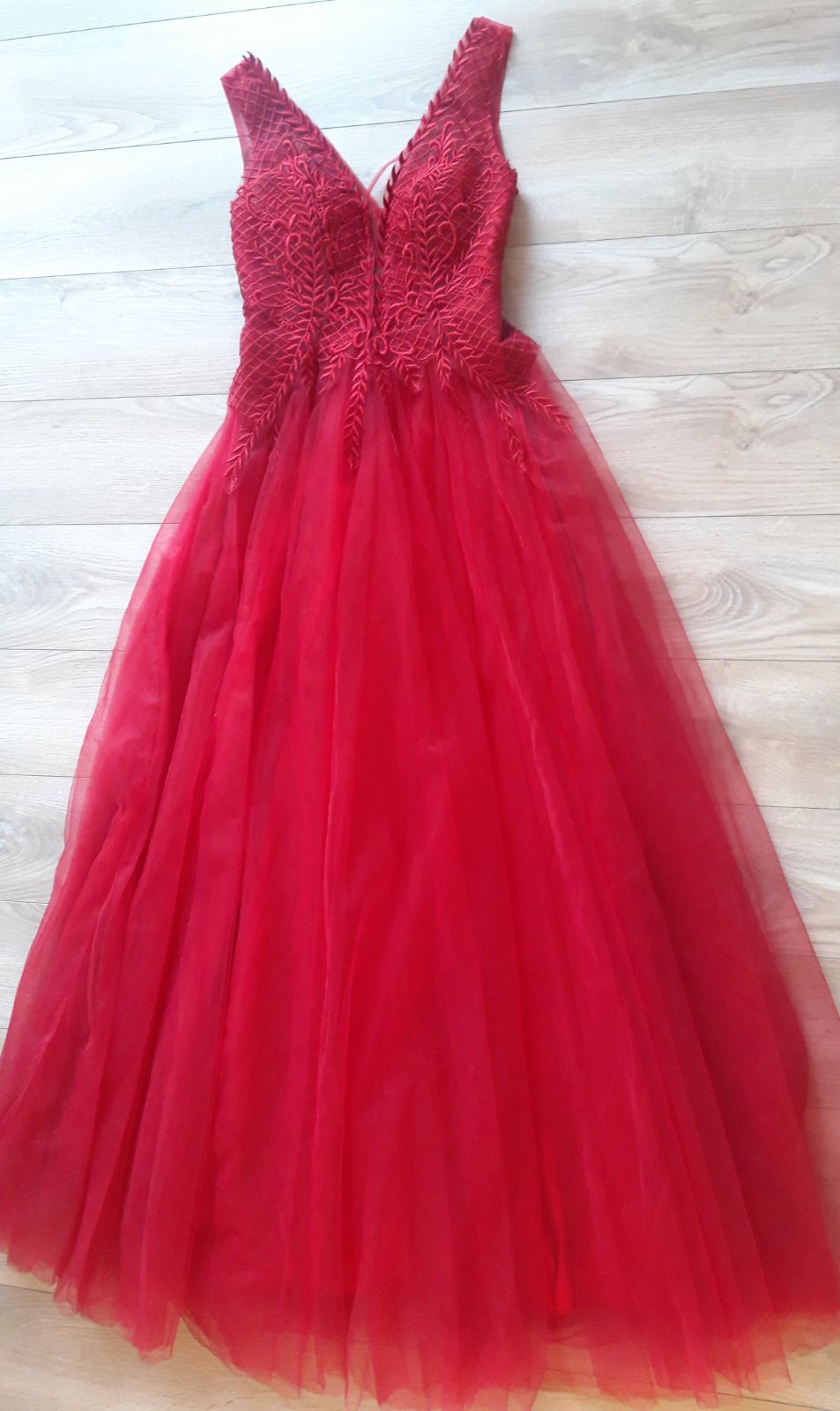 Krásne v predu vystuzené, nieje treba podprsenku. Dĺžka od ramena 156 cm v páse 34 cm, farba je krásna krvavo červená. Reálna farba ako na úplne prvej foto veľmi ťažko sa to dá odfotiť.