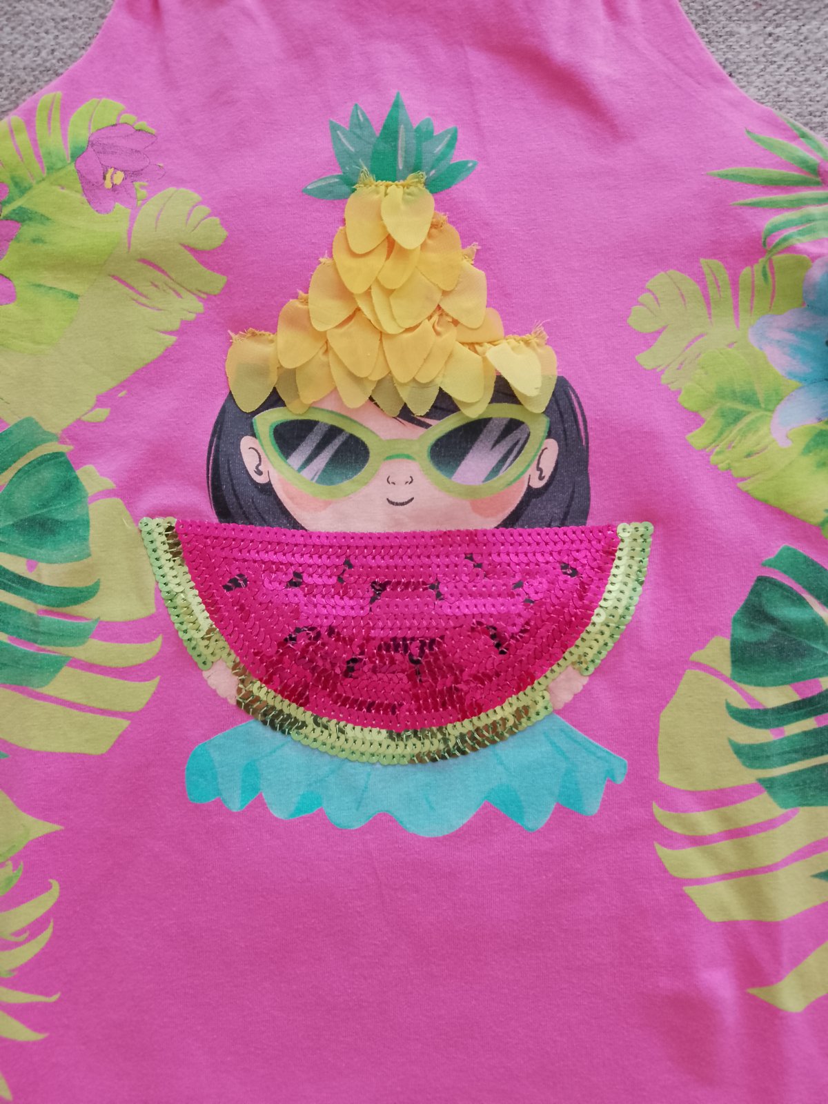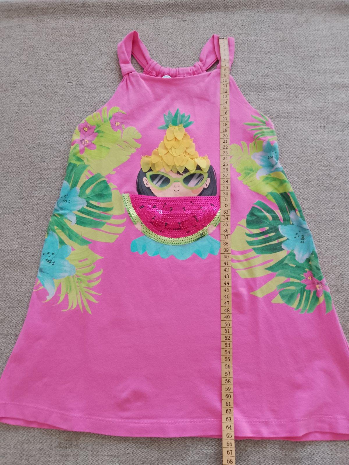 Dievčenské letné šaty v super stave. Oblečené boli max. 3x. Bez poškodenia, dier a fľakov. Rozmery - viď foto. Na prednom diely je našitá aplikácia + premieňacie flitre.