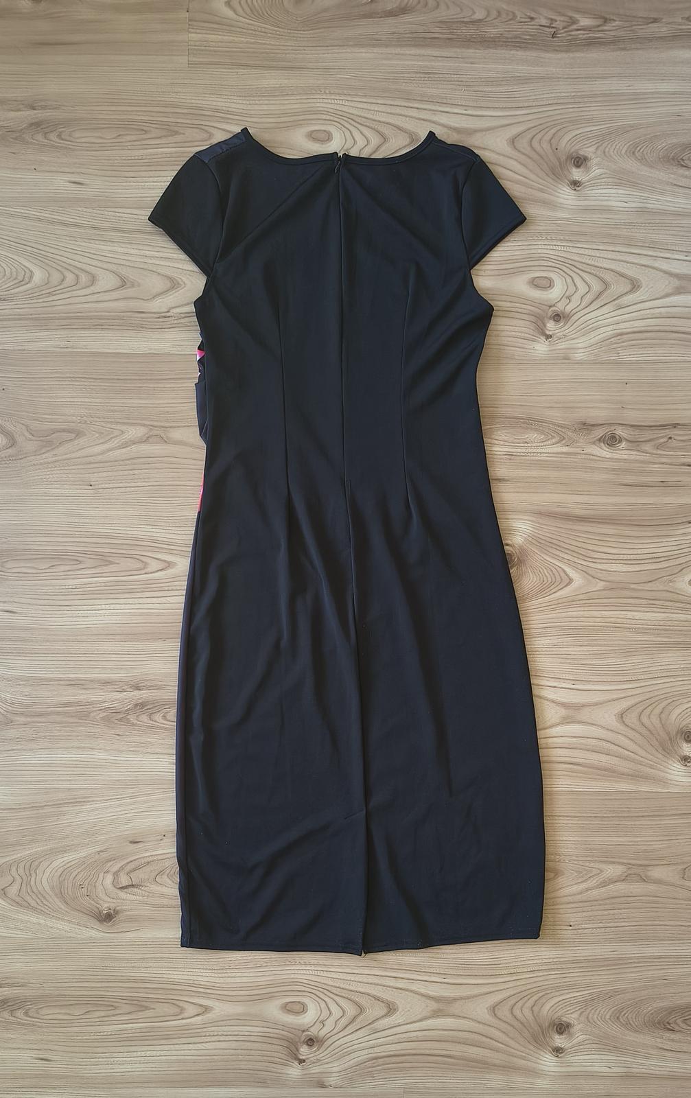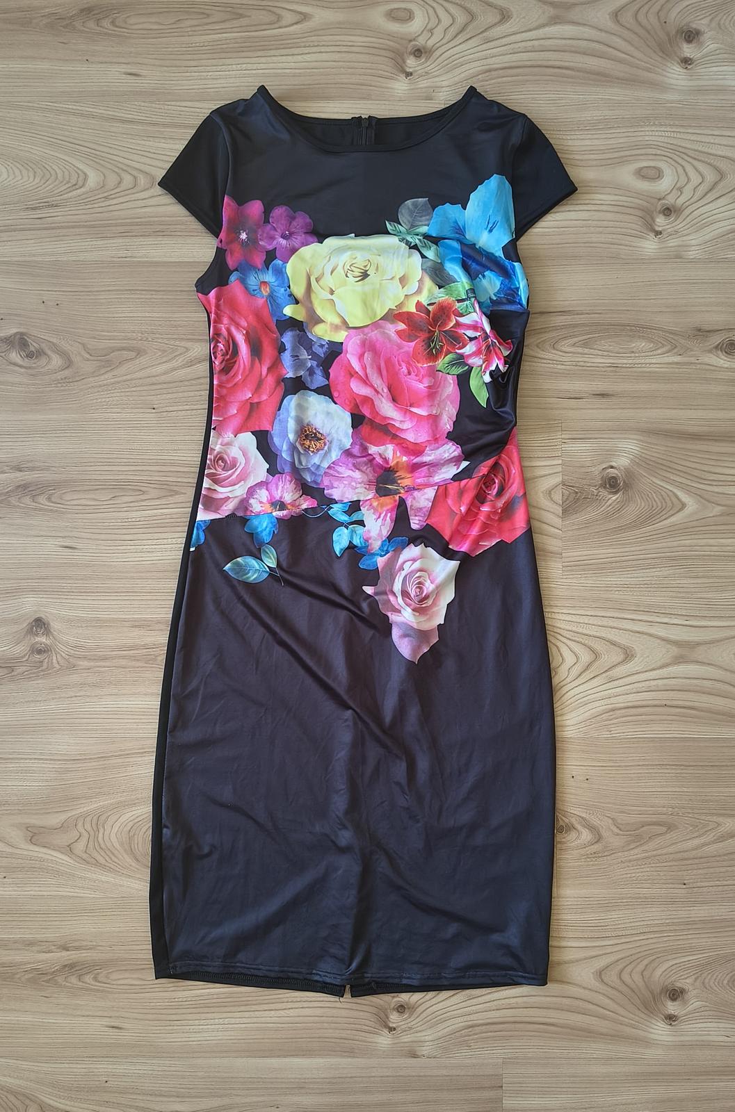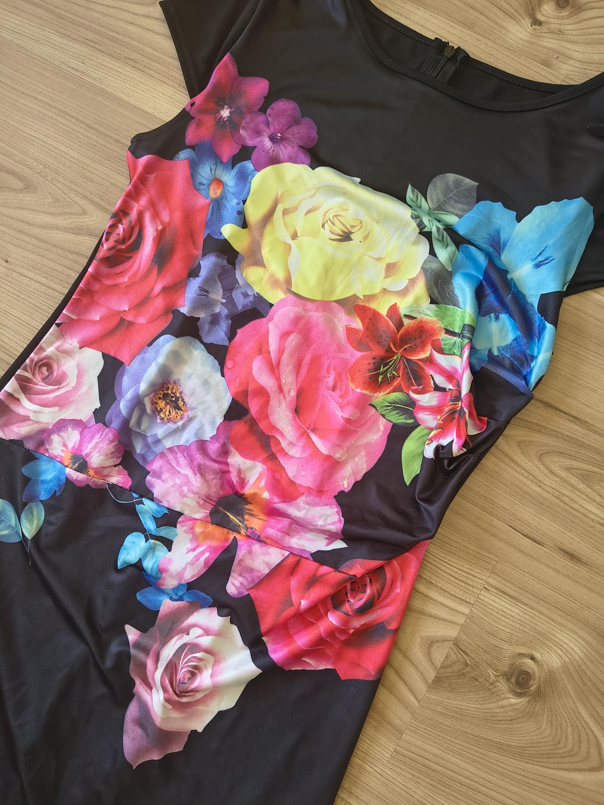 Čierne puzdrové šaty, s pestrou kvetinovou potlačou na prednej strane, so zapinanim na zips na zadnej strane. Oblečené len 1x, perfektný stav, nepoškodené.