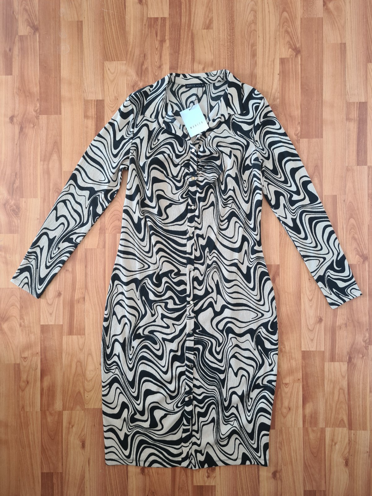 Perfektné šaty z polyesteru a elastanu! Dĺžka - 93 cm, šírka - 2x 54 cm, boky - 2x 58 cm, rukáv od krku - 69 cm.