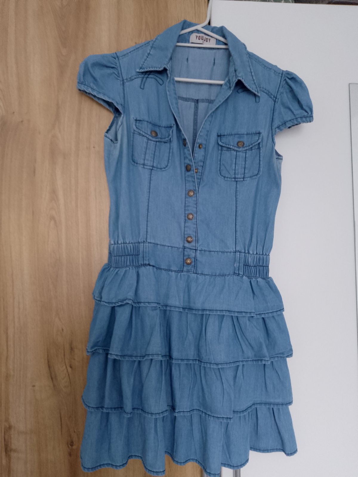 Tmavomodro bezove pasikave saty Hrubsi material Kratky rukav 2 vrecka Top stav Velkost S Dlzka 81-82 cm Sirka 42-52( elasticke) Obvod ruky 30cm