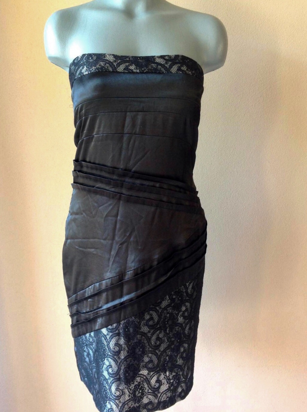 Cierne satenove saty s krajkou,pouzite,trolinku zatiahnuta katka vzadu ale nic hrozne,v prsiach mierne vypchavky,vzadu na chrbte je zips a hore gumka,podsite