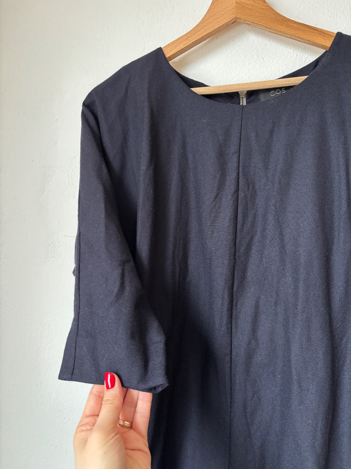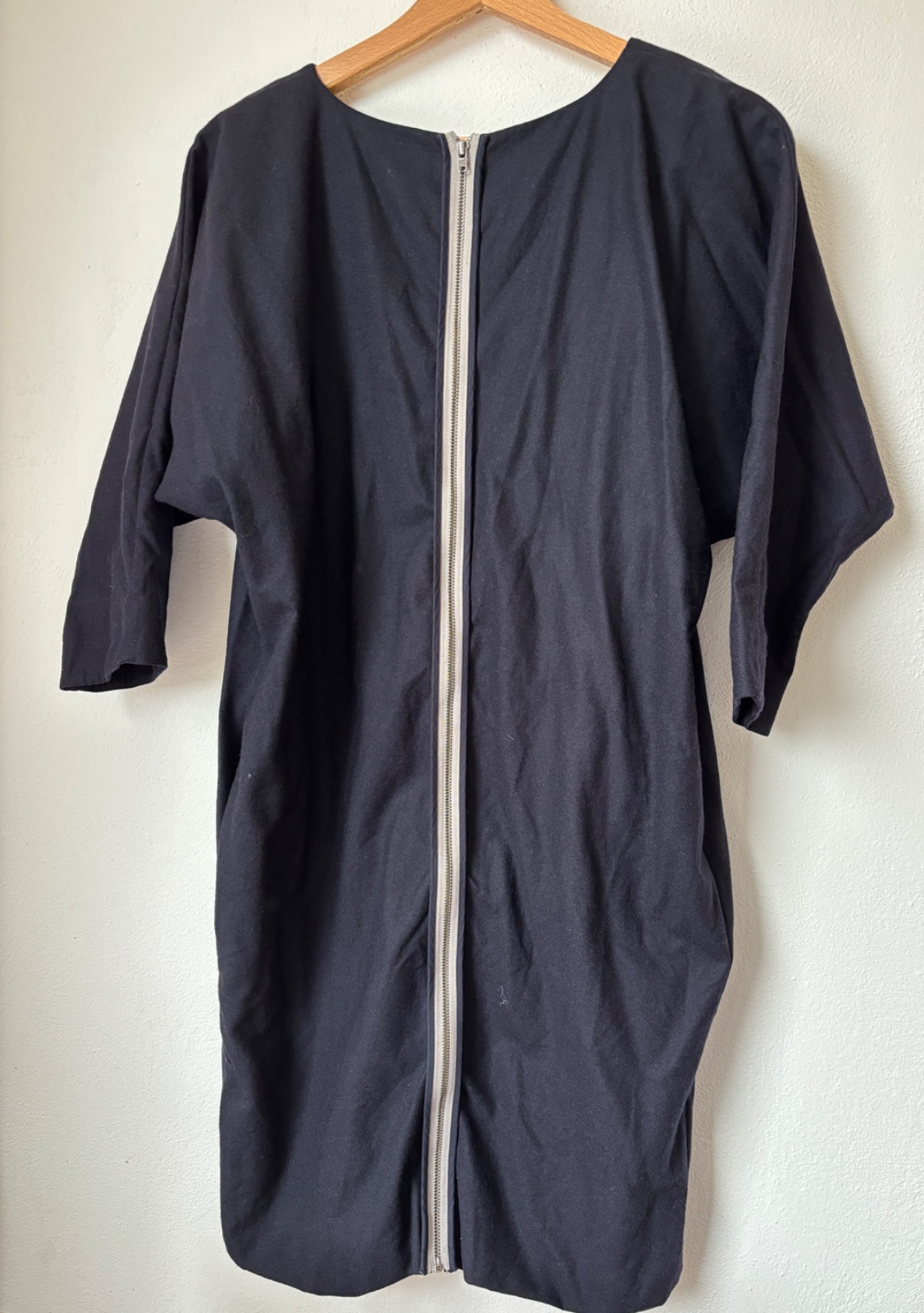 Tmavomodre vlnene saty. Vzadu maju zips, po bokoch vrecka.