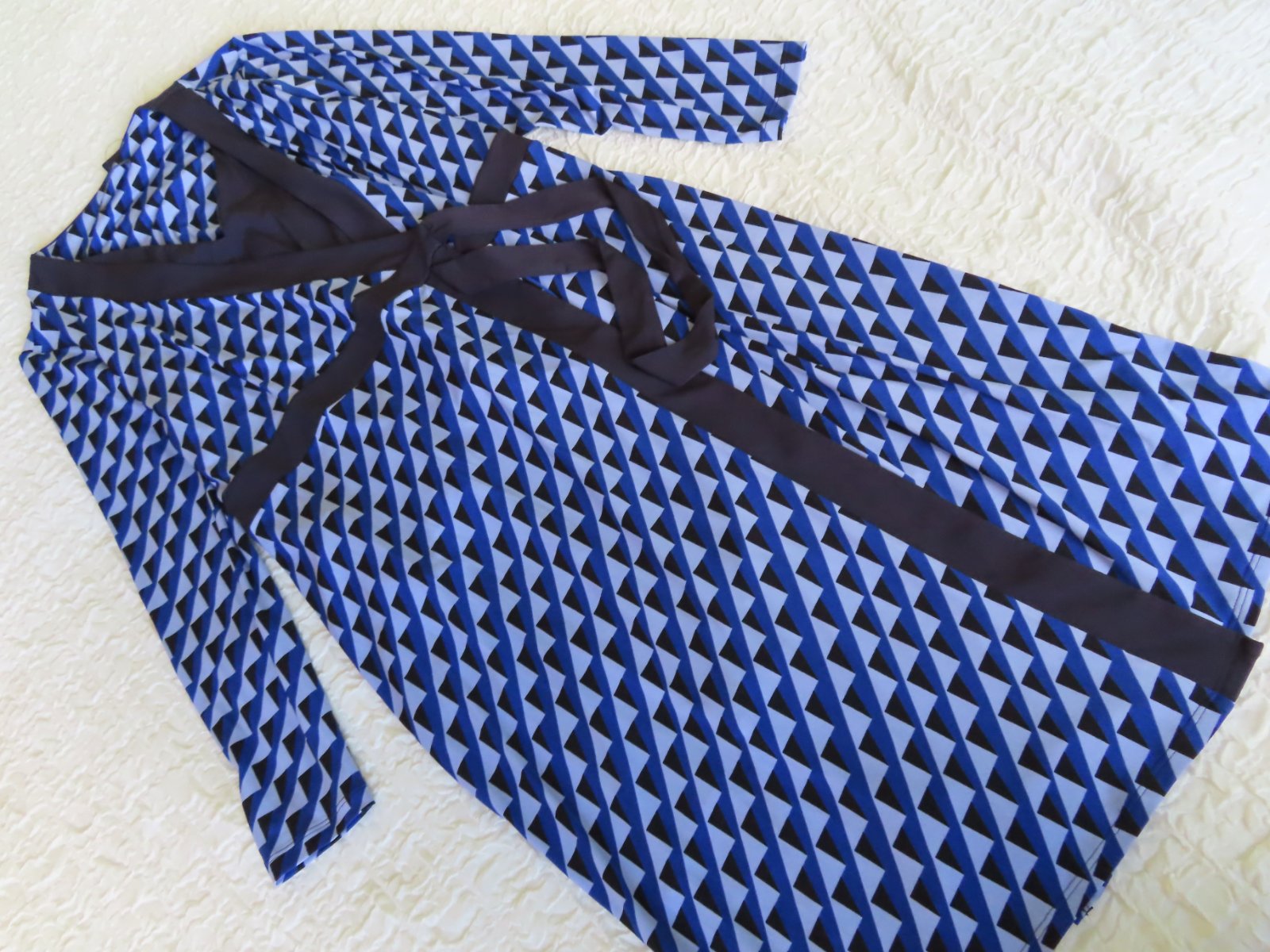 Modro-čierne pletené zavinovacie šaty s potlačou a detailom na zaväzovanie, majú výstrih do V, dlhé rukávy, všitú podšívku, rovný lem