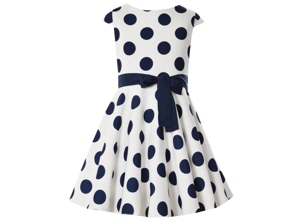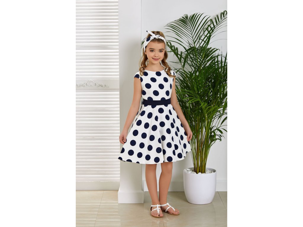 Elegantné dievčenské šaty z kvalitného materiálu typu Barbie v bielej farbe s tmavomodrými bodkami. Bavlnená podšívka s tylom, viazanie na mašľu v páse a zapínanie na krytý zips.Tieto dievčenské bodkované šaty z vysokokvalitného materiálu typu Barbie sú dokonalou voľbou pre slávnostné a spoločenské príležitosti. Biela farba v kombinácii s tmavomodrými bodkami pôsobí čisto, elegantne a nadčasovo, pričom jemný retro štýl dodáva šatám výnimočný charakter.
