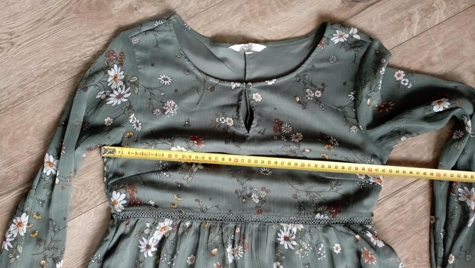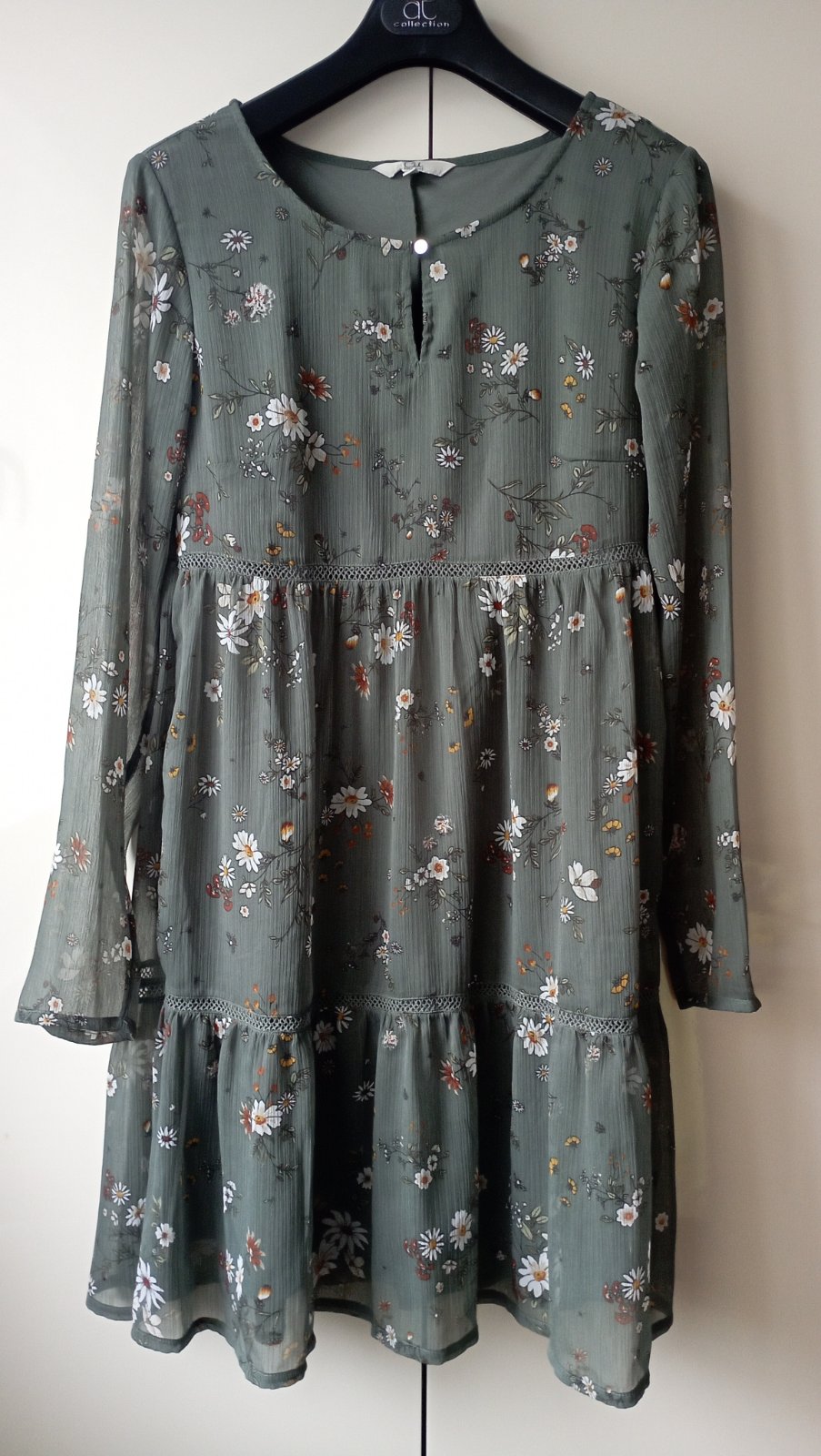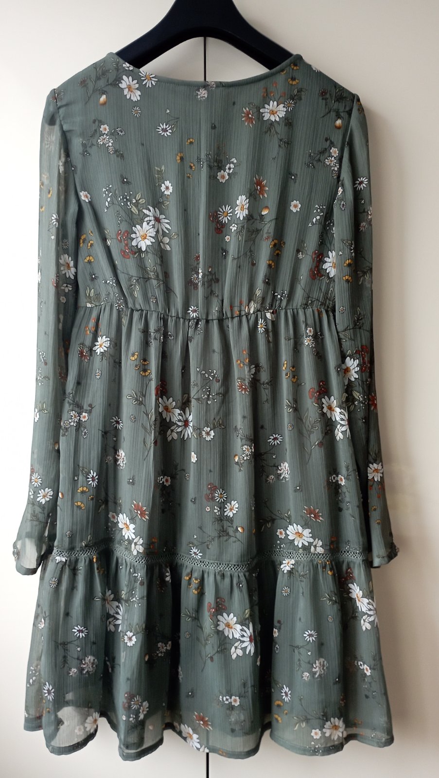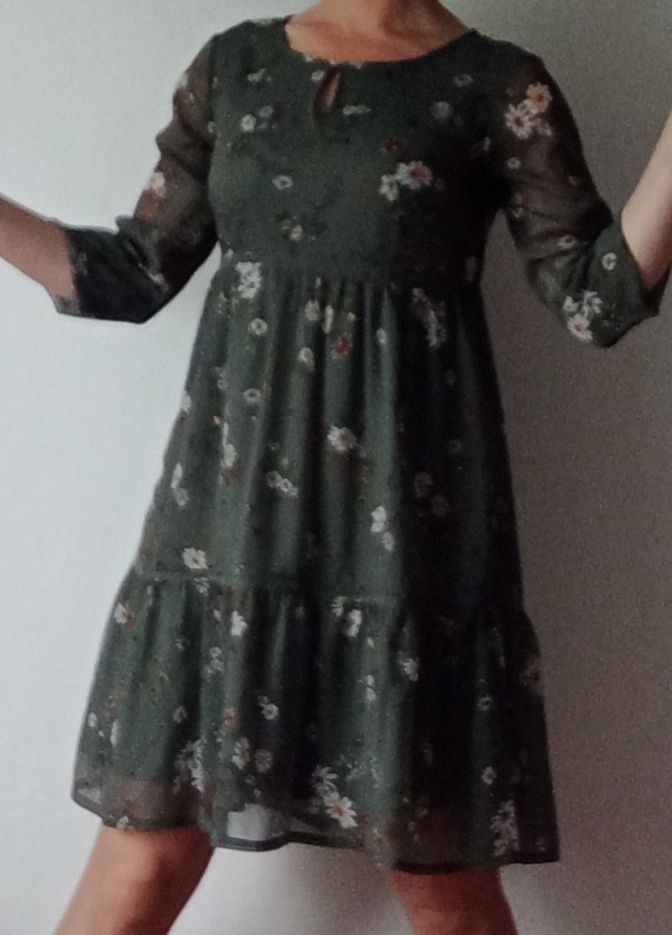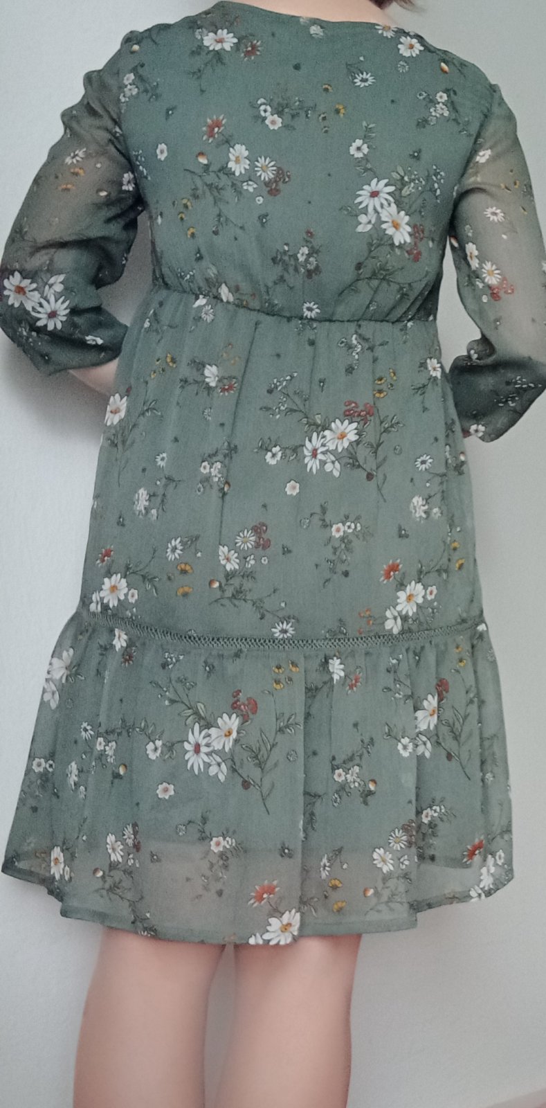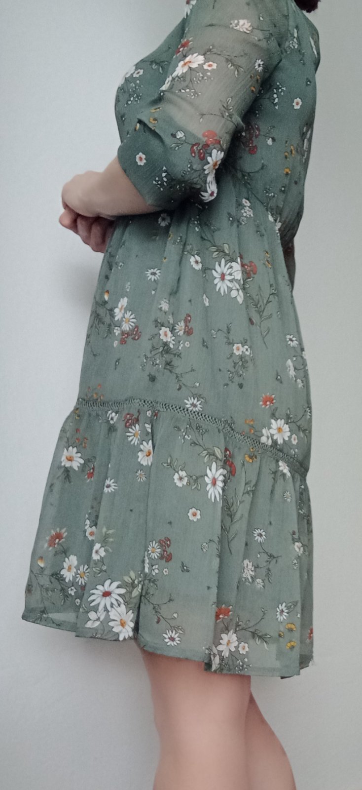 Nádherné tmavozelené šaty s kvetinovou potlačou. Výborný stav, raz oblečené, ako nové. Majú dve vrstvy (vrchná je priehľadná), rukávy sú nepodšité. Veľmi pekne ukážu oblečené (doplním foto na postave neskôr).