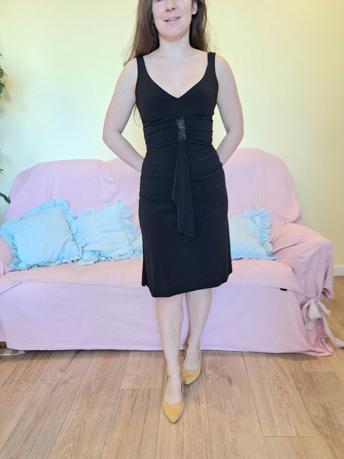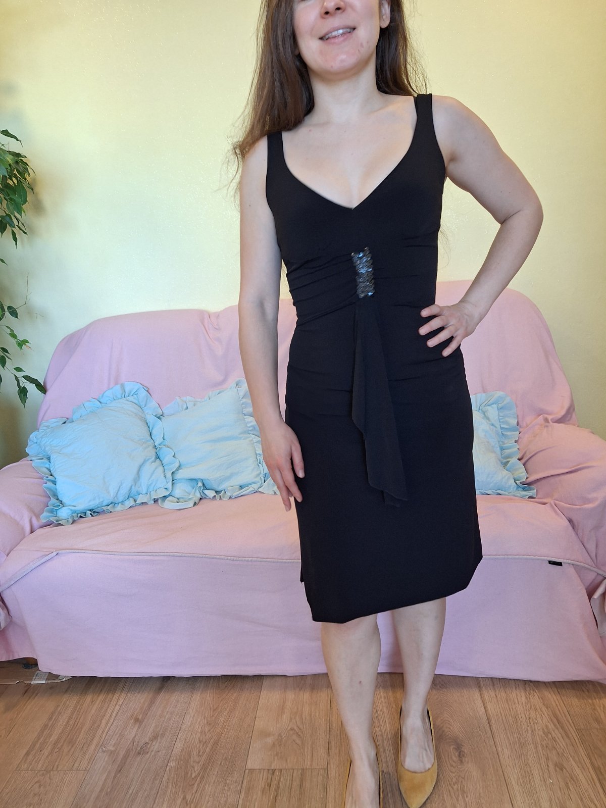 Saty ktore som mala na stuzkovej, na plese black tie optional. Beaniu. Natahovacie, velmi prijemny material, ktory sa nepokrci. Material sa natiahne 34-36 na fotke som uz 38 preto saty posuvam dalej