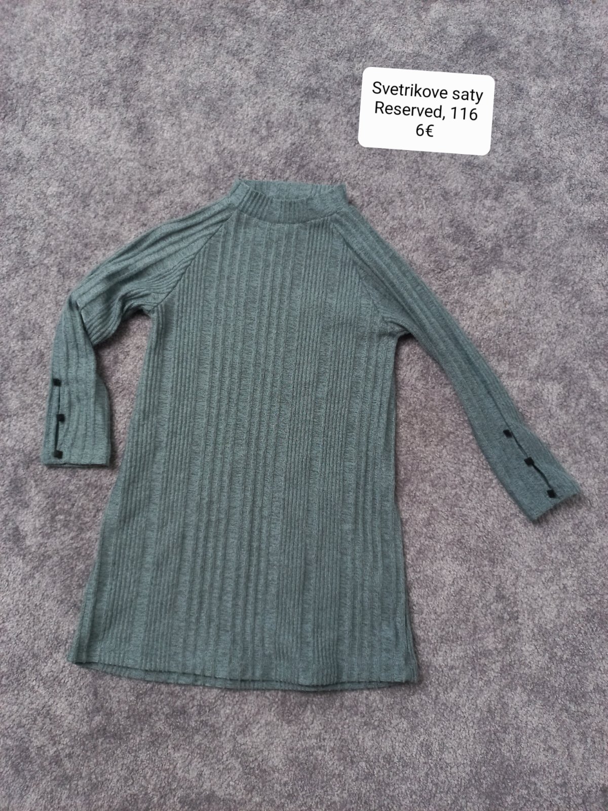 Parkrat oblecene svetrikove saty, s ozdobnymi gombikmi na rukavoch, s vyssim krkom, znacka Reserved, velkost 116, bezchybny stav.