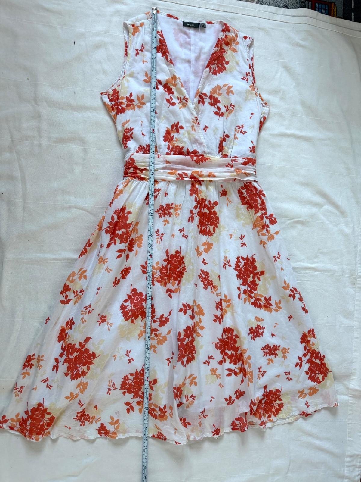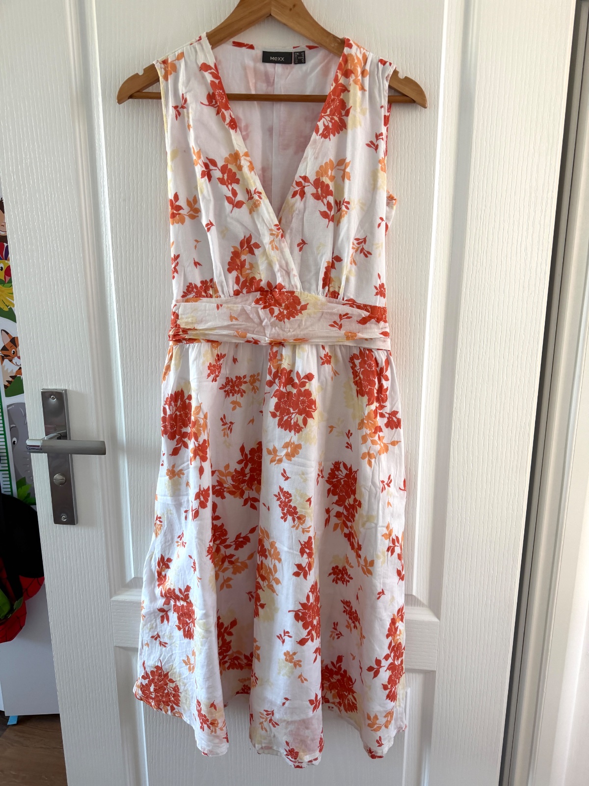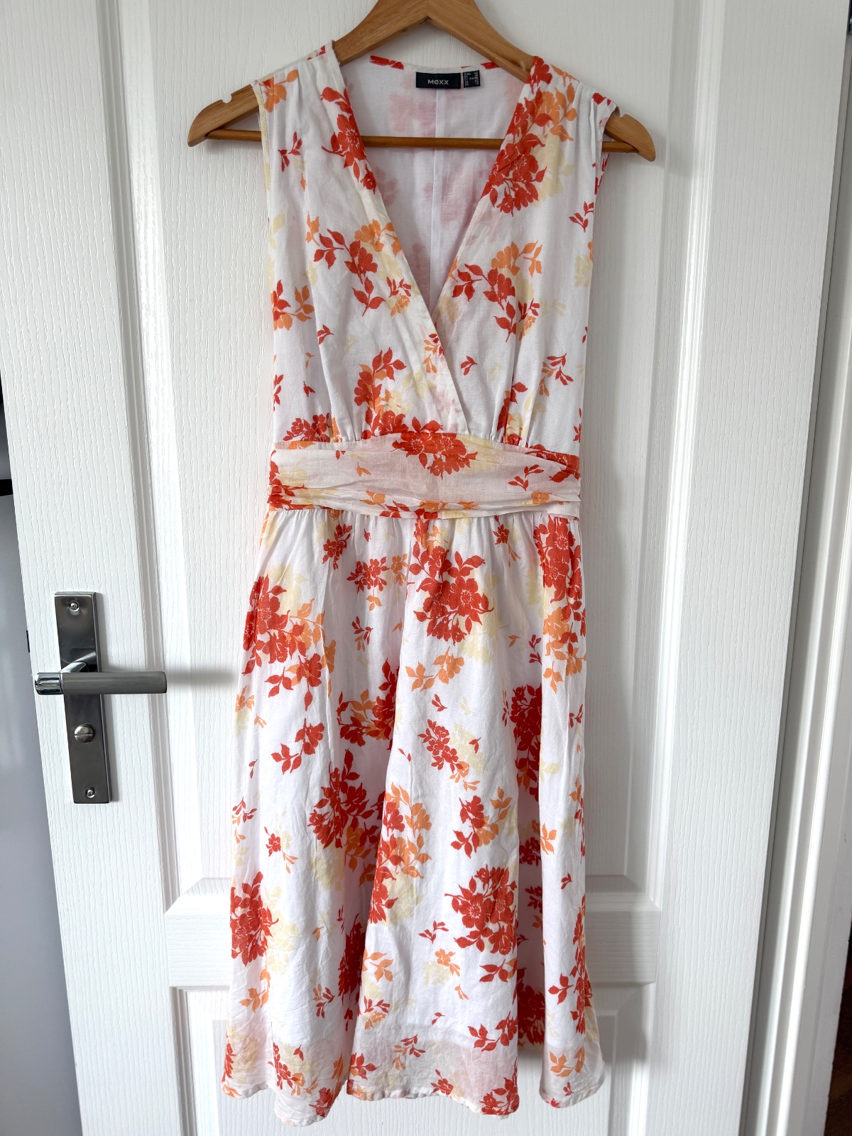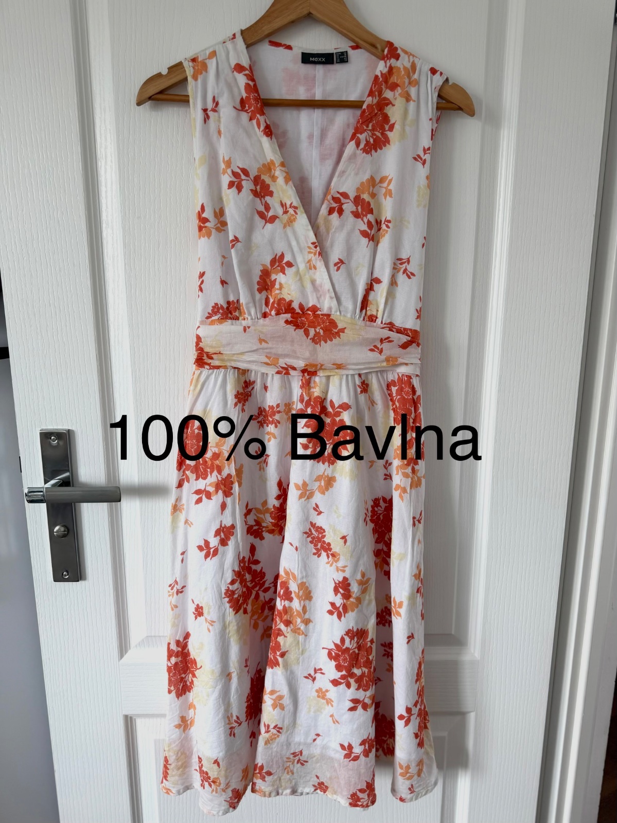 Krásne, vzdušné šaty značky Mexx, ideálne na teplé jarné a letné dni. Šaty sa vyznačujú veľmi ženským strihom a pôvabnými detailmi na chrbte. Sú bez rukávov. Vpredu majú zavinovací výstrih v tvare písmena V, ktorý krásne zvýrazňuje krk. V páse sa nachádza široký, všitý pás látky, ktorý prechádza do dlhého viazania (šerpy) vzadu. Spodná časť je mierne rozšírená. Veľmi efektné! Uzavretejší výstrih na chrbte s ozdobným radom svetlých, perleťových gombíkov, ktoré sa tiahnu pozdĺž chrbta až k línii sukne. Vonkajšia vrstva: 100% bavlna – ideálne priedušná na leto. Podšívka (len v sukňovej časti): 60% bavlna, 40% polyester. Podšívka zabraňuje presvitaniu materiálu. Veľkosť na štítku je 42, všetky rozmery sú na fotkách. Šaty pôsobia veľmi sviežo a elegantne, skvele sa hodia ako na každodenné nosenie, tak aj na letné oslavy.