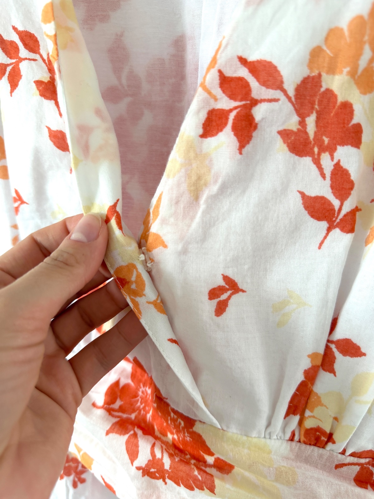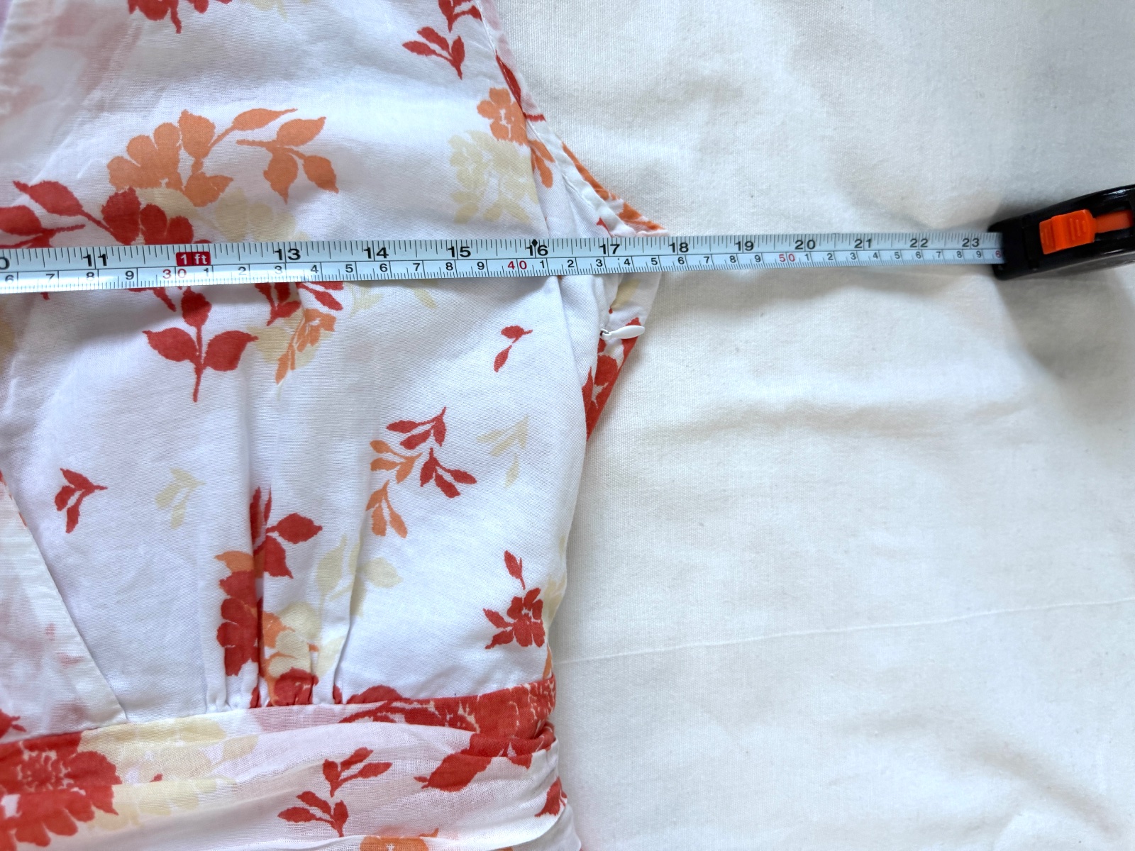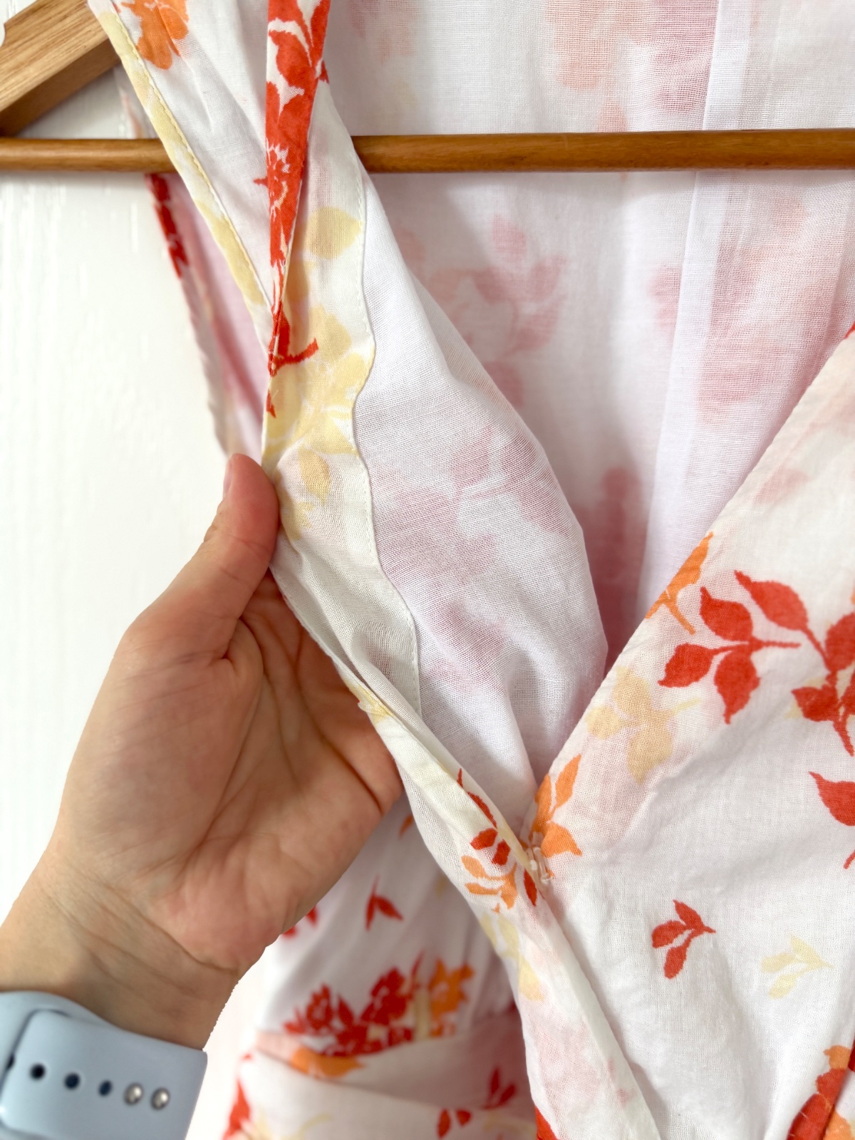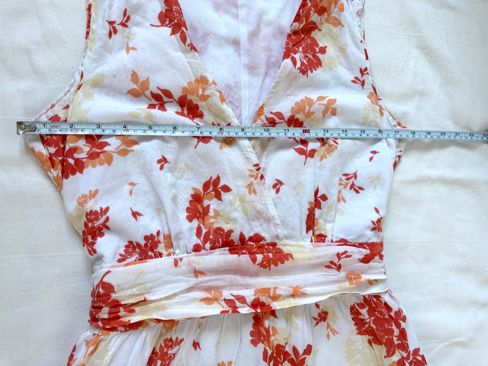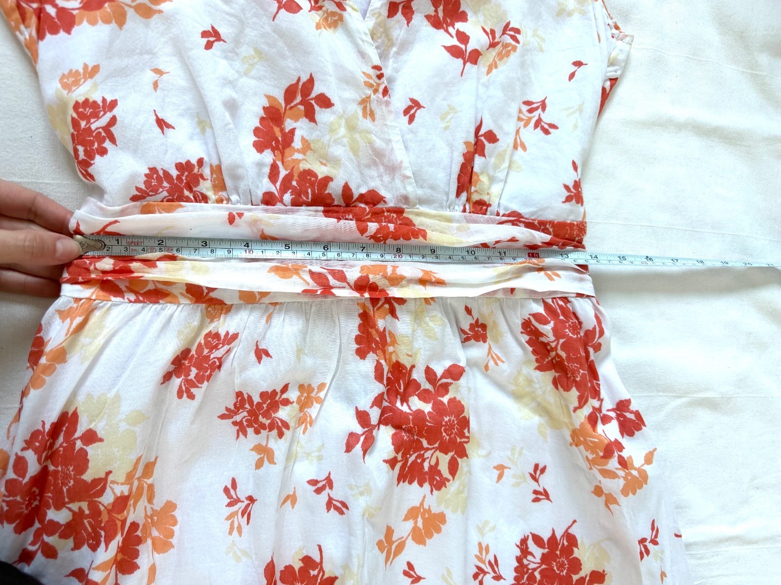 Krásne, vzdušné šaty značky Mexx, ideálne na teplé jarné a letné dni. Šaty sa vyznačujú veľmi ženským strihom a pôvabnými detailmi na chrbte. Sú bez rukávov. Vpredu majú zavinovací výstrih v tvare písmena V, ktorý krásne zvýrazňuje krk. V páse sa nachádza široký, všitý pás látky, ktorý prechádza do dlhého viazania (šerpy) vzadu. Spodná časť je mierne rozšírená. Veľmi efektné! Uzavretejší výstrih na chrbte s ozdobným radom svetlých, perleťových gombíkov, ktoré sa tiahnu pozdĺž chrbta až k línii sukne. Vonkajšia vrstva: 100% bavlna – ideálne priedušná na leto. Podšívka (len v sukňovej časti): 60% bavlna, 40% polyester. Podšívka zabraňuje presvitaniu materiálu. Veľkosť na štítku je 42, všetky rozmery sú na fotkách. Šaty pôsobia veľmi sviežo a elegantne, skvele sa hodia ako na každodenné nosenie, tak aj na letné oslavy.