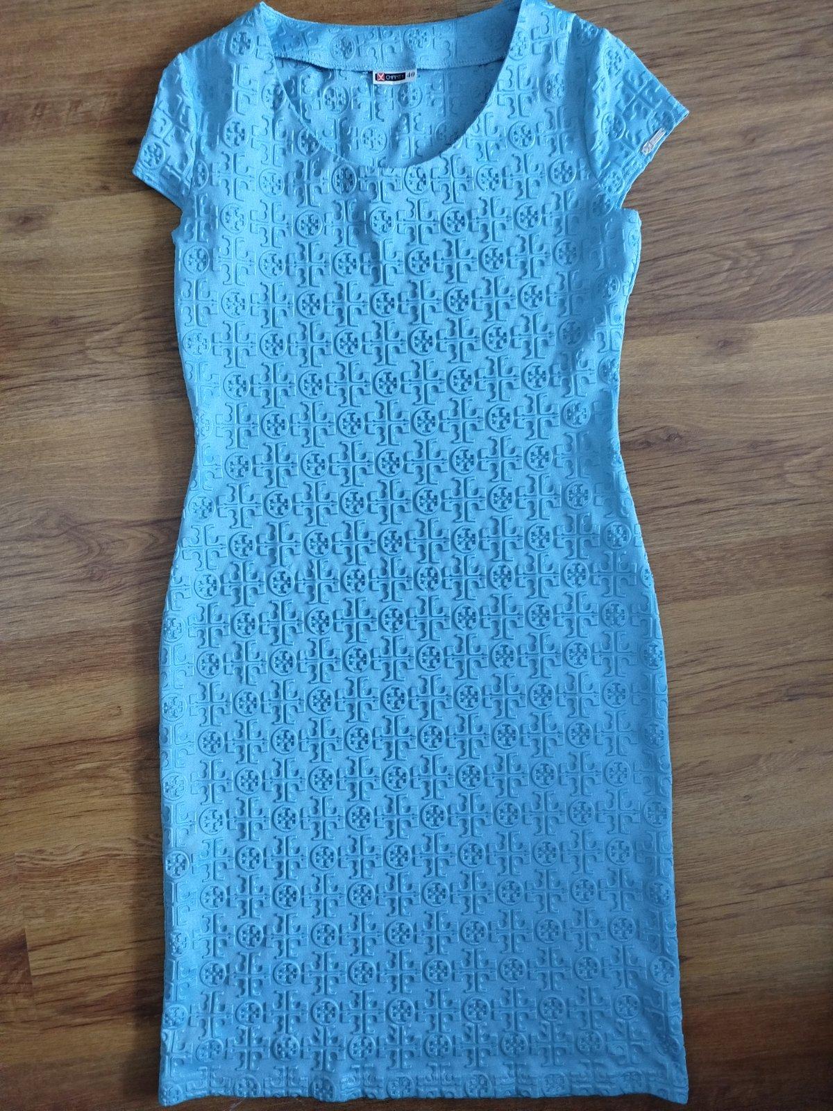 veľkosť M/L, dvarazy oblečené. dlzka siat je od pleca cca 96 cm, sirka cez prsia je cca 47, cez pas merala som 15 cm pod prsiami cca 39,5 a boky merala som 30 cm pod prsiami cca 43