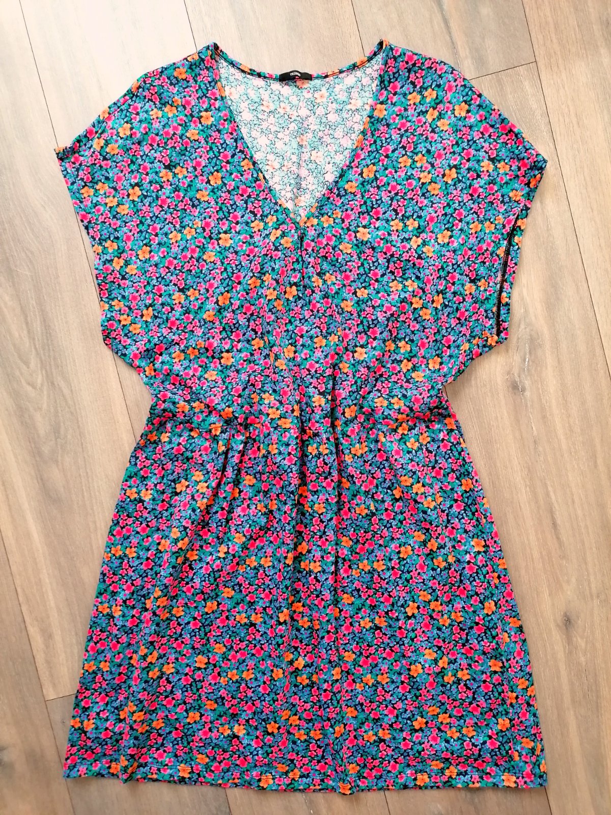 Pekne letné šaty, voľný strih, vhodné aj na plavky, rukávy majú taký širší otvor. Sú to vlastne ružové, modré a oranžové kvietky. Výstrih som zasila trosku vyššie, lebo bol príliš hlboký, dá sa jednoducho odstrihnúť nitka preč. Veľkosť som nenasla uvedenú, sedia na M aj L. Dĺžka 90 cm, šírka v prsiach 48 cm. Pár x oblečené.