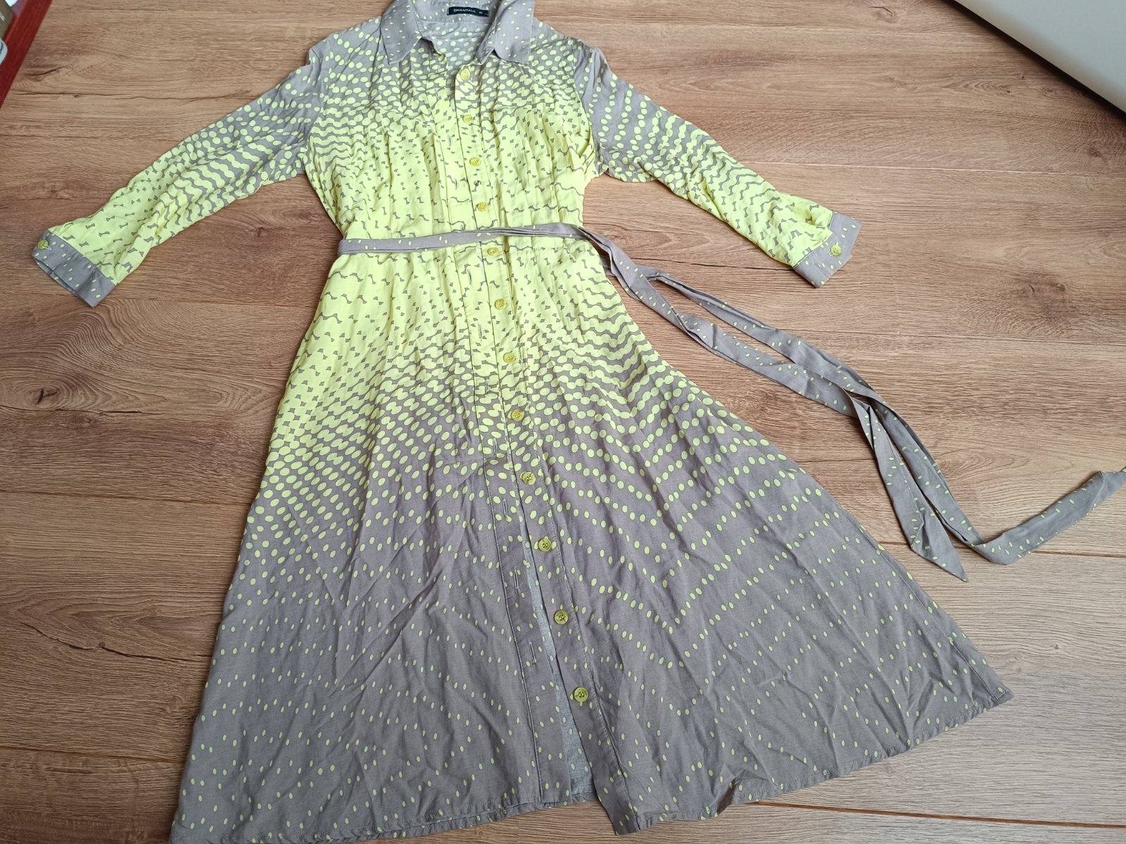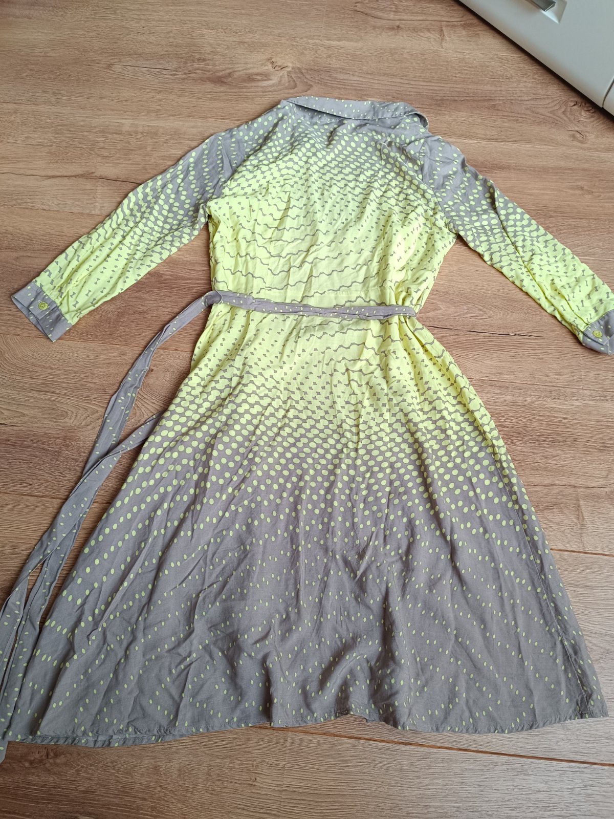 Par krat oblecene lahke koselove saty s dlhym rukavom, v zlto hnedej farbe, so zapinanim na gombiky a cvocky, so snurkovym opaskom, vo velmi dobrom stave.