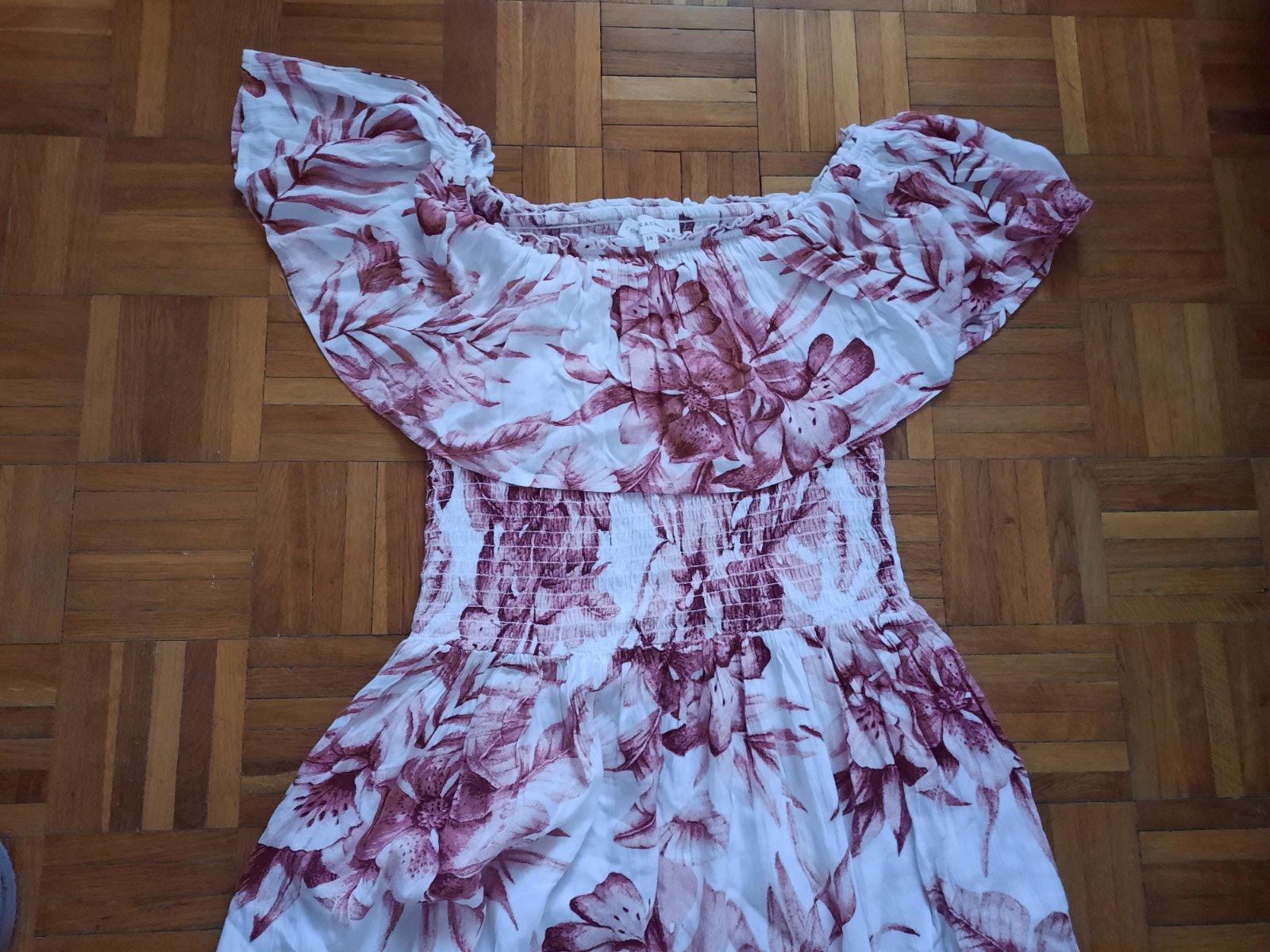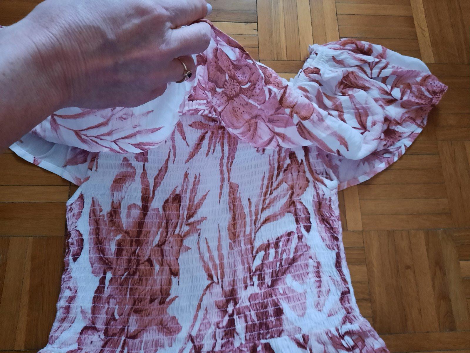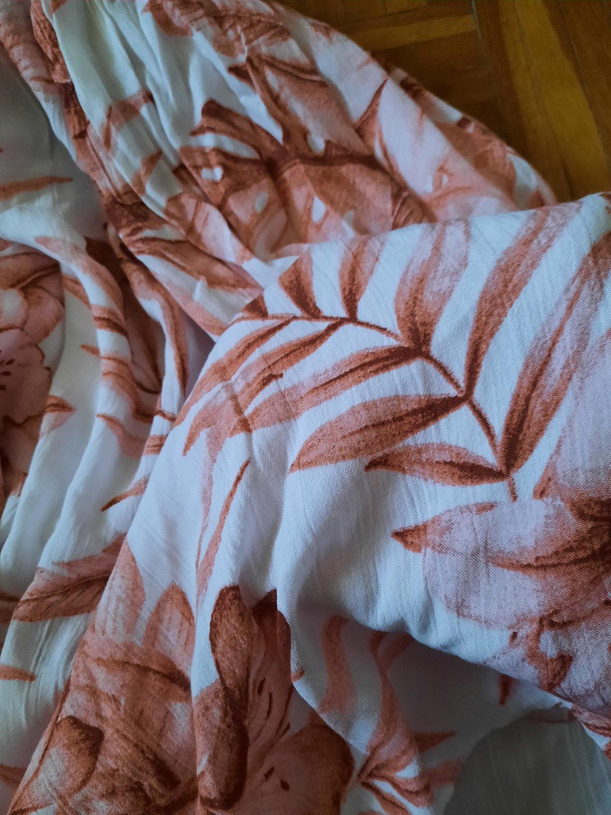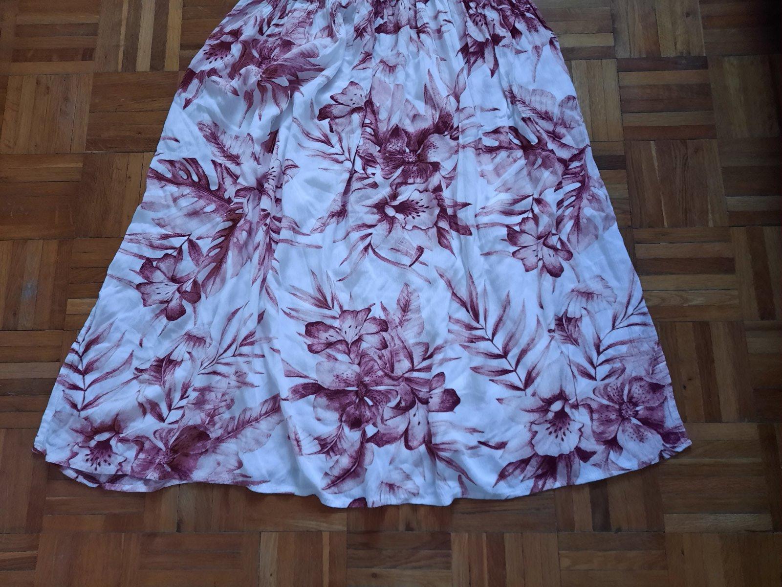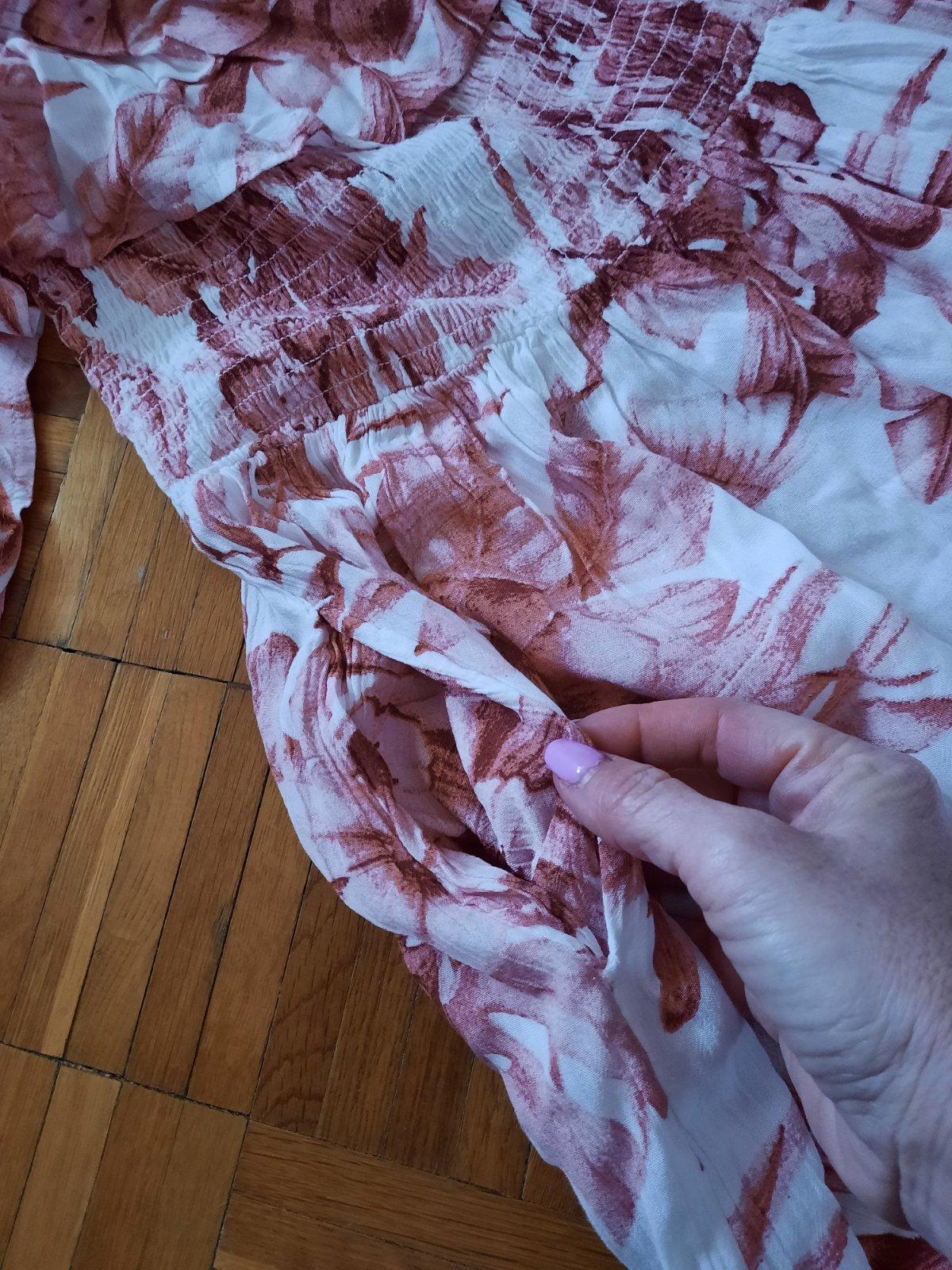 Krásne vzorované dlhé šaty s volánom okolo dekoltu. Z boku majú aj skryté vačky. Pod prsiami sú husto nariasené gumou. Z boku sú dlhšie rázporky. Dajú sa nosiť spustené na