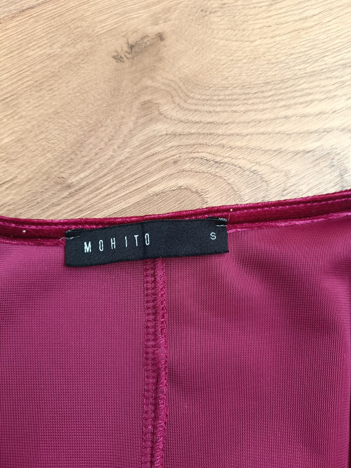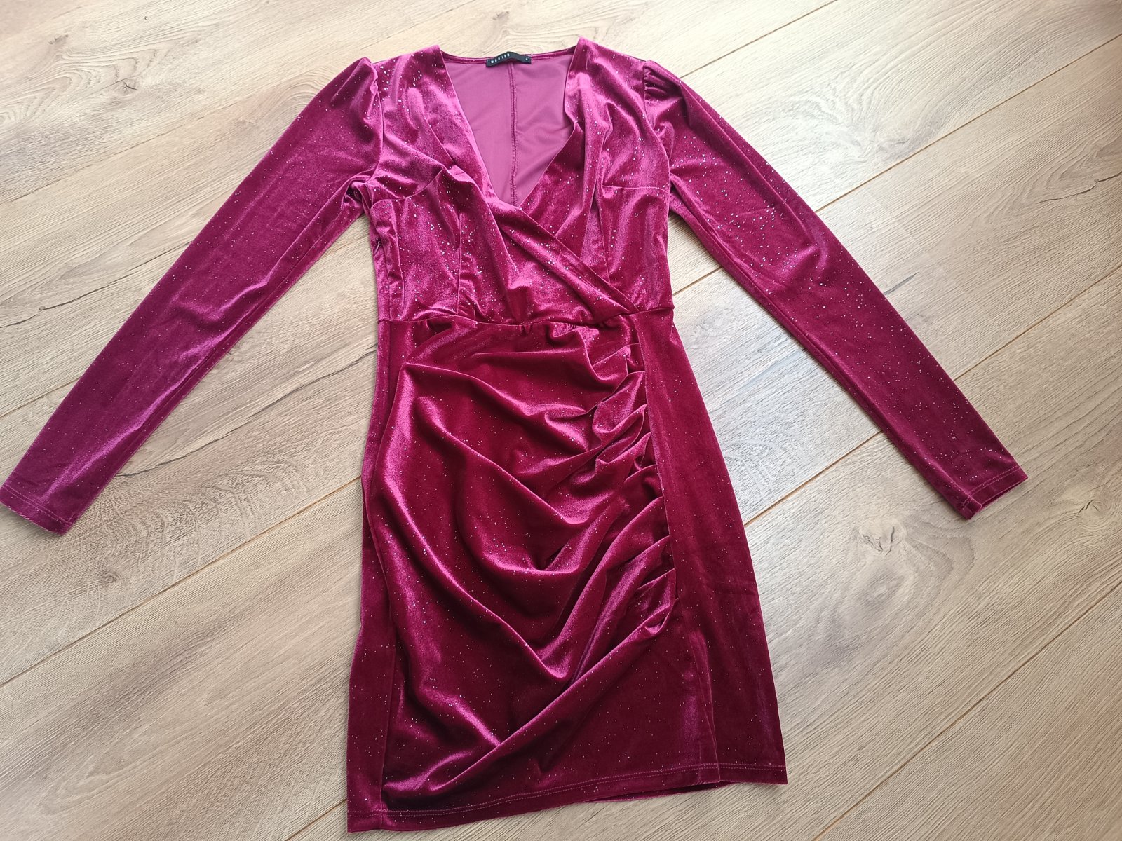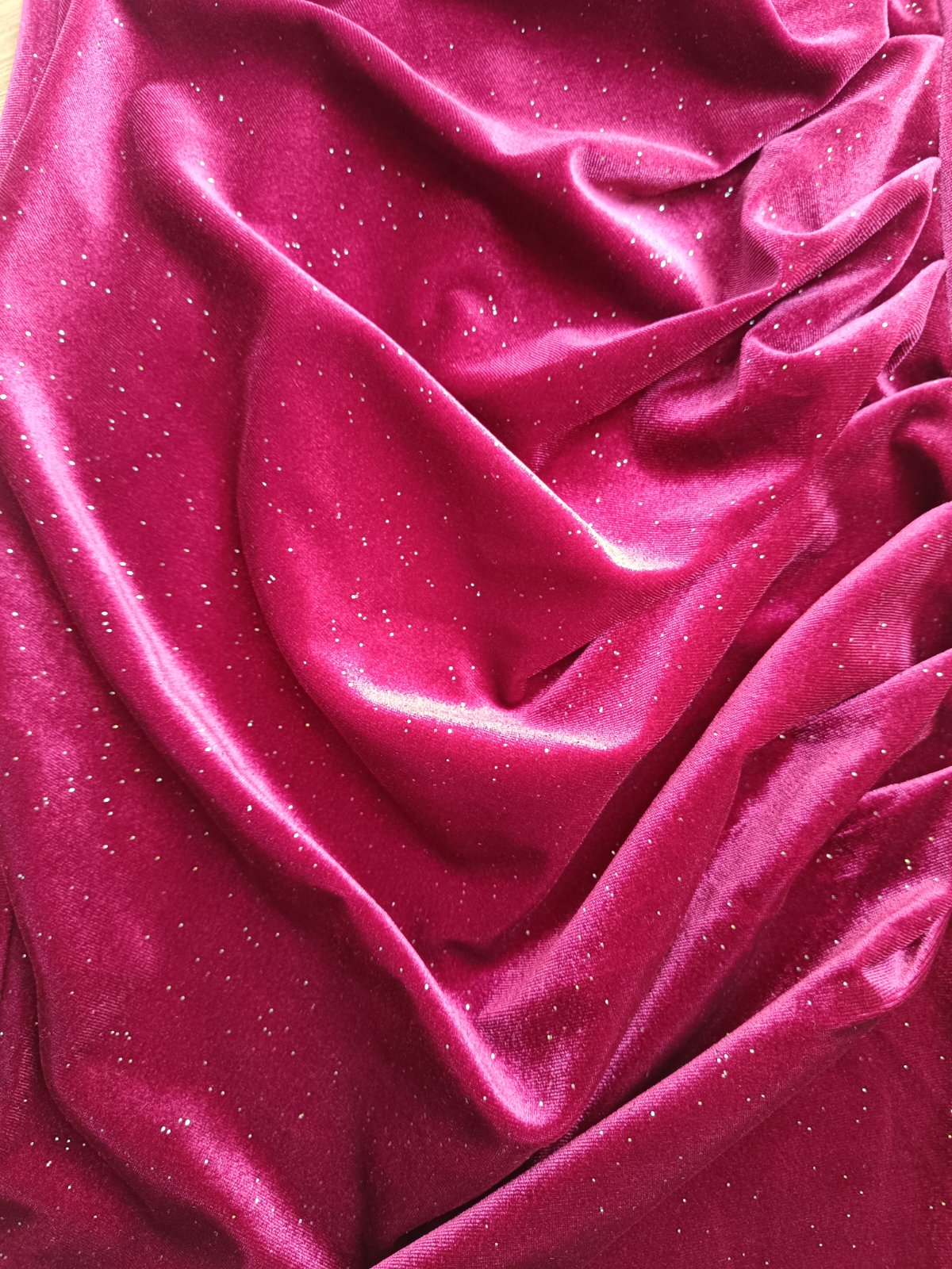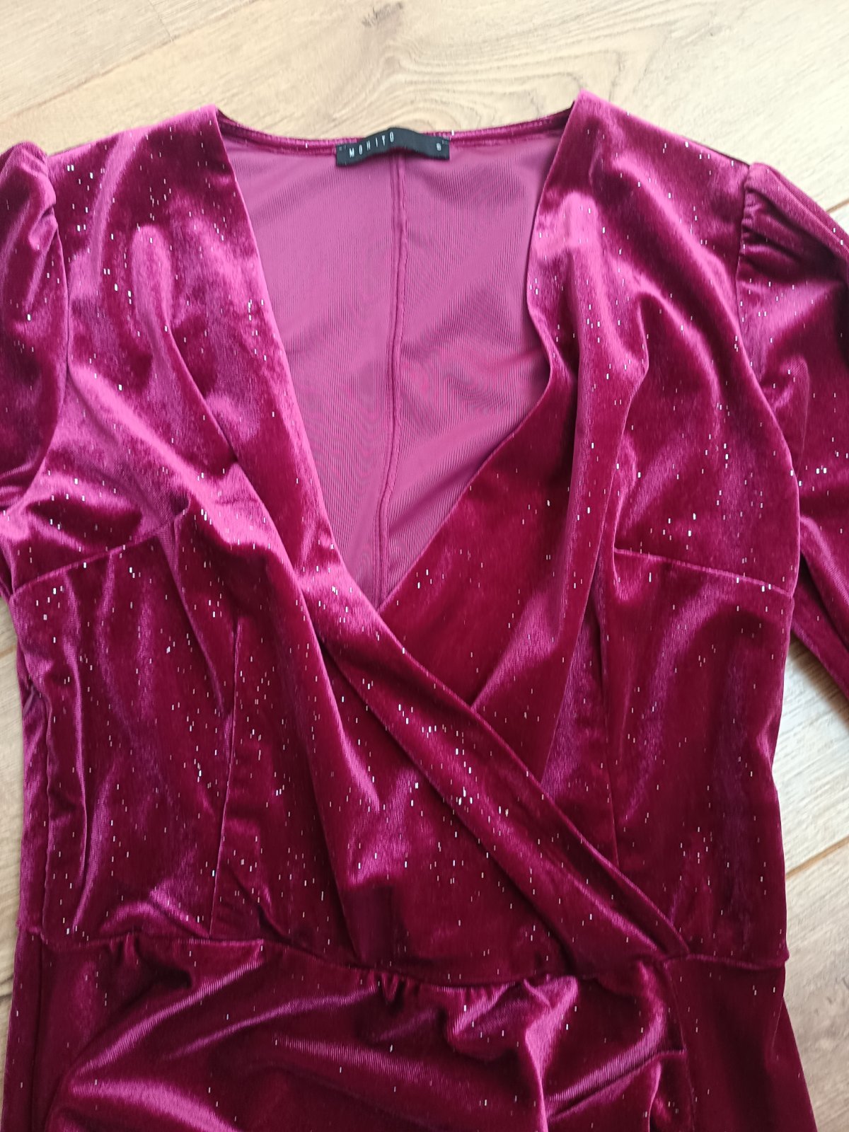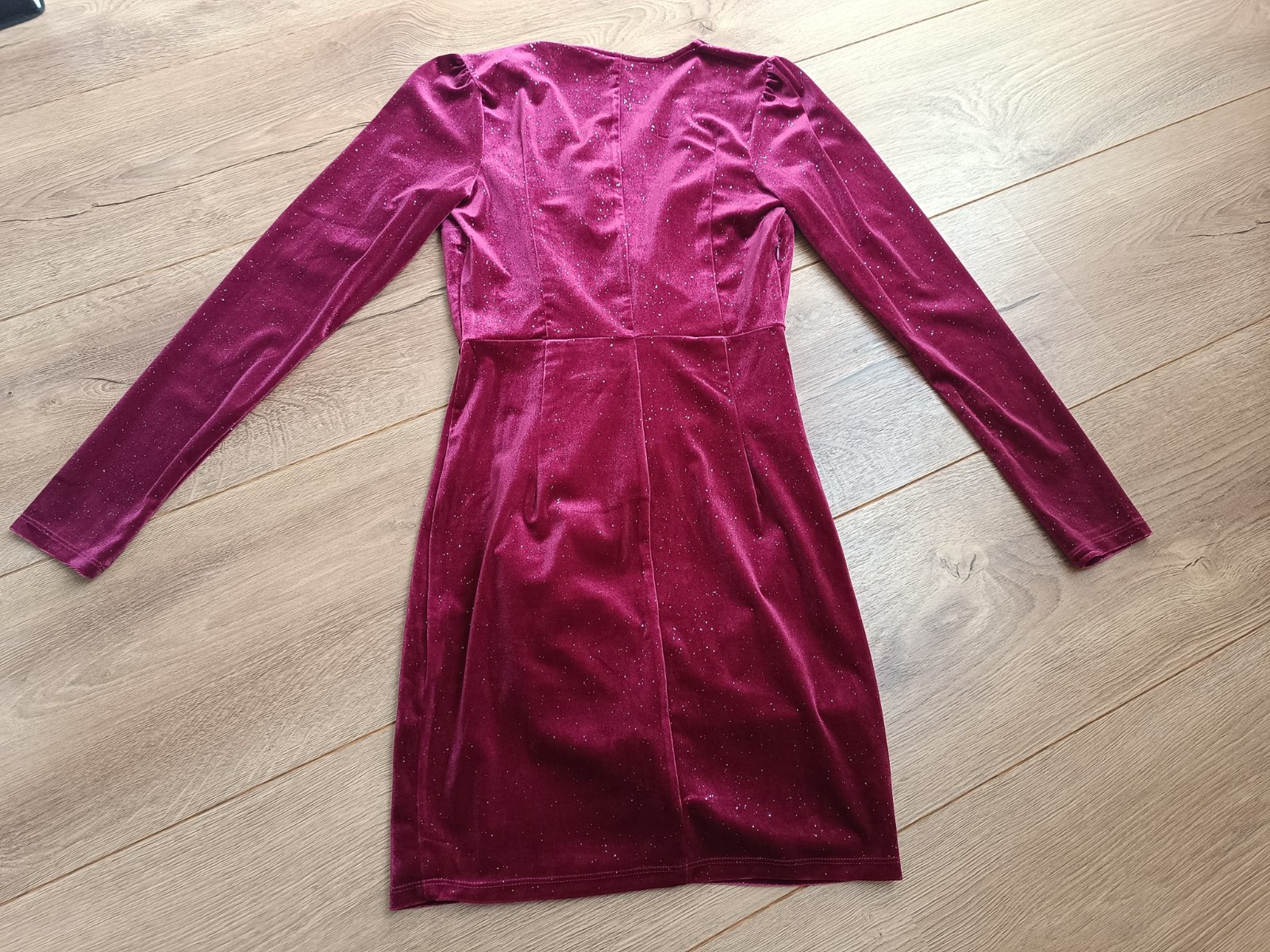 Raz oblecene, neposkodene zamatove bordove saty, s trblietkami, vacsi vystrih v tvare V, vo velmi dobrom stave.
