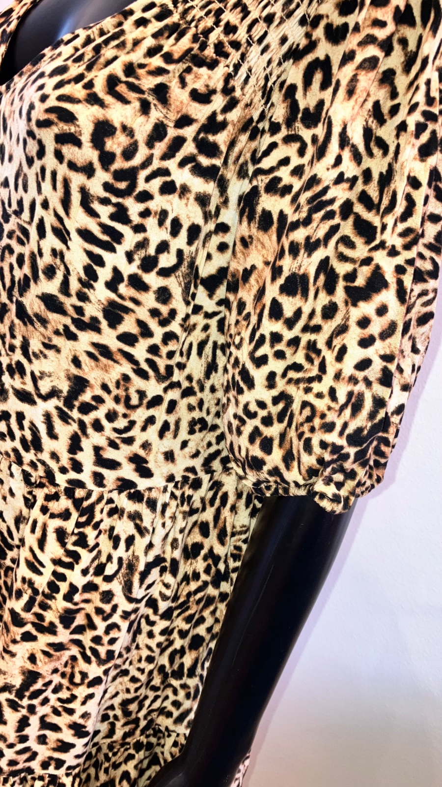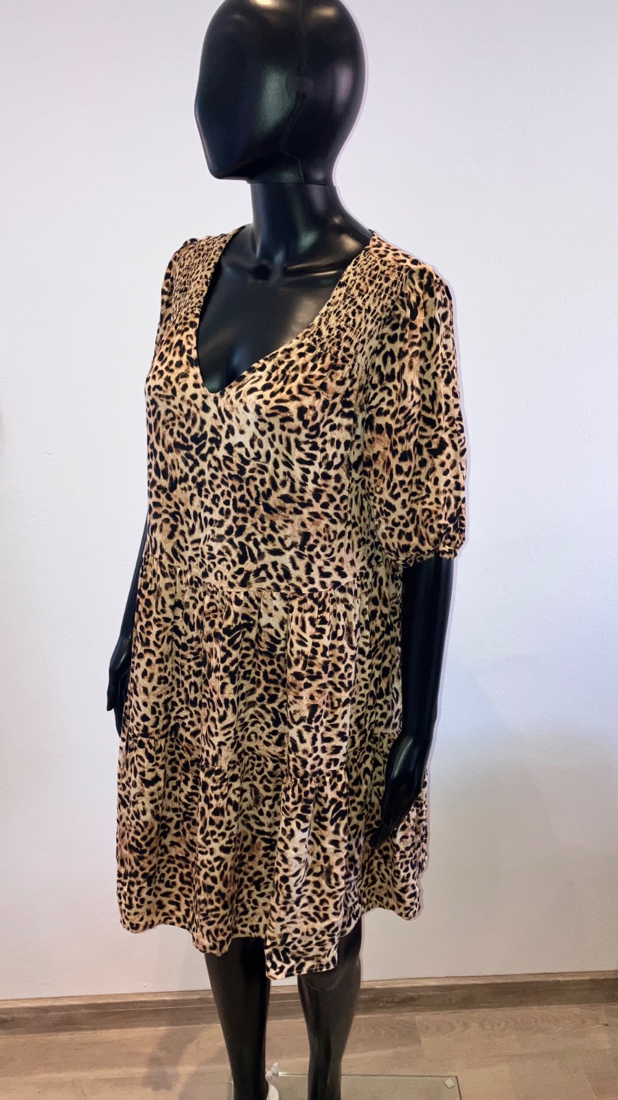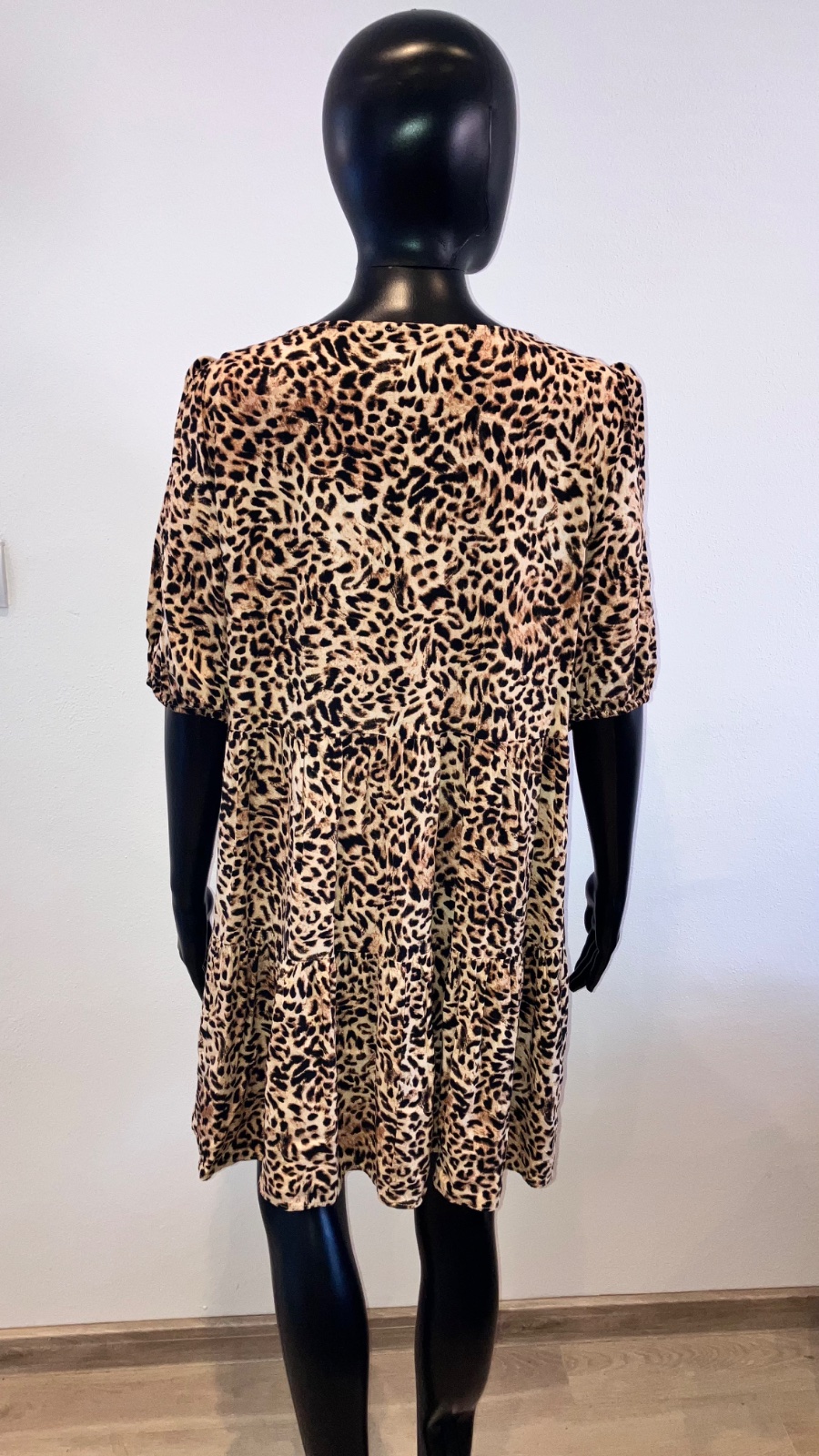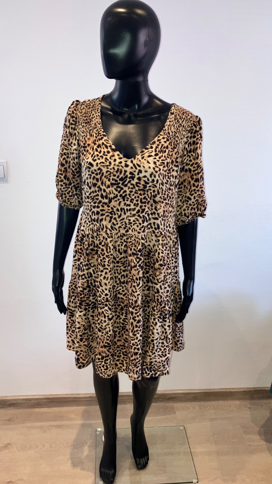 Dámske leopardie šaty s krátkym rukávom, volánmi a véčkovým výstrihom, tenké, elastické.