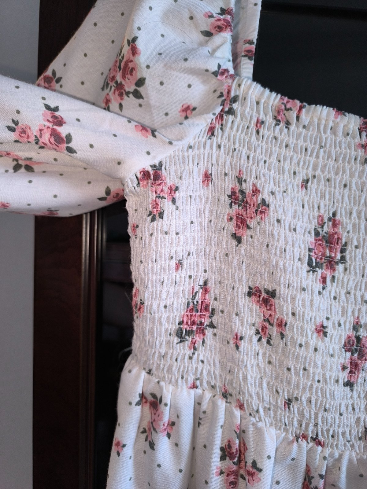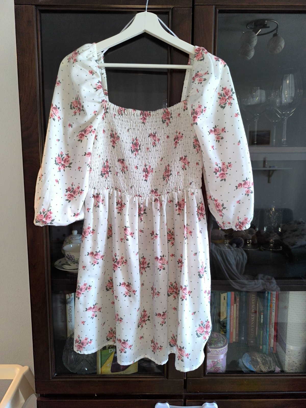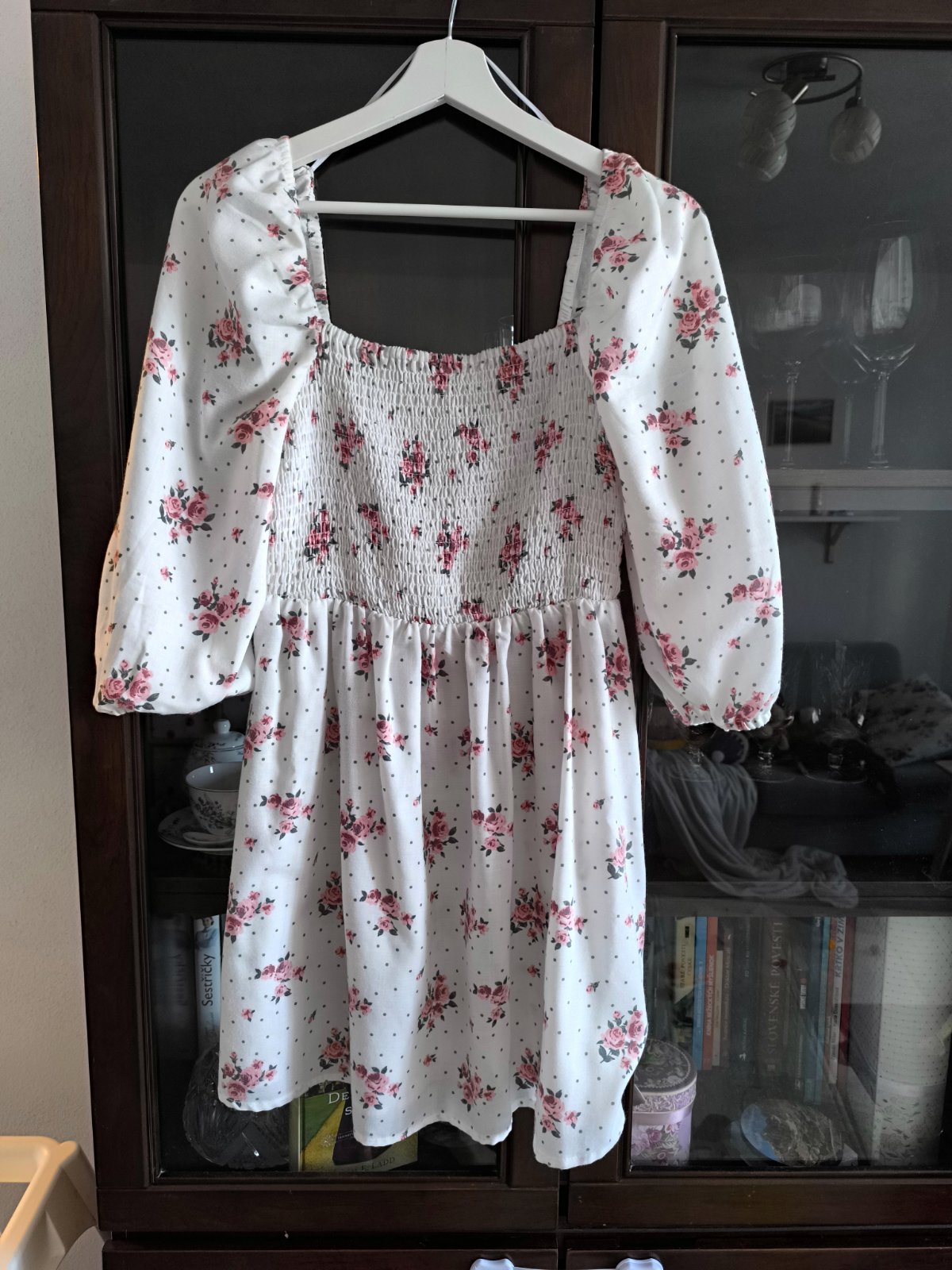 Nádherné jemné šaty, vhodné ako spoločenské, romantického strihu s jemnými malými ružičkami. Nosené minimálne, kupované v Peek&Cloppenburg pred cca 5rokmi. Ľahučká látka vhodná na horúce dni, vzdušné jemne riasené rukávy. Veľkosť S, moja výška pri foto na postave je 164cm.