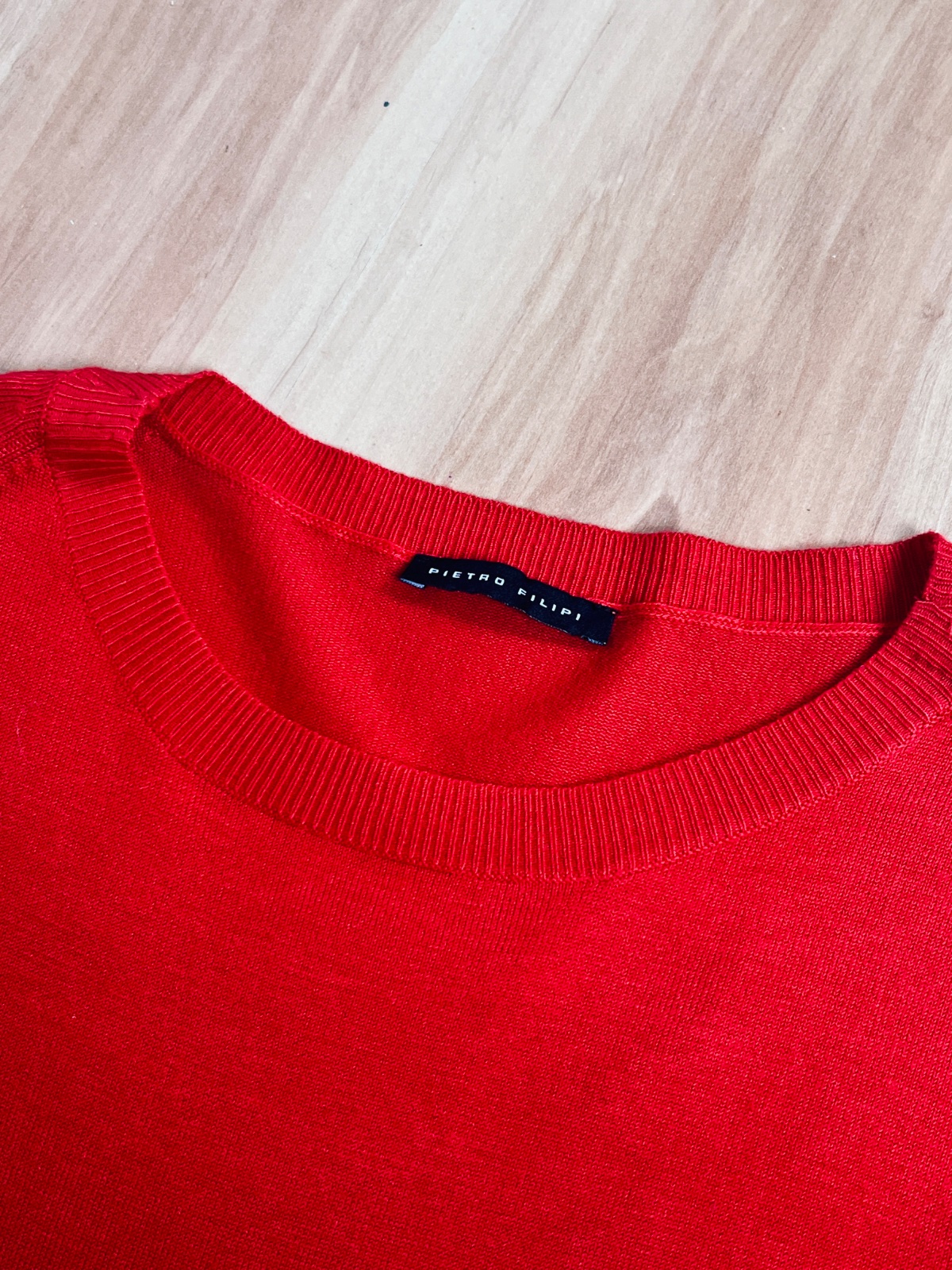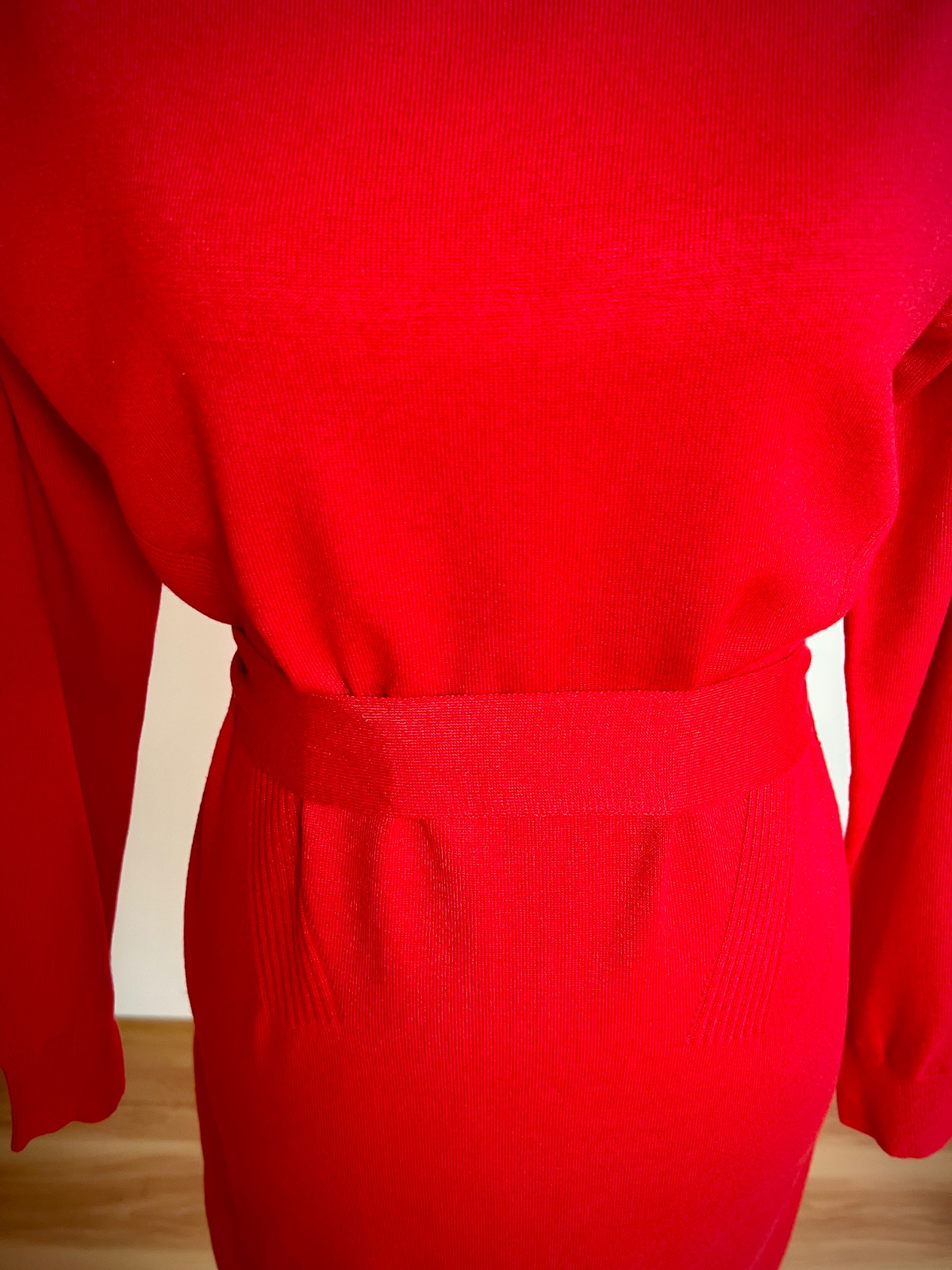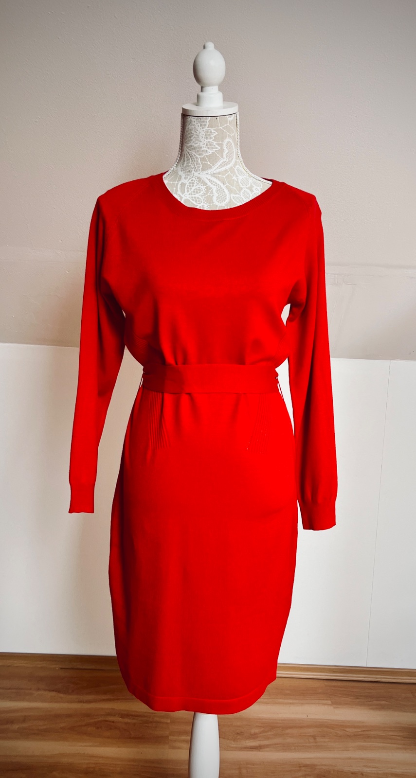 Červené teplé šaty značky Pietro Filipi. Mäkký elastický jemný materiál. V páse vyplatený vzor a pásik na zaviazanie z rovnakého materiálu. Úplne bez chyby, nenosené. Veľkosť M.
