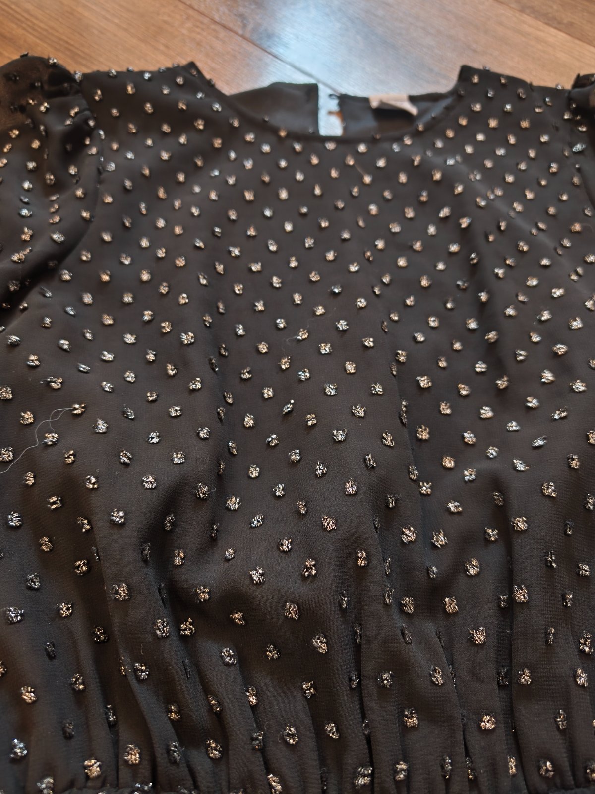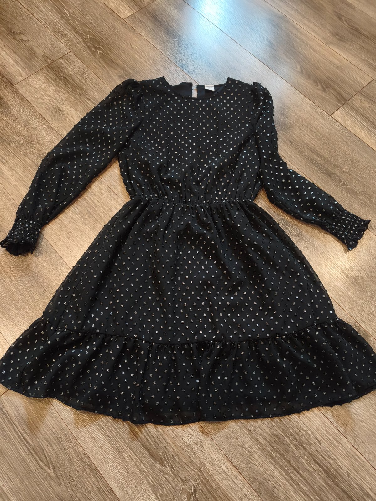 Pekné slávnostné čierne šaty z padavého tylu so zlatými hviezdičkami. Vpredu na korzete po bokoch sámiky, na spodnej časti sukne volán, rukáviky ukončené do gumičky. Dĺžka je 89 cm, šírka je 37cm,...