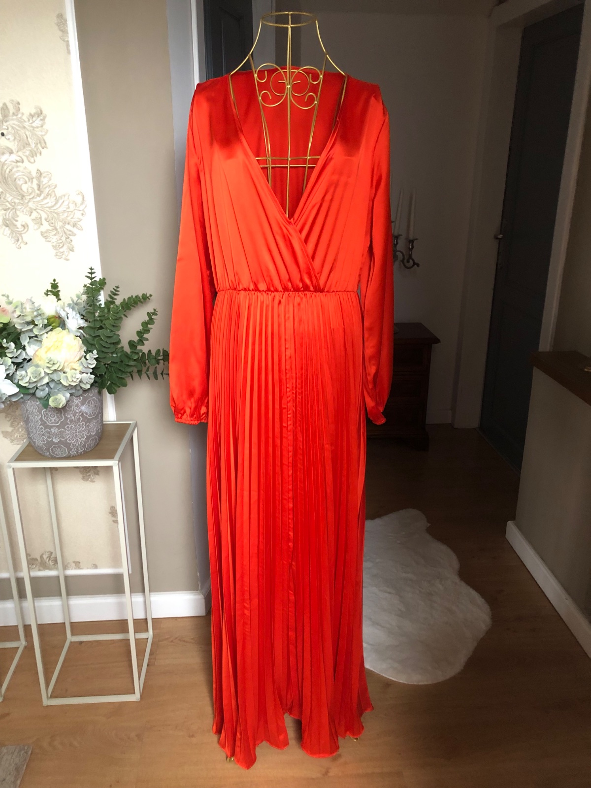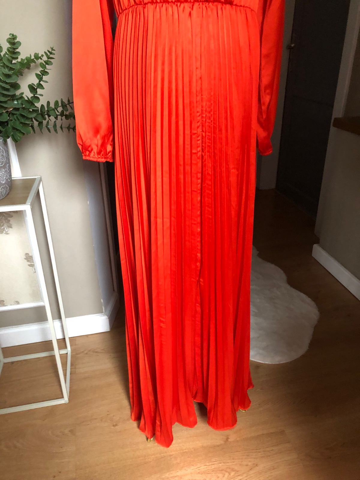 Spoločenské maxišaty červenooranžovej farby, v pase gumka, plisovaná sukňa, prekríženými výstrih, super stav.