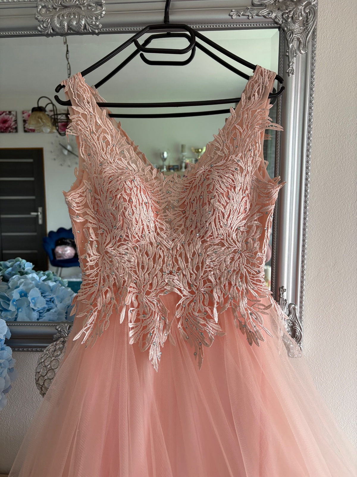 V týchto dlhých tylových šatách pritiahnete na seba všetkú pozornosť. Vrch šiat s véčkovým výstrihom vpredu aj na chrbte je zdobený precízne vyšívanou čipkou. Čipka je doplnená jemnými kamienkami a flitrami. Šaty sú na prsiach vystužené. Bohatú sukňu tvoria dve saténové vrstvy a tri vrstvy tylu. Zapínanie na chrbte pomocou zipsu. Raz použité, vyčistené, bez chýb. Sedia skôr ako M/38.