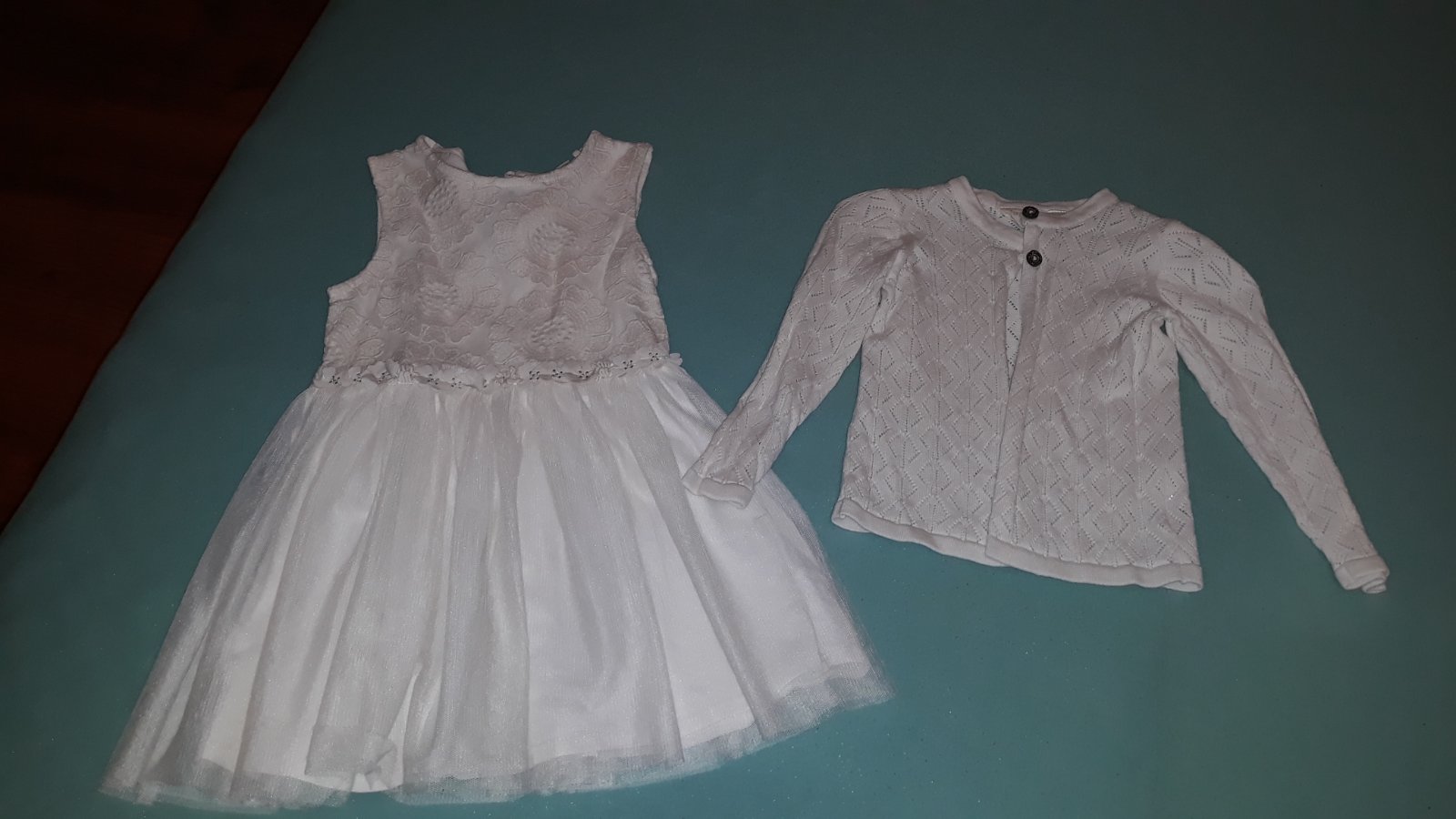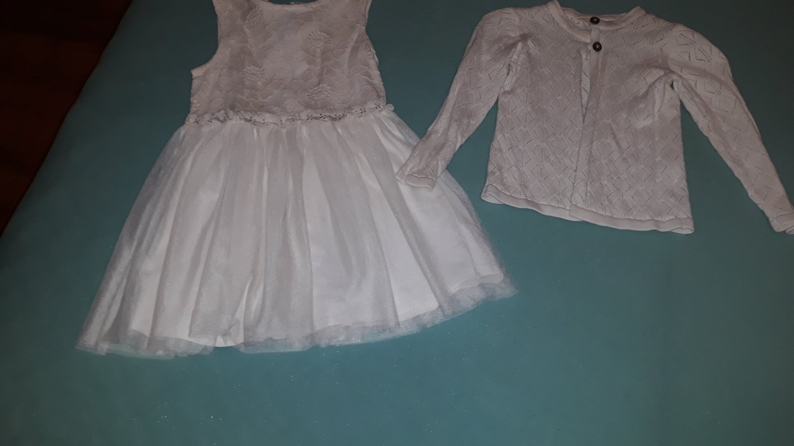 Krasne šatičky s čipkou a tilovou sukničkou. Velkosť 104. Su vo veľmi dobrom stave. Svetrik je ako bonus zadarmo.