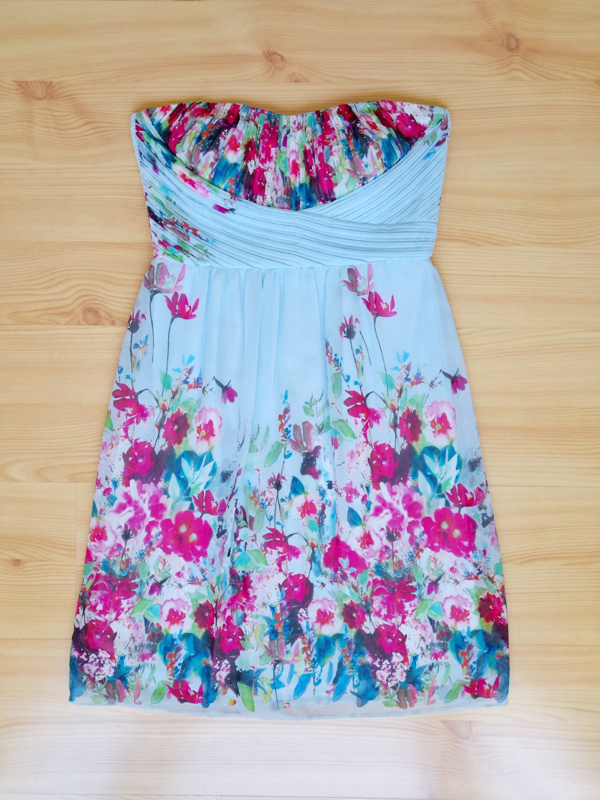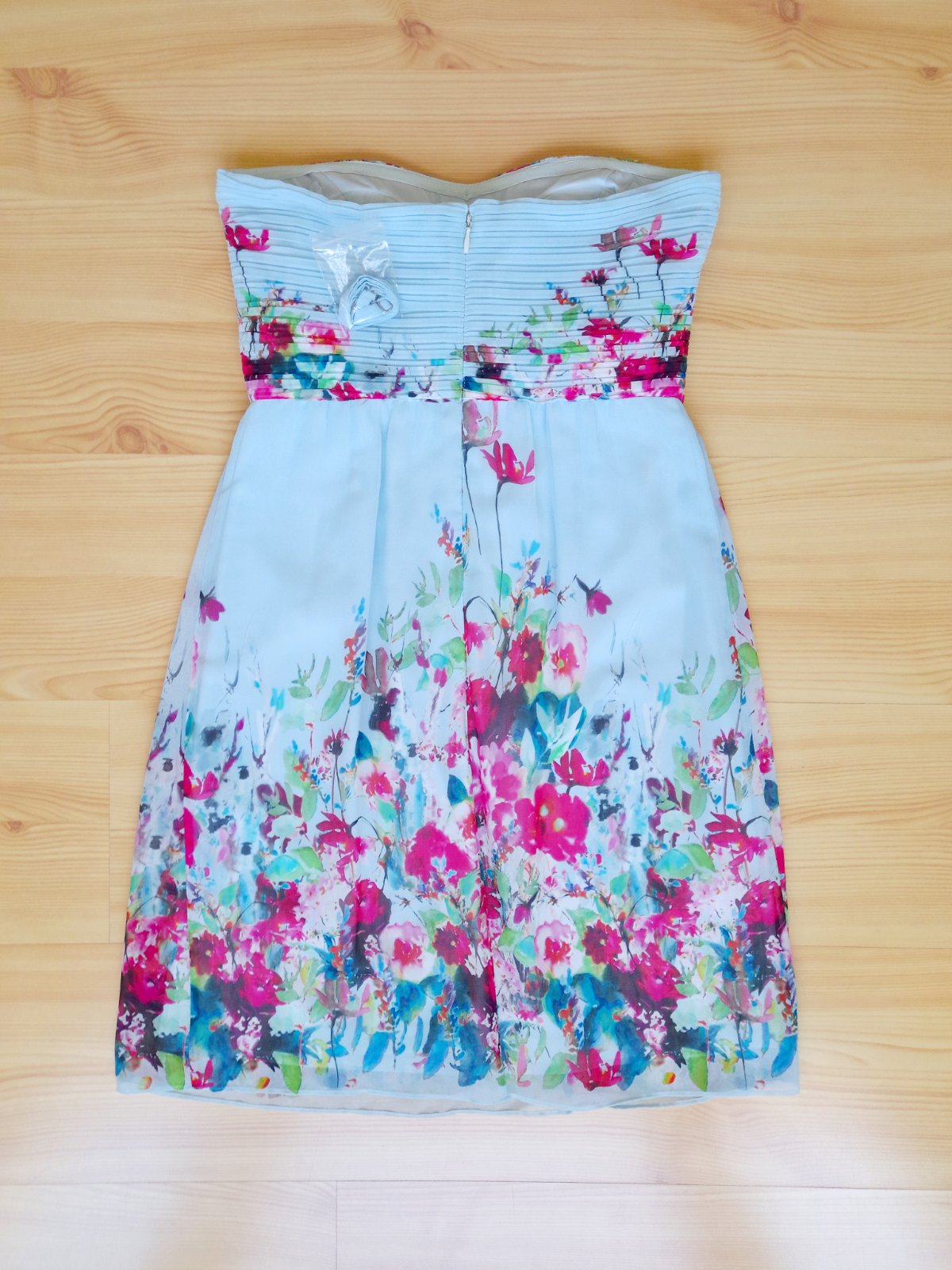 Farba svetlomodrá so vzorom farebných kvetov, živôtik má všité košíčky, šaty sú podšité a priložené sú odopínateľné nastaviteľné tenké ramienka. Vzadu je dostatočne dlhý skrytý zips.