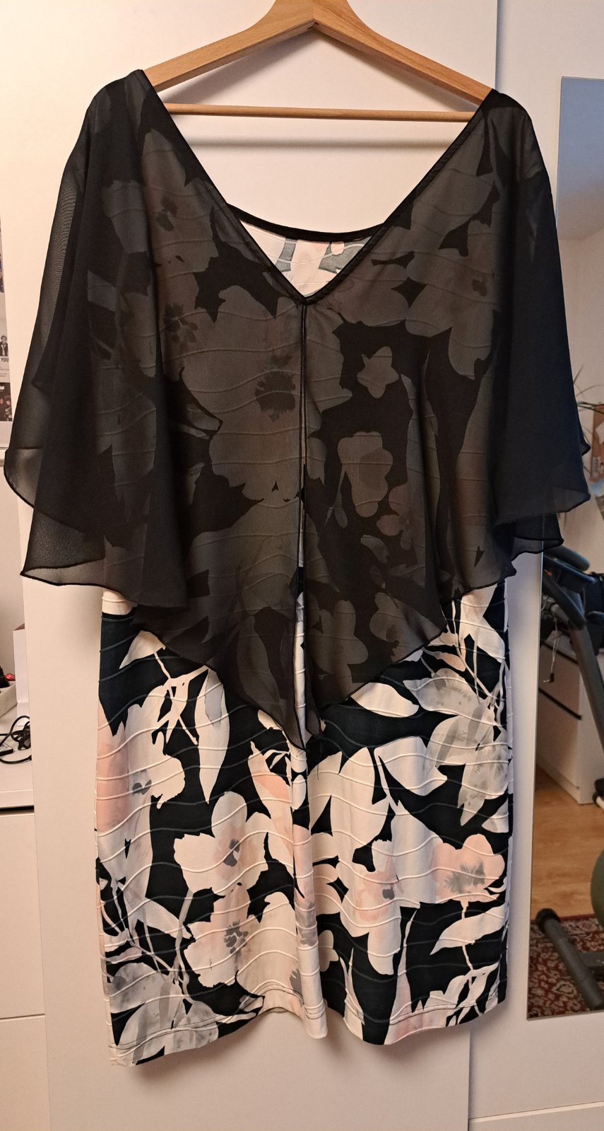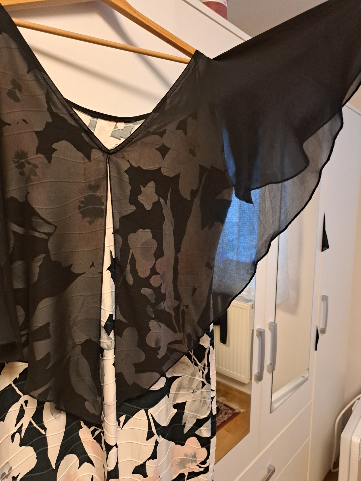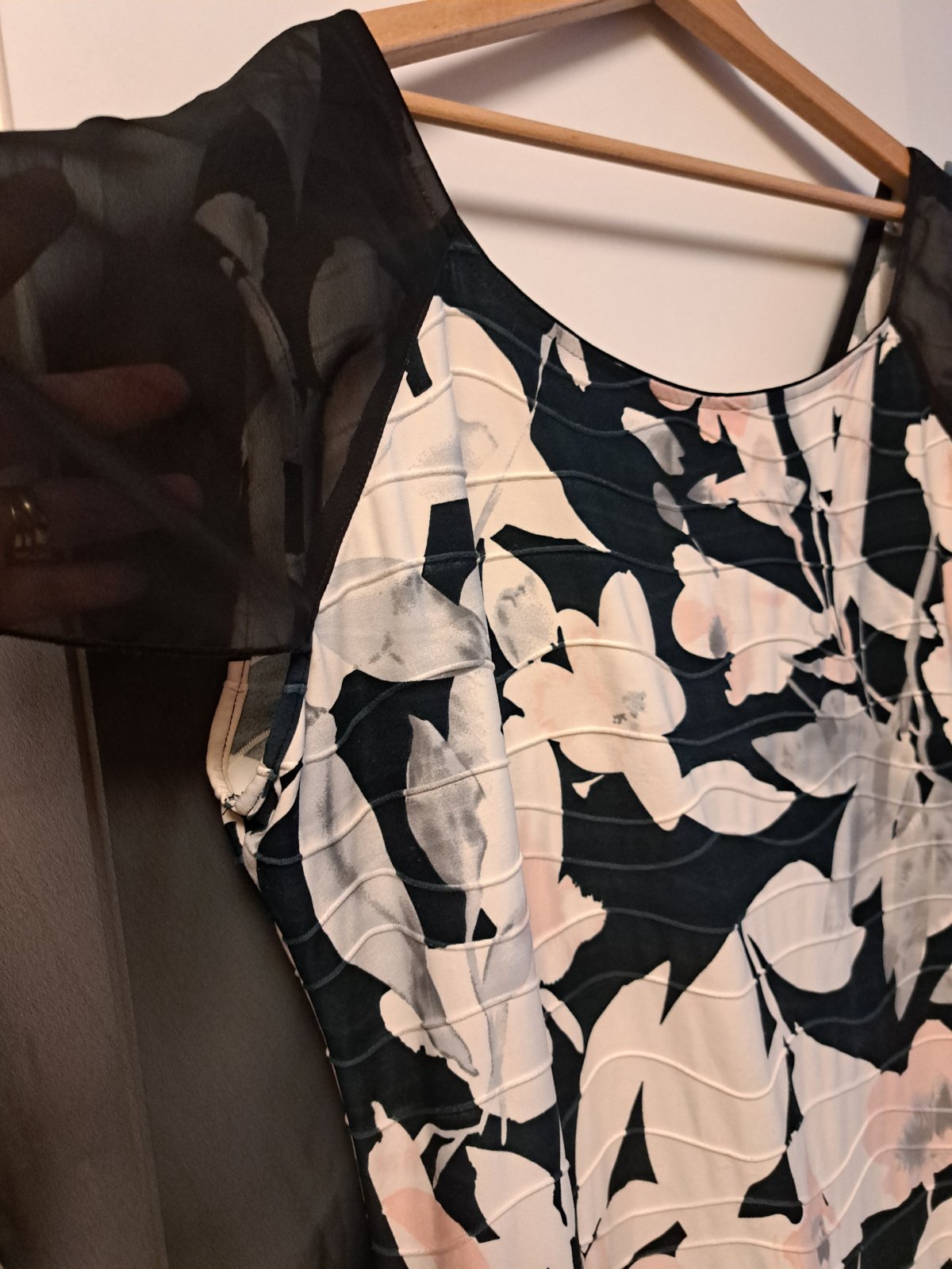 Spoločenské šaty 1x oblečené na oslave bez poškodení bez fľakov 100% stav príjemný elastický materiál ( veľkosť 50 sadne aj 48) vrchný materiál na rukávoch tyl voľne prišitý (prikrýva ramená)