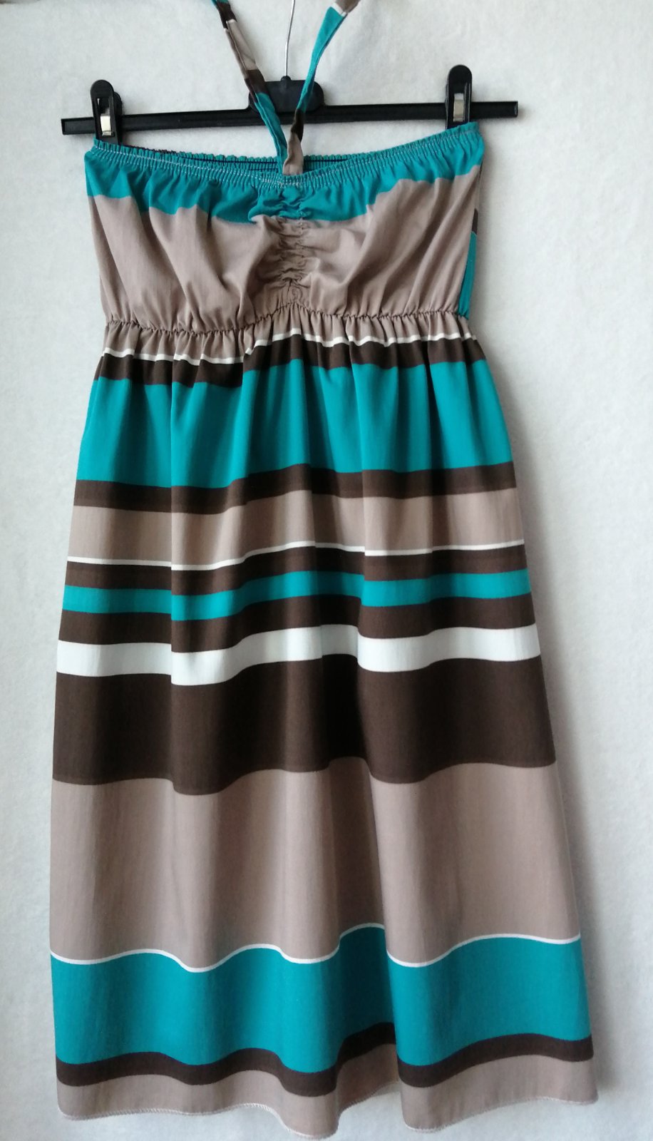 Pekné pohodlné l šaty, veľkosť 38 alebo M. Príjemný kvalitný materiál. Viazanie okolo krku. Šaty sú v top stave ako nové - 1 x oblečené a oprané.