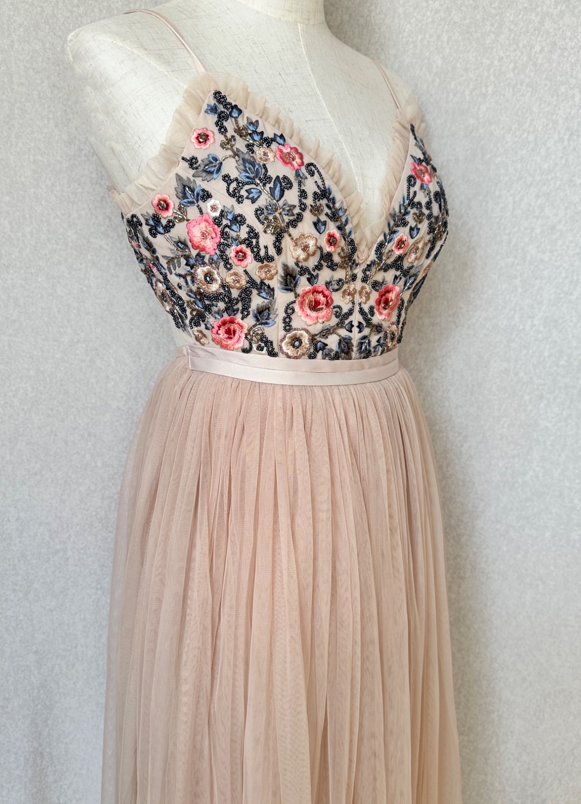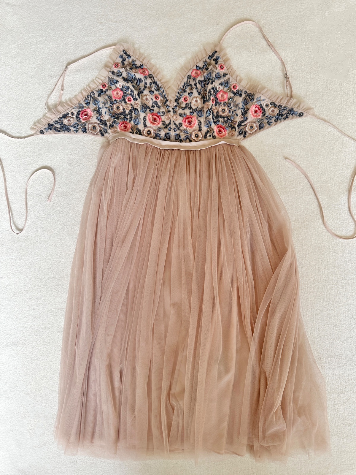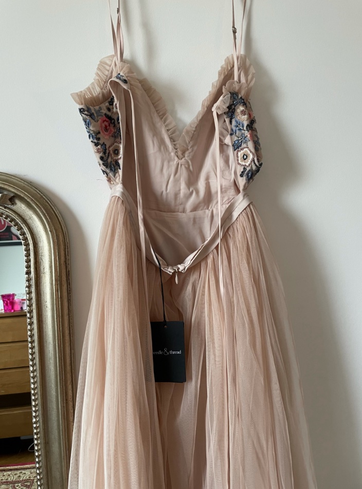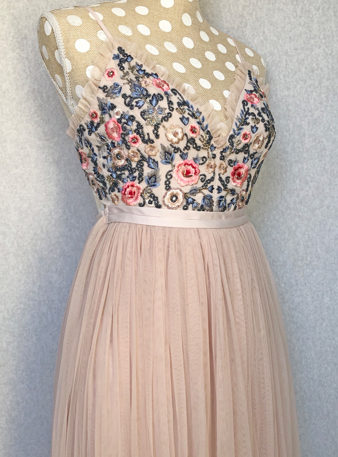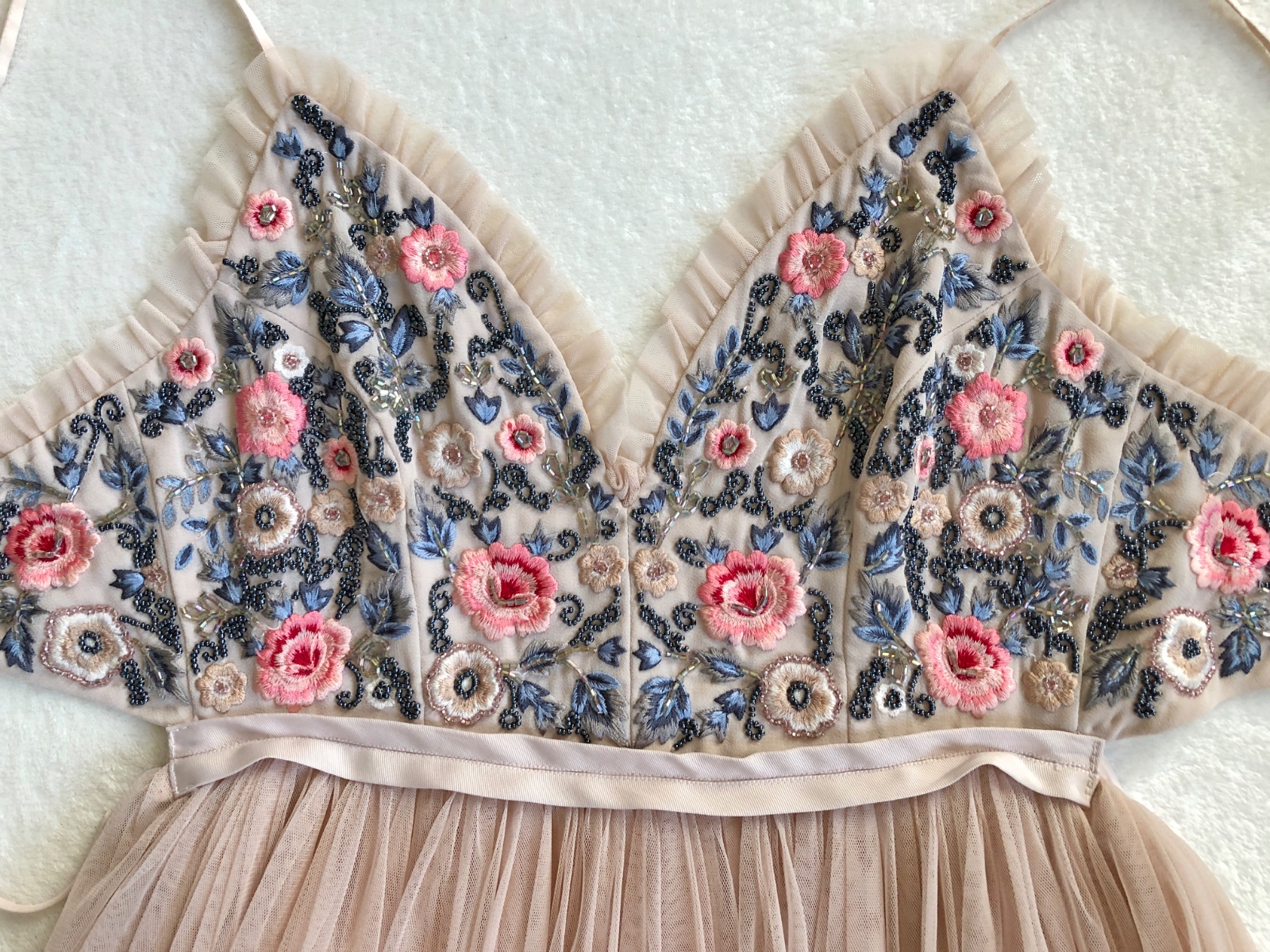 Jedinečné šaty luxusnej značky Needle and Thread - romantické, ženské, nežné, luxusné. Vrchný diel bohato vyšívaný v kontraste s jemnou bohato riasenou sukňou v púdrovej ružovej farbe. Ramienka sú dĺžkovo nastaviteľné, prispôsobiť sa dá top aj na obvod - s vizaním vzadu na chrbte. V super stave, bez poškodení.