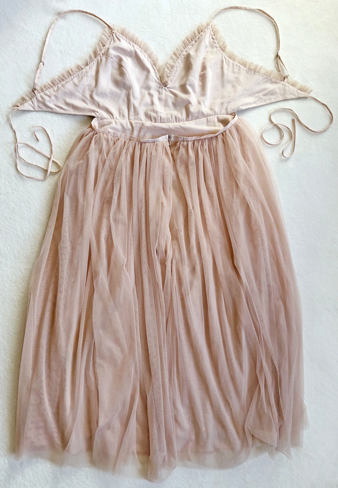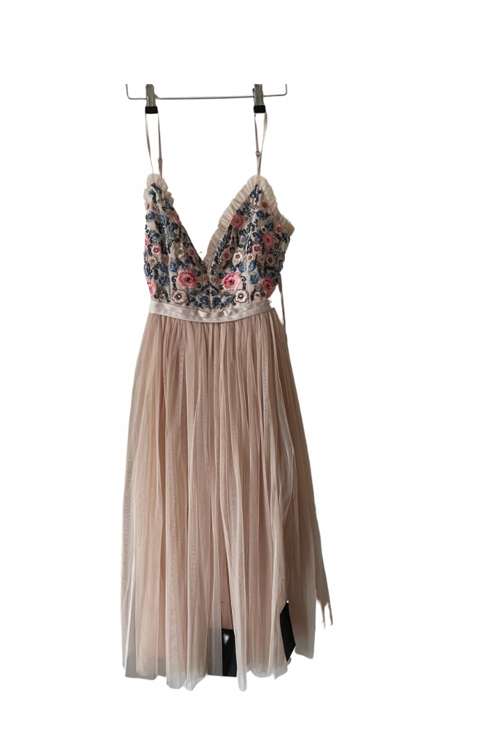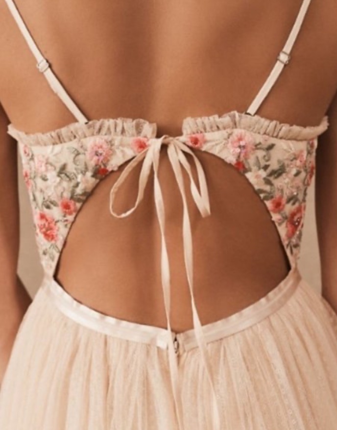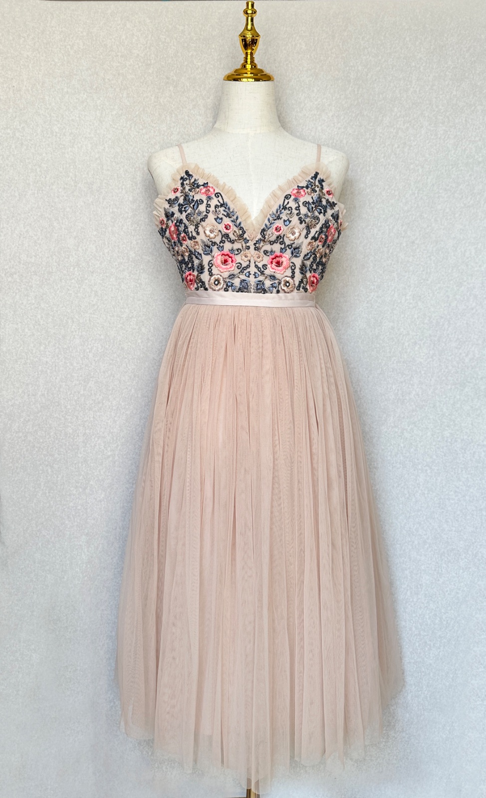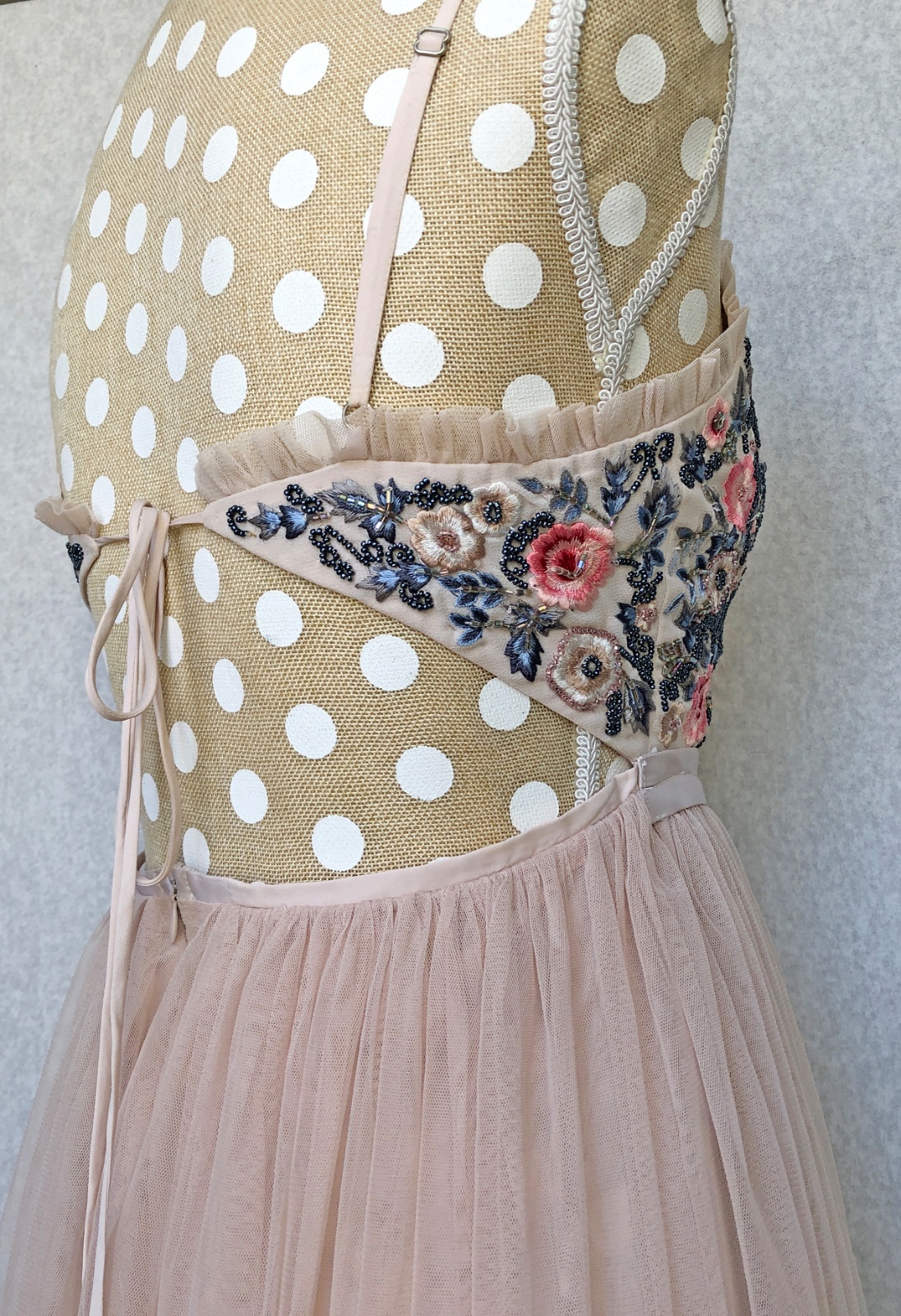 Jedinečné šaty luxusnej značky Needle and Thread - romantické, ženské, nežné, luxusné. Vrchný diel bohato vyšívaný v kontraste s jemnou bohato riasenou sukňou v púdrovej ružovej farbe. Ramienka sú dĺžkovo nastaviteľné, prispôsobiť sa dá top aj na obvod - s vizaním vzadu na chrbte. V super stave, bez poškodení.