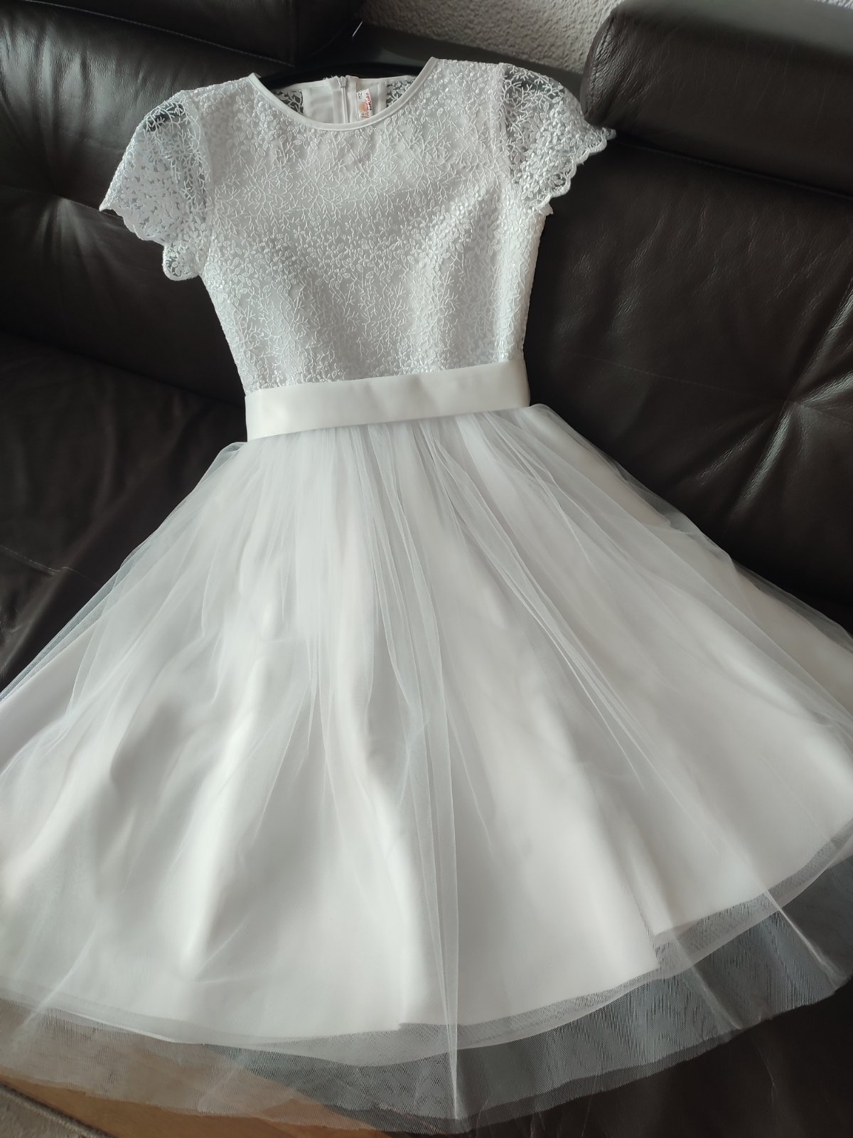 Predám šaty na 1.sv. prijímanie vo veľkosti 152. Obvod pásu 66cm, dĺžka šiat 95cm. Bolerko, čelenka, zápich na tortu, meštek a ozdoba na sviečku grátis k šatám.