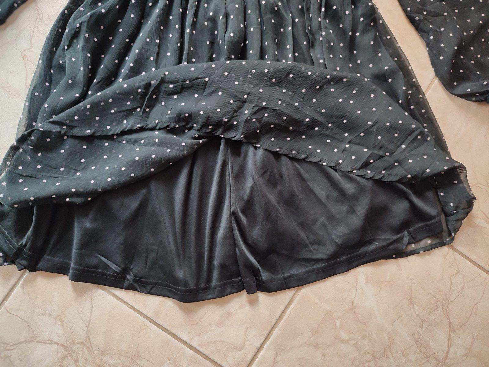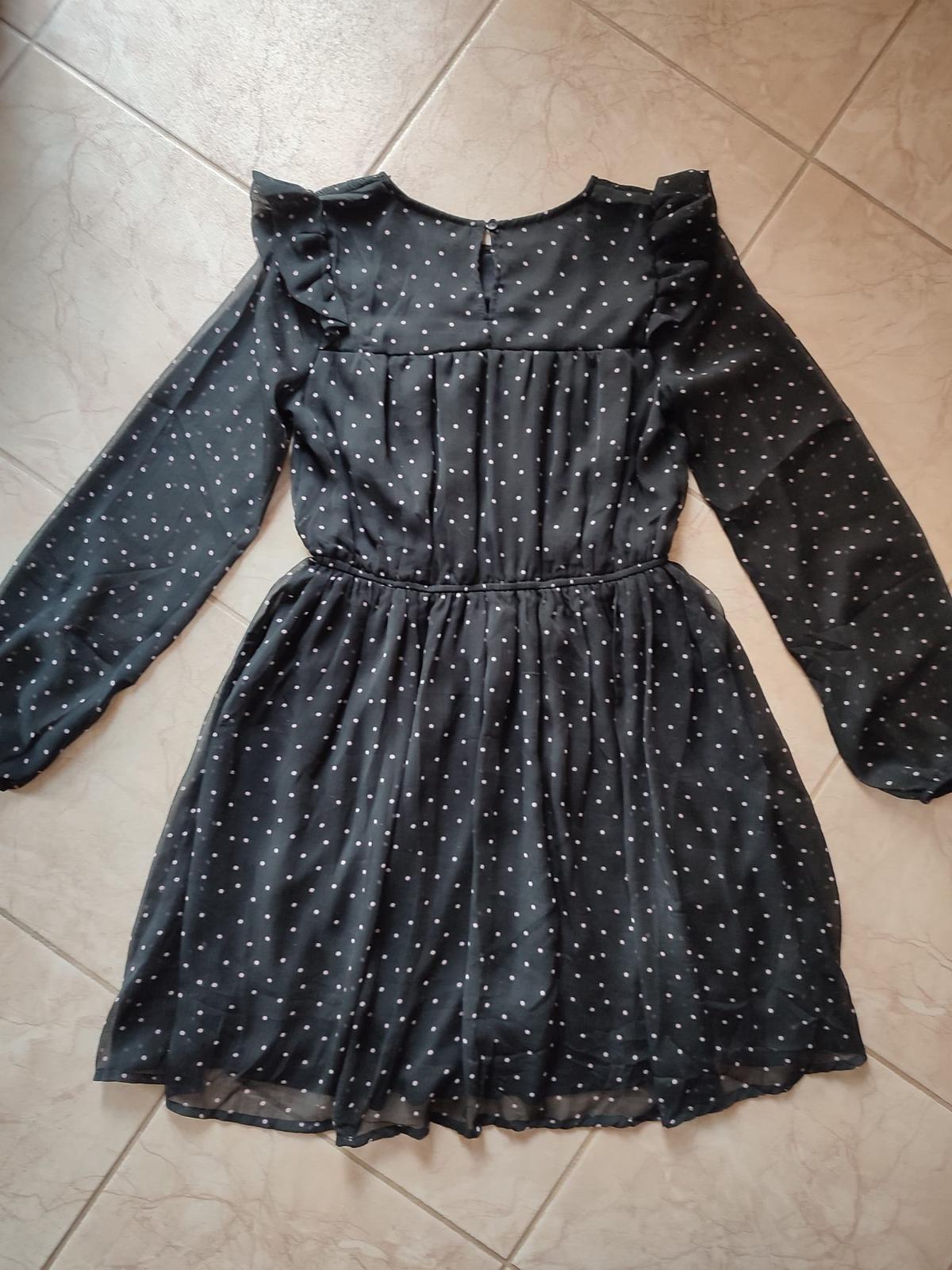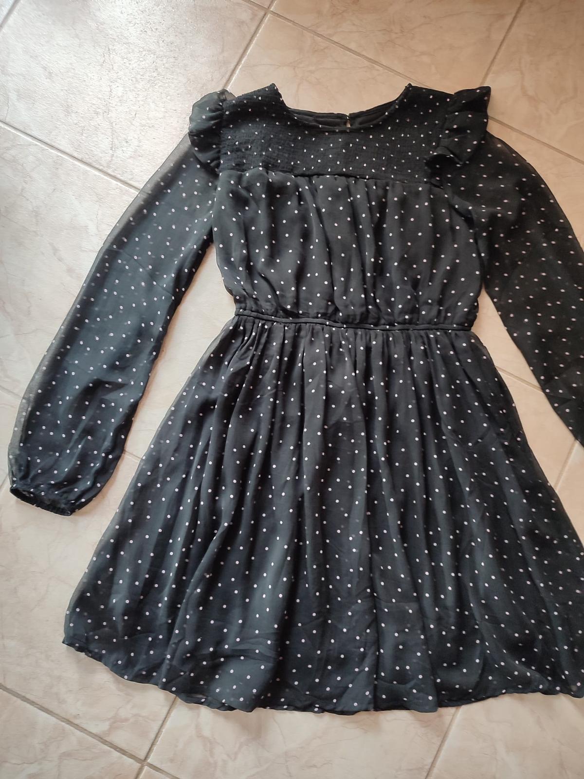 Krásne jemné šaty pre veľkú parádnicu. Sú z jemného priehľadného materiálu, telo a sukňa podšité, aby nepresvitali. Farba čierna s béžovými bodkami. Veľmi málo nosené, stav ako nové.