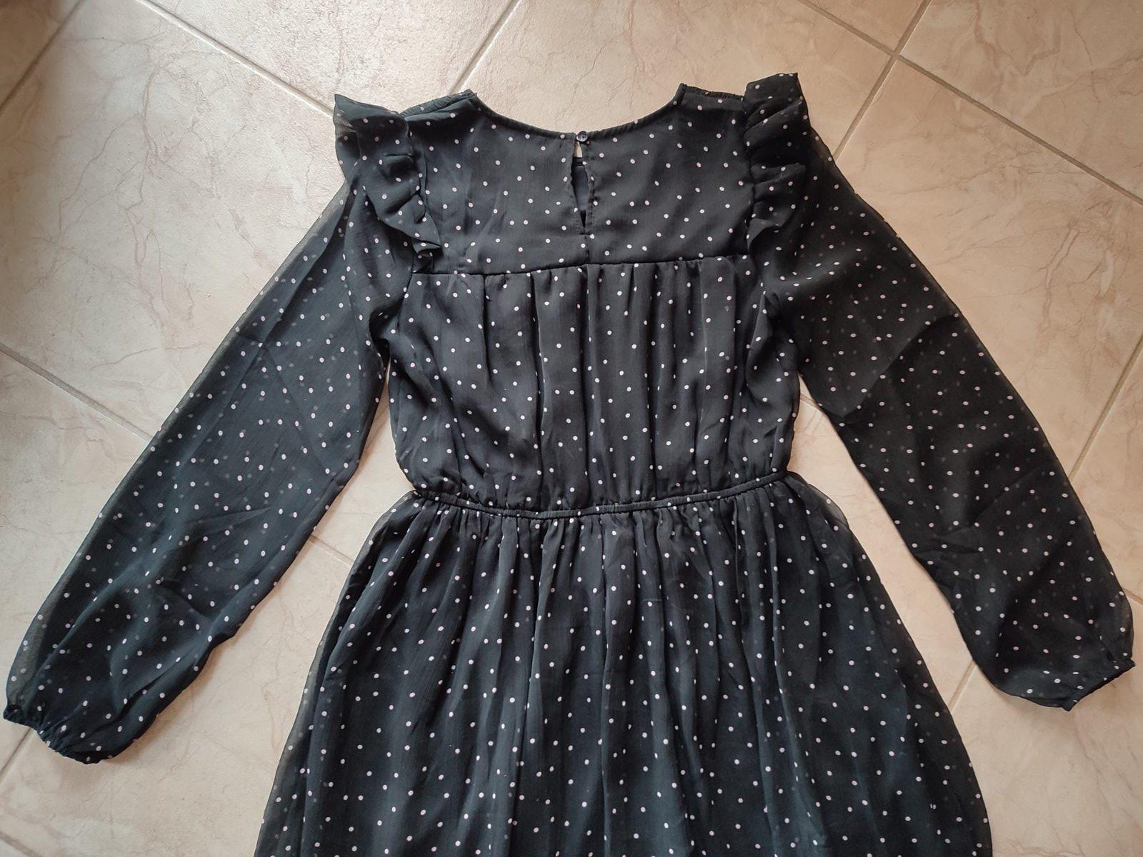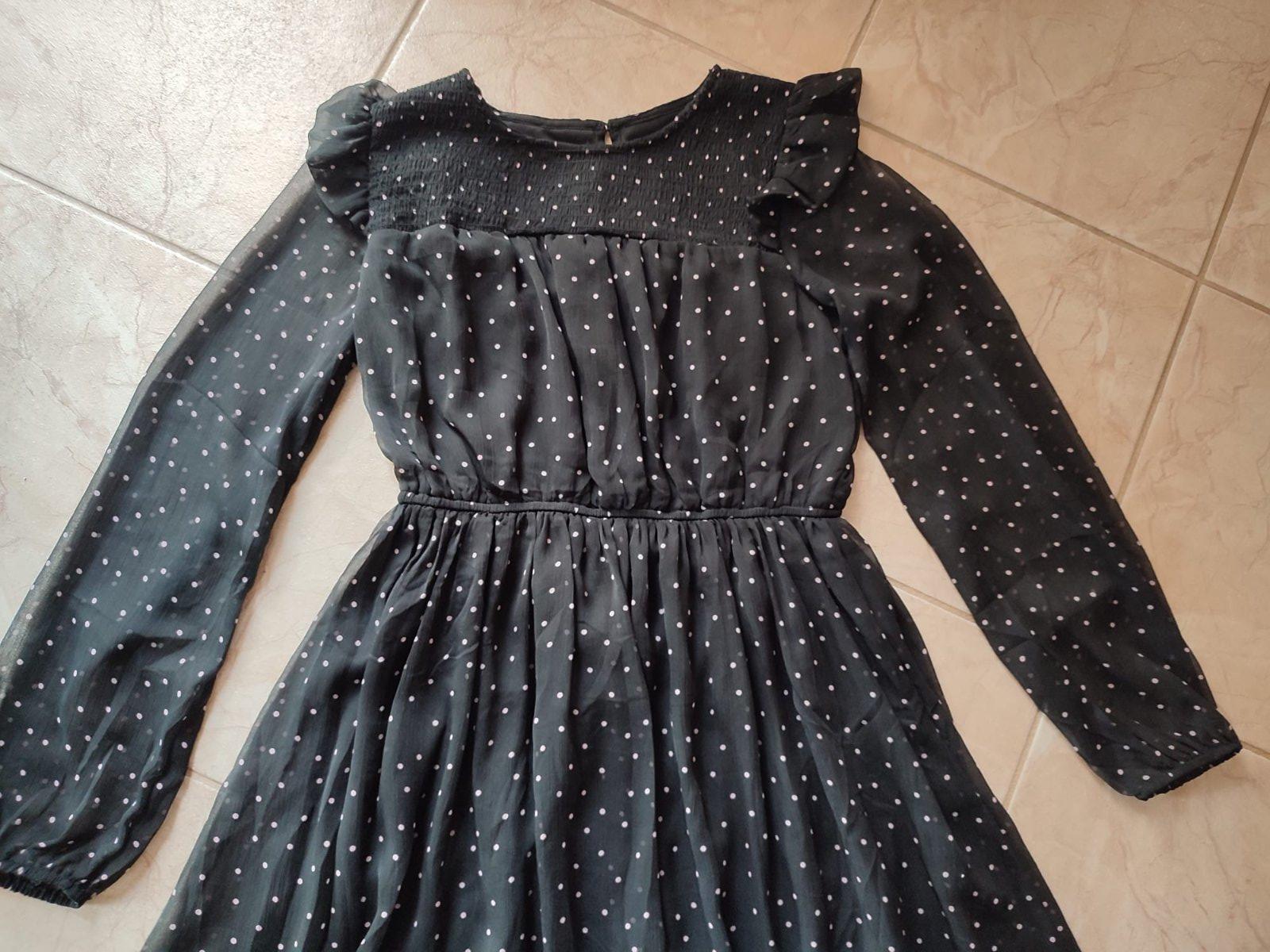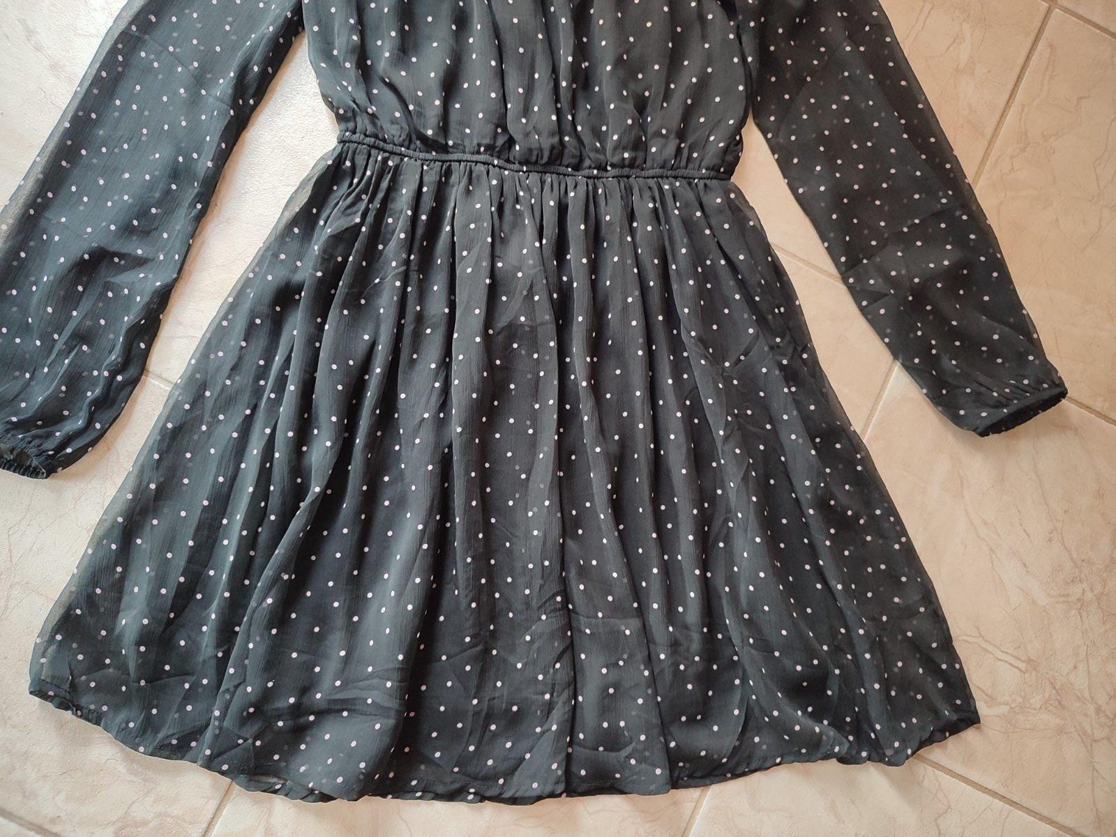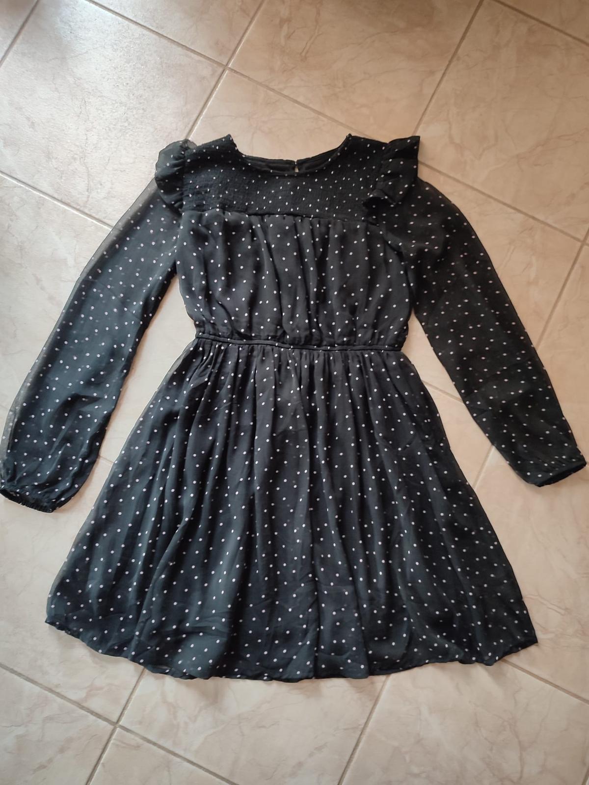 Krásne jemné šaty pre veľkú parádnicu. Sú z jemného priehľadného materiálu, telo a sukňa podšité, aby nepresvitali. Farba čierna s béžovými bodkami. Veľmi málo nosené, stav ako nové.