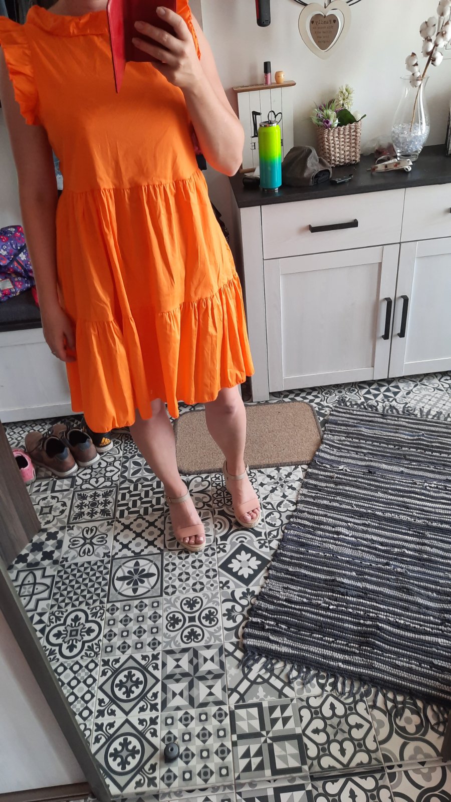 Šaty párkrát oblečené ako nové.Ľahky vzdušný materiál. Na pleciach a pri krku majú volán. Vzadu pri krku gombik.