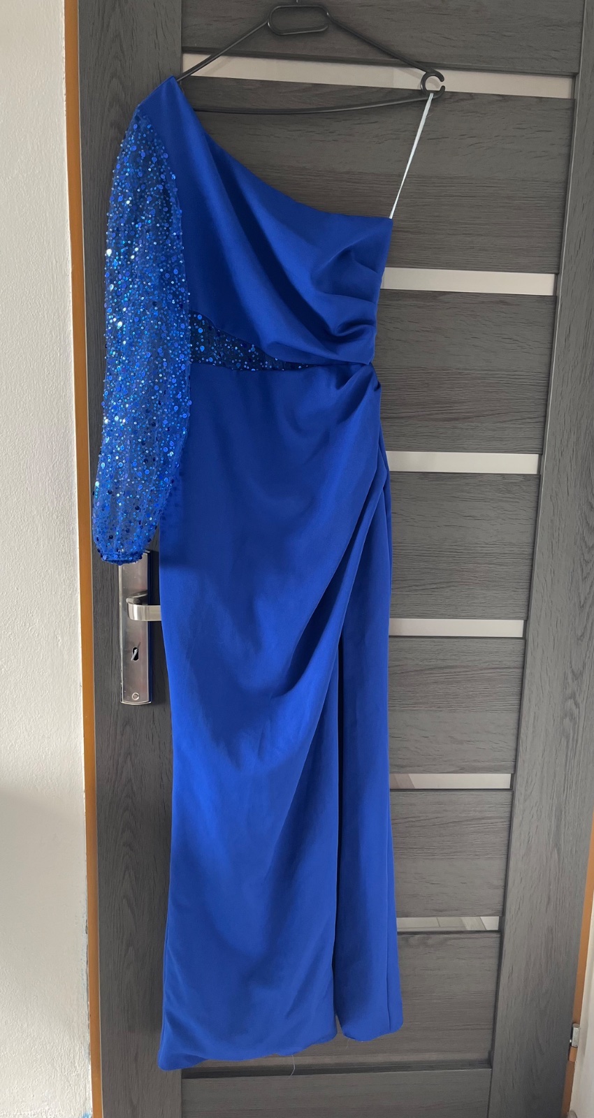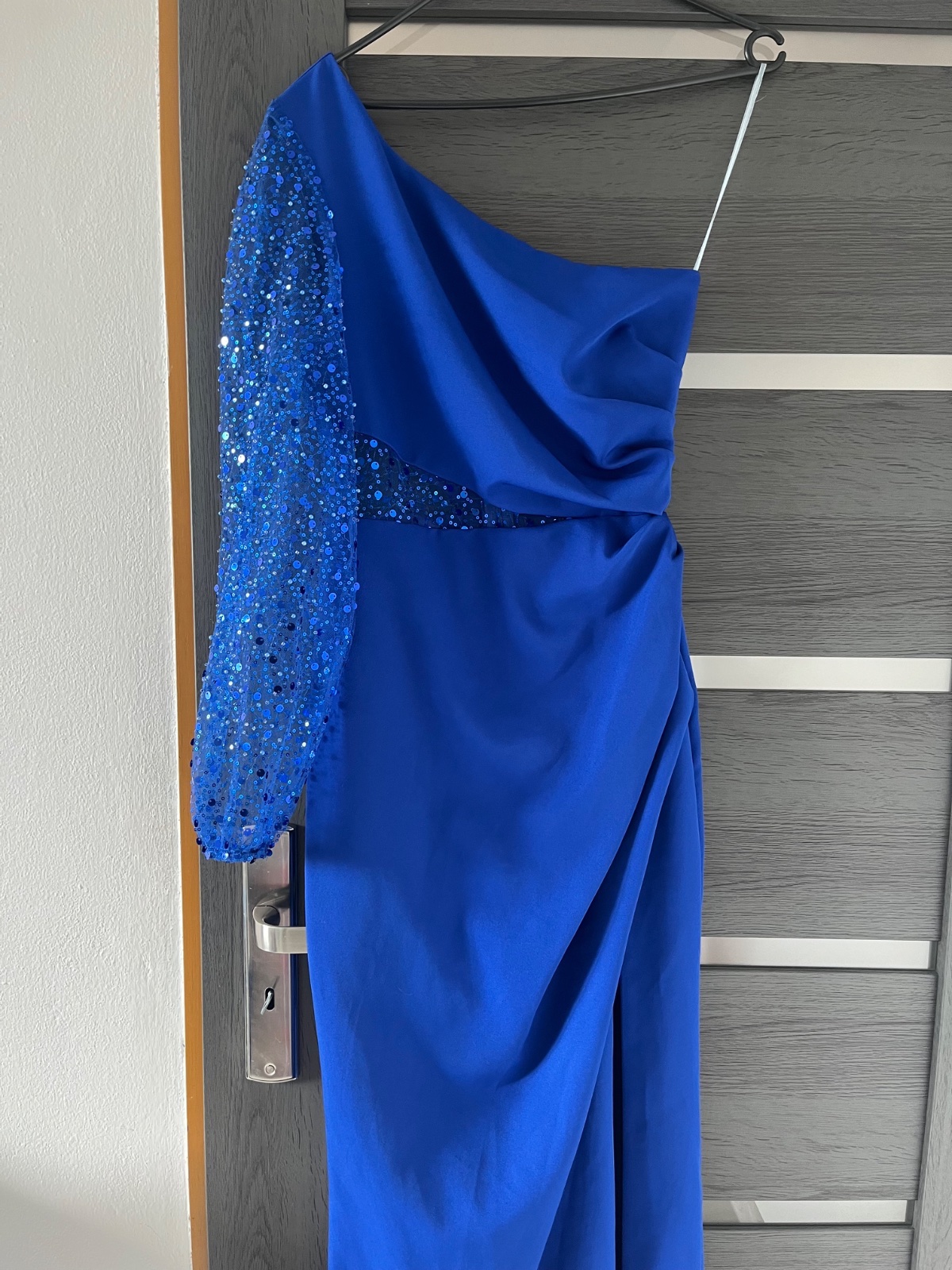 Raz použité,vyčistené bez chýb, Jemné trblietky, sexi vysoký rozparok, poodhalený pás. Materiál šiat je mierne elastický a vzadu sa zapínajú zipsom. Šaty sú raz oblečené, vyčistené