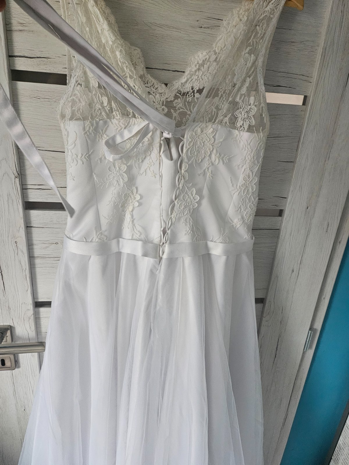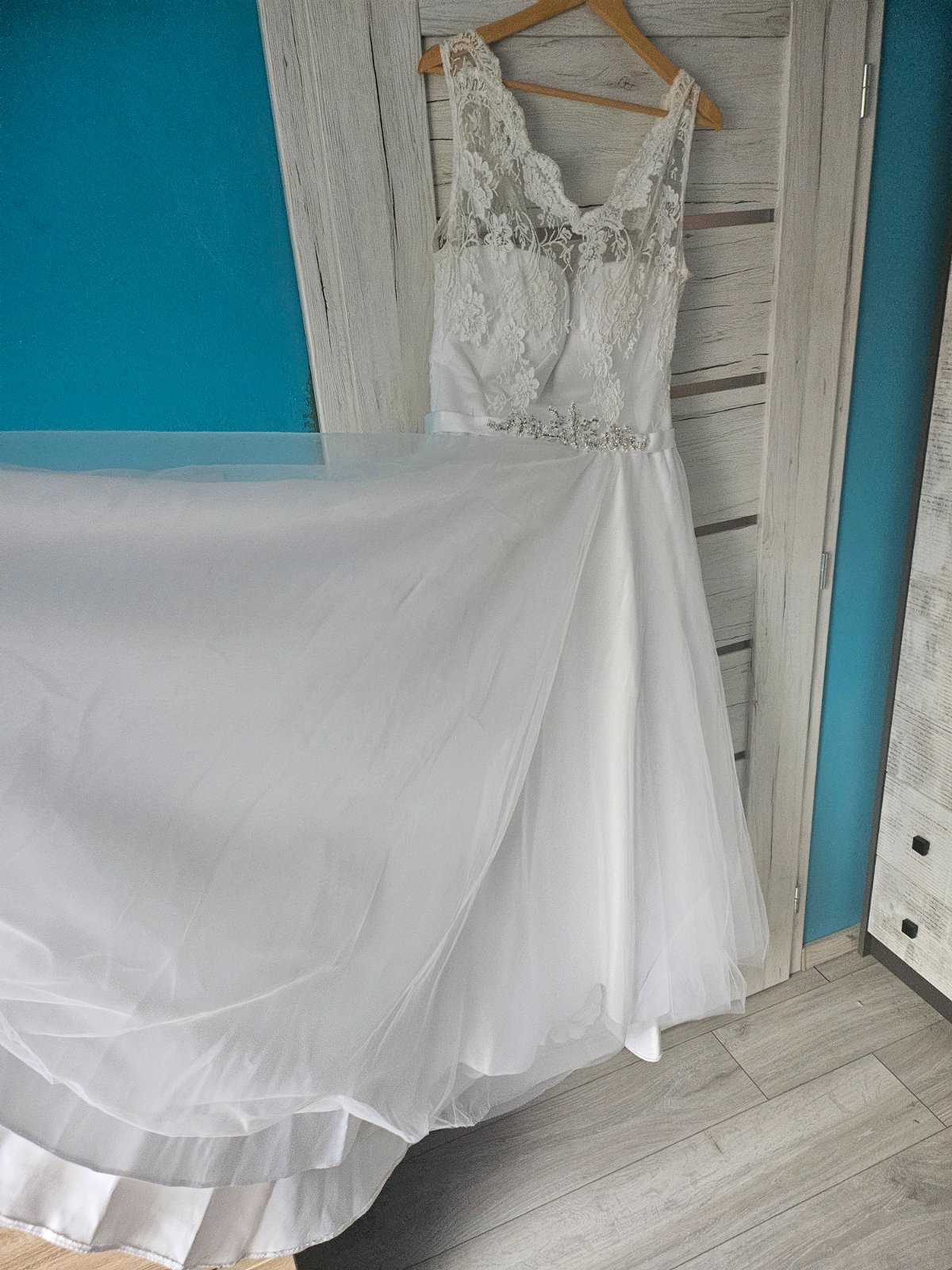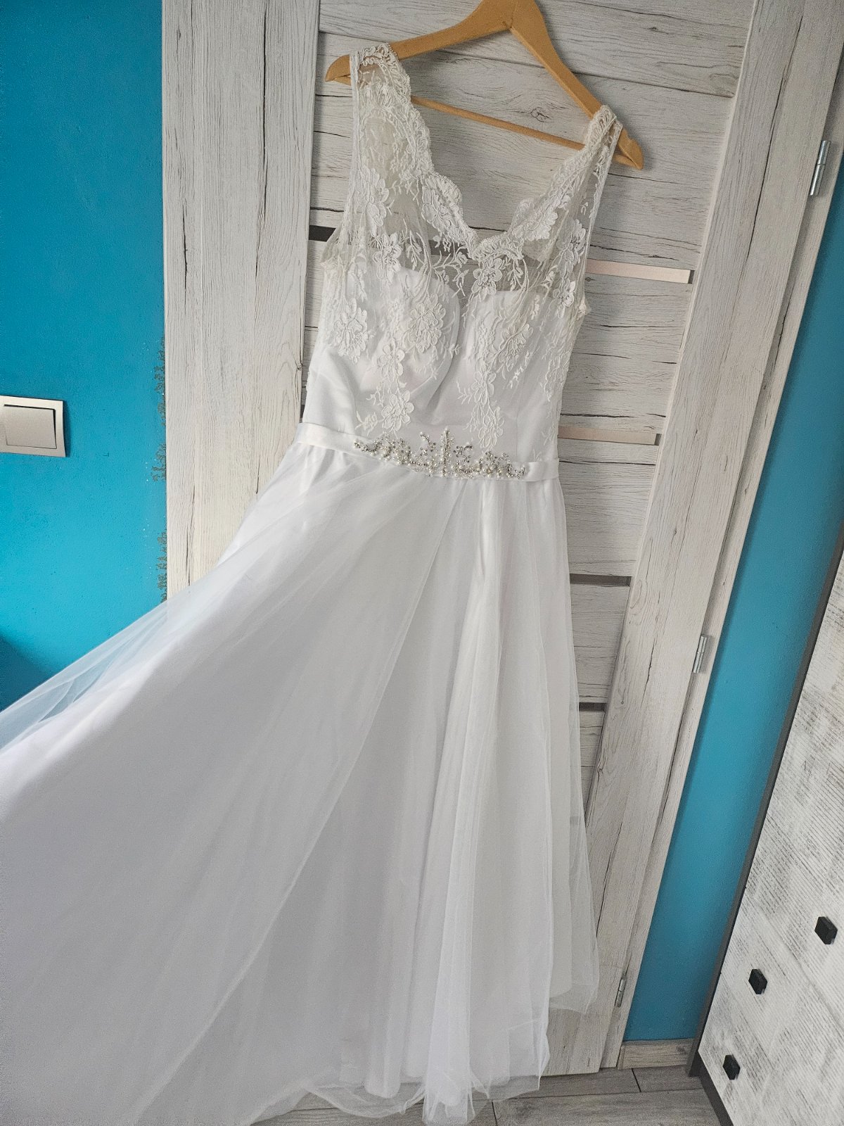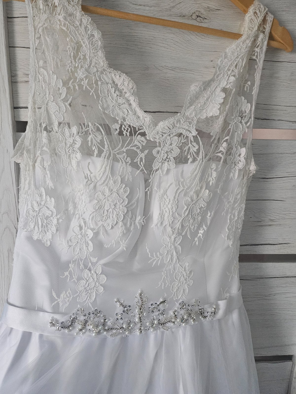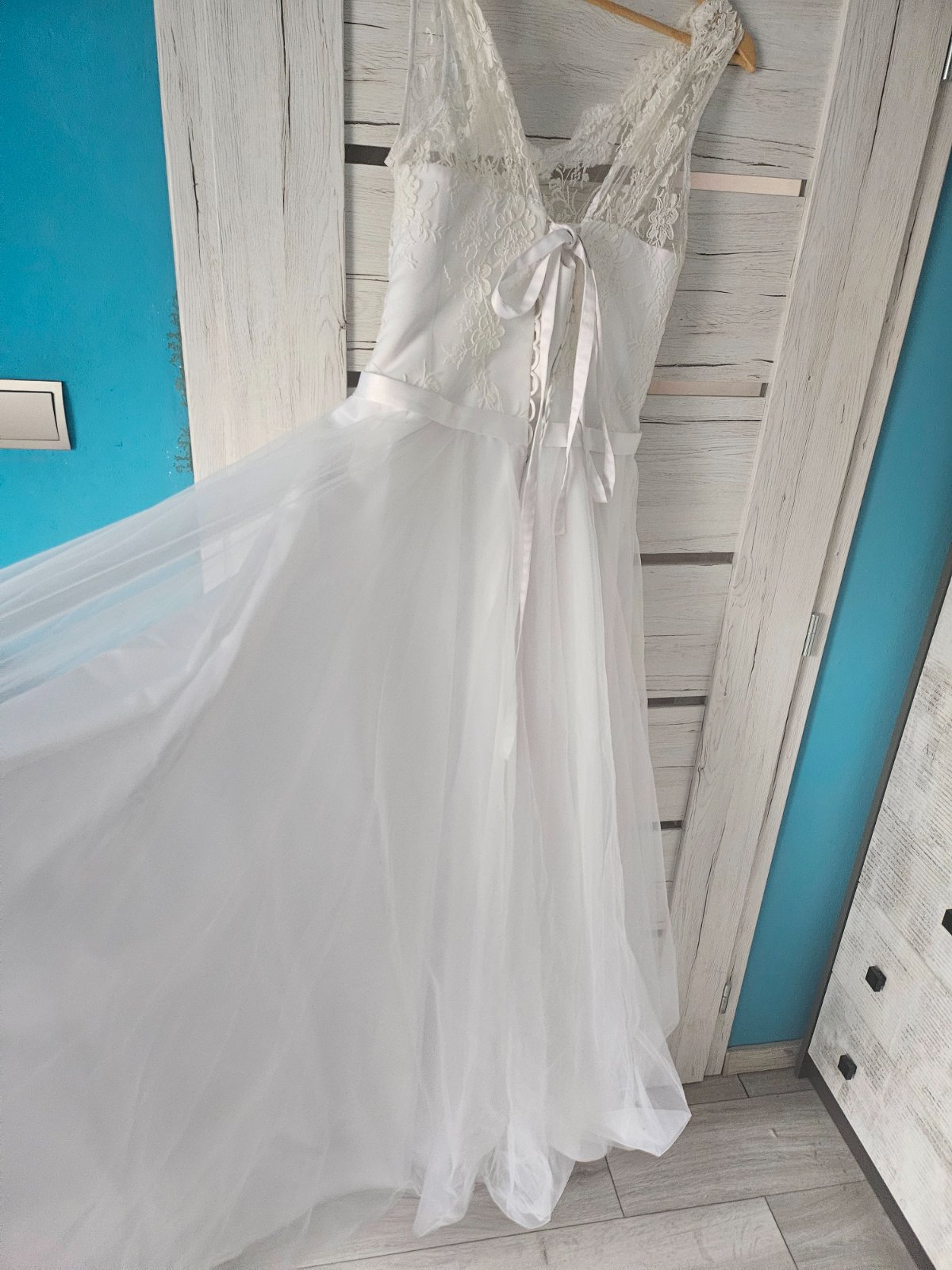 Predám svadobné šaty ktoré som využila len pri obrade a pri fotení veľkosť je písaná XL ale sadnú aj na L