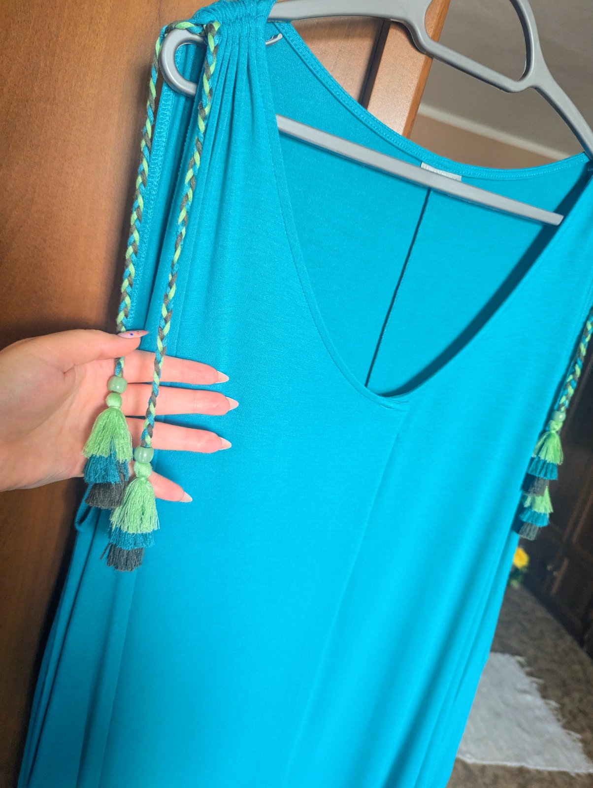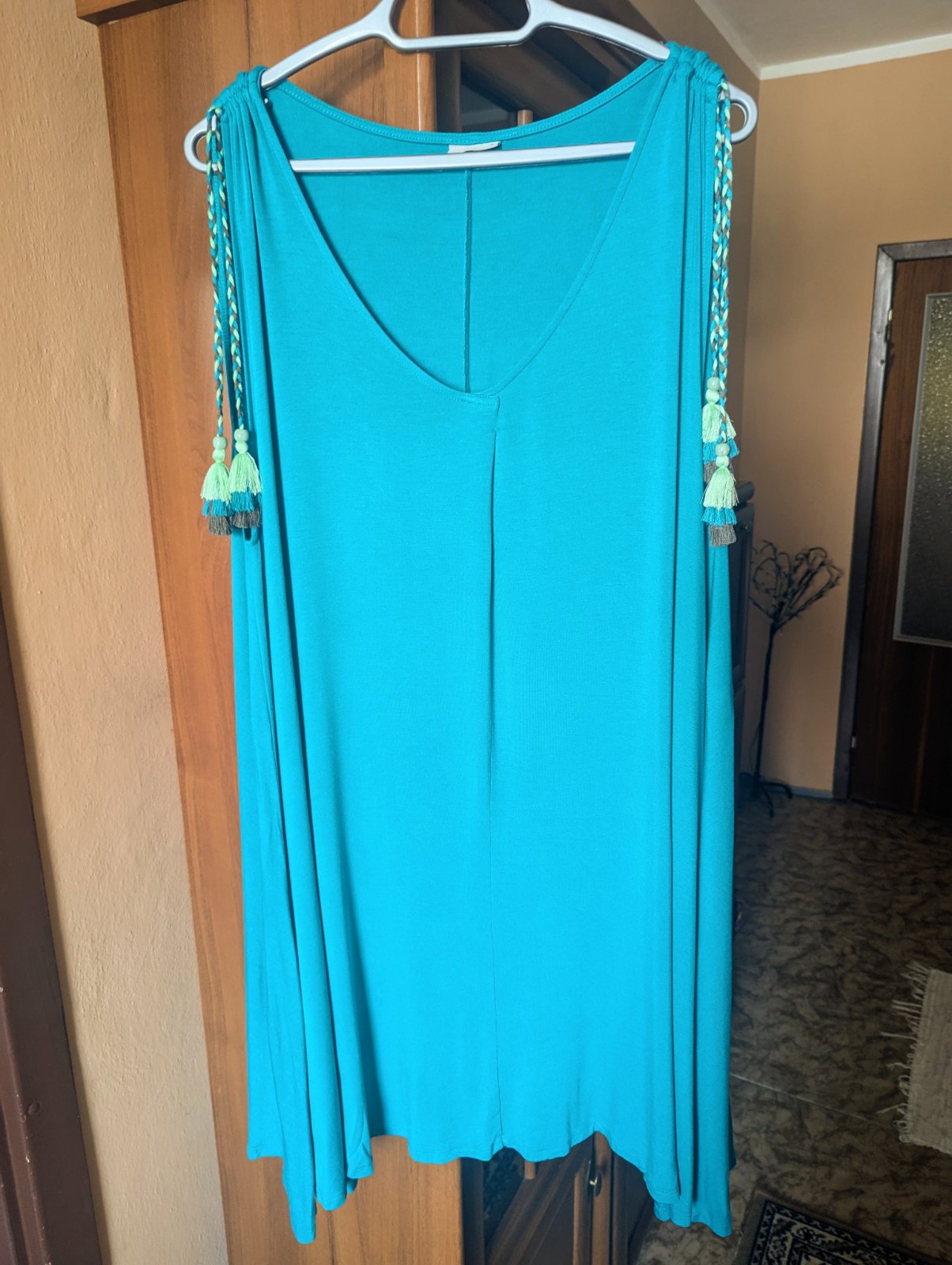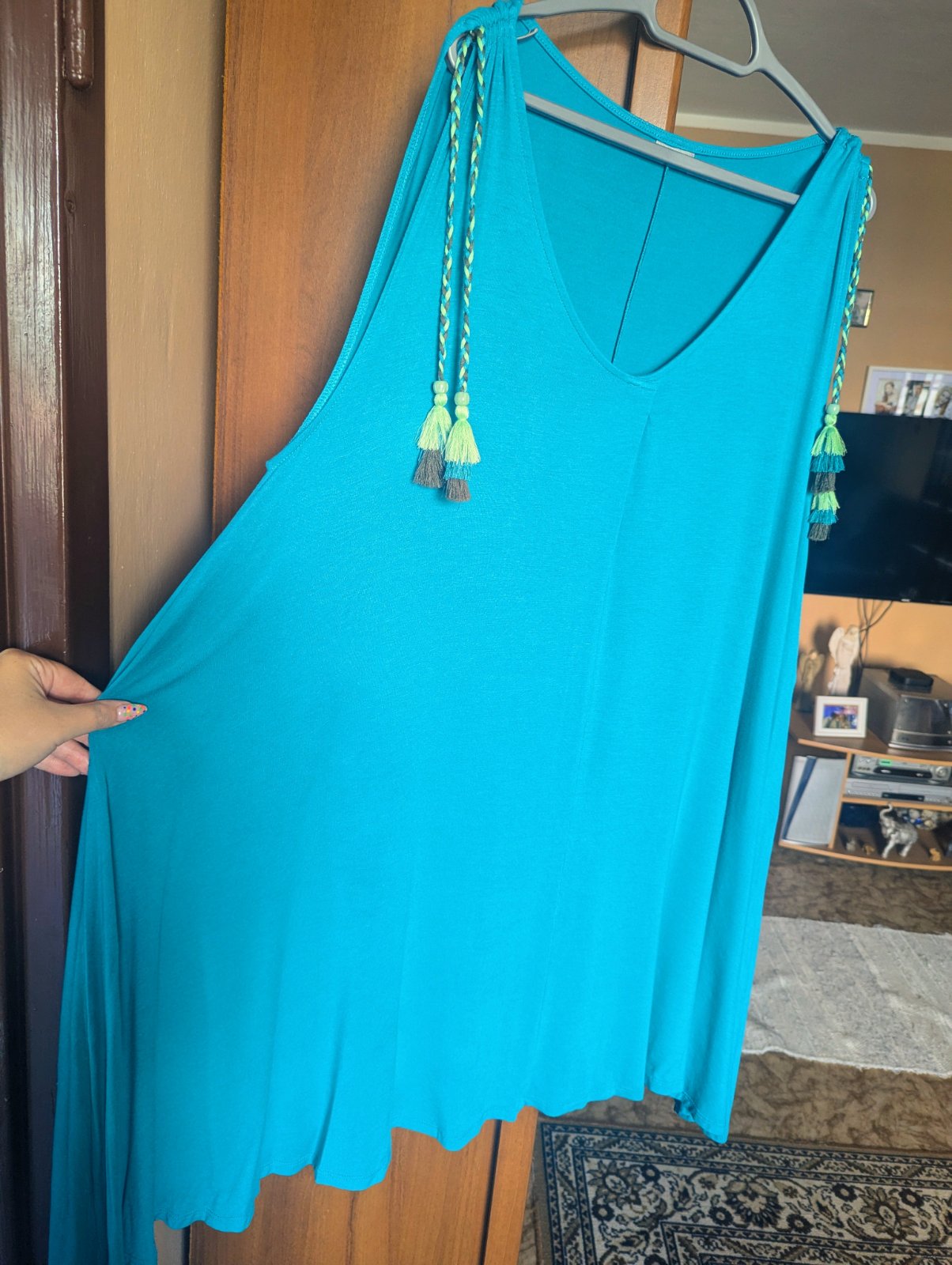 Letné šaty/prehoz na plavky, ktorý má uvedenú veľkosť L-ko no je OVERSIZE strihu takže sedí na veľkosť 48/50 až 52, ale každopádne sa treba riadiť rozmermi. Šaty sú značky LAURA TORELLI.