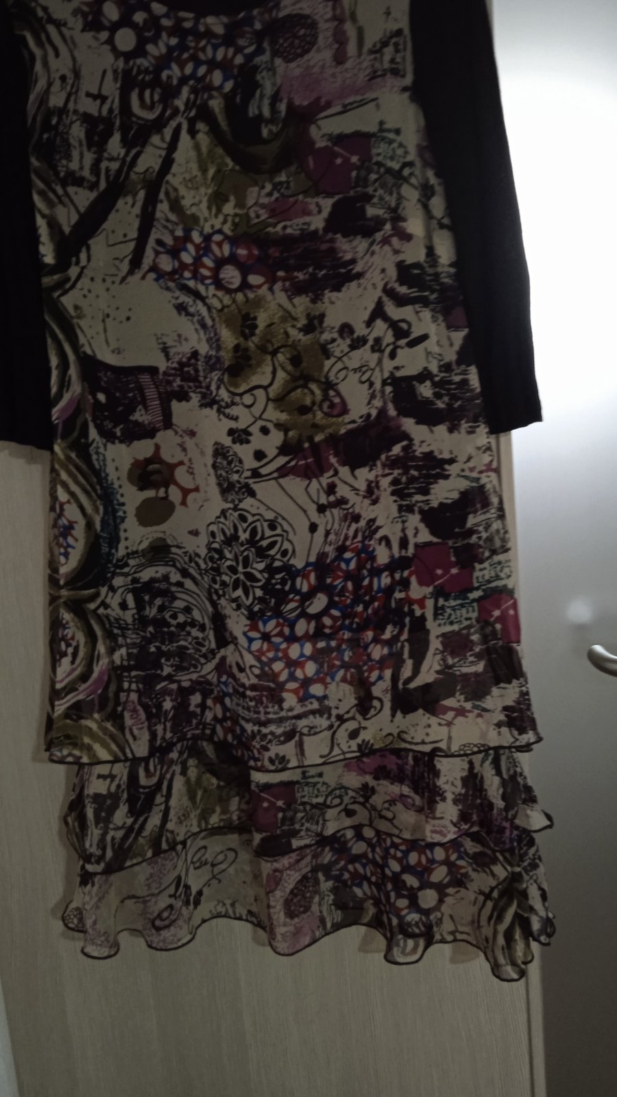 velmi pekné ľahké šaty s volánmi. šírka 49, dlžka 99, rameno 9, rukáv 42. material niečo ako šifon, rukáv tenučká tričkovina. podšité.