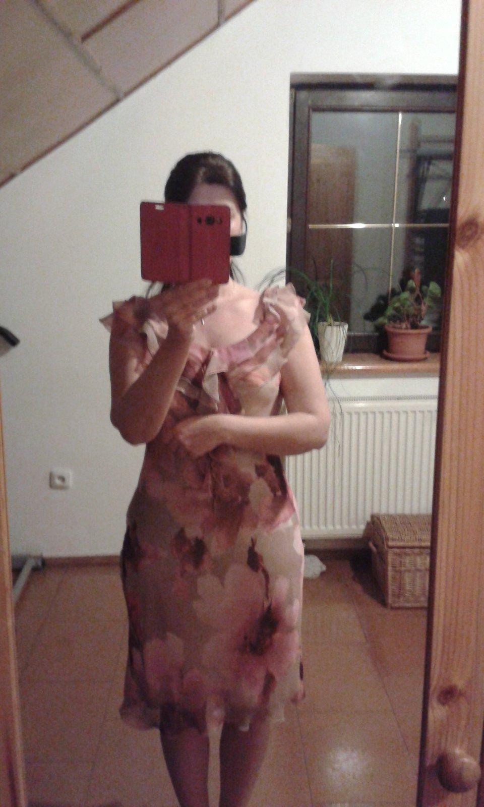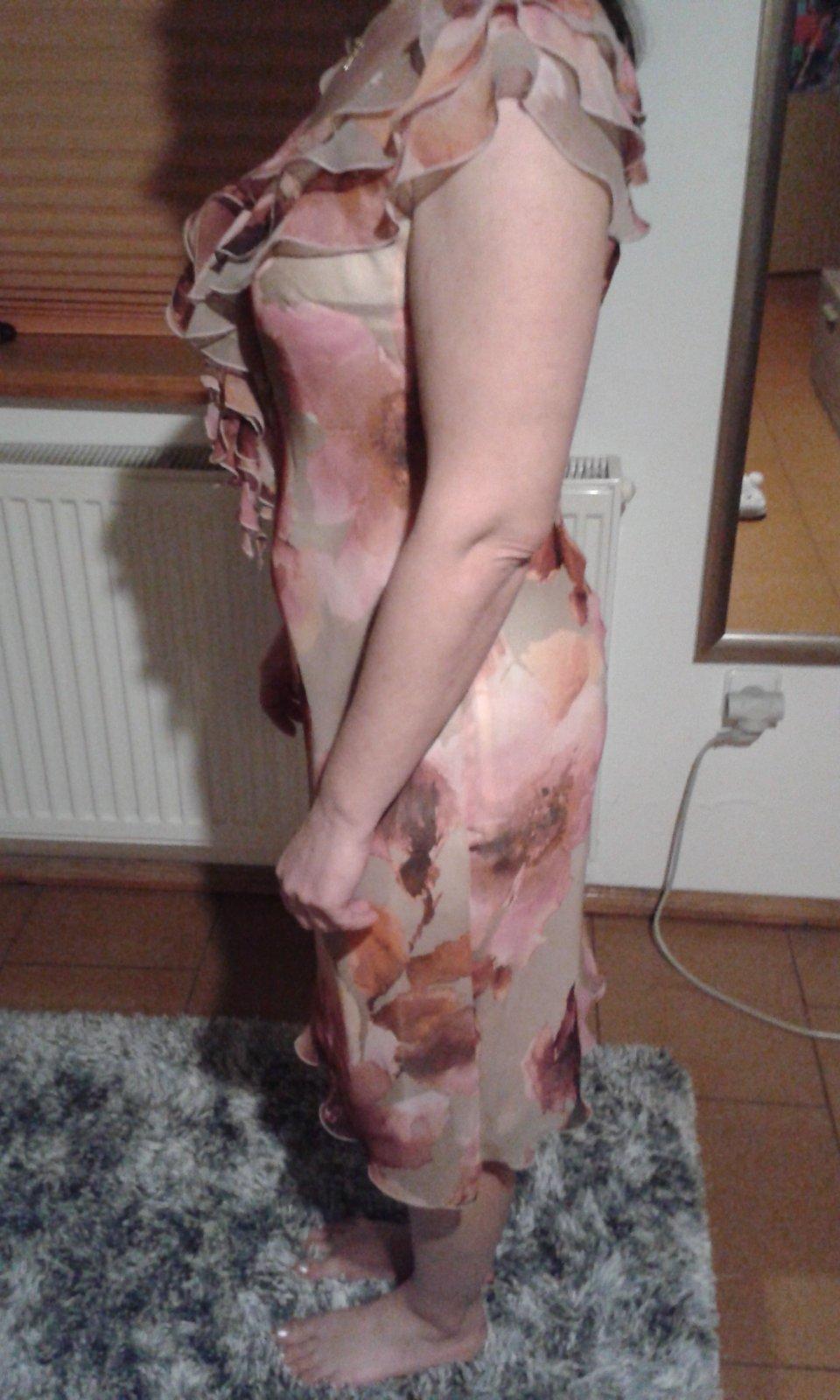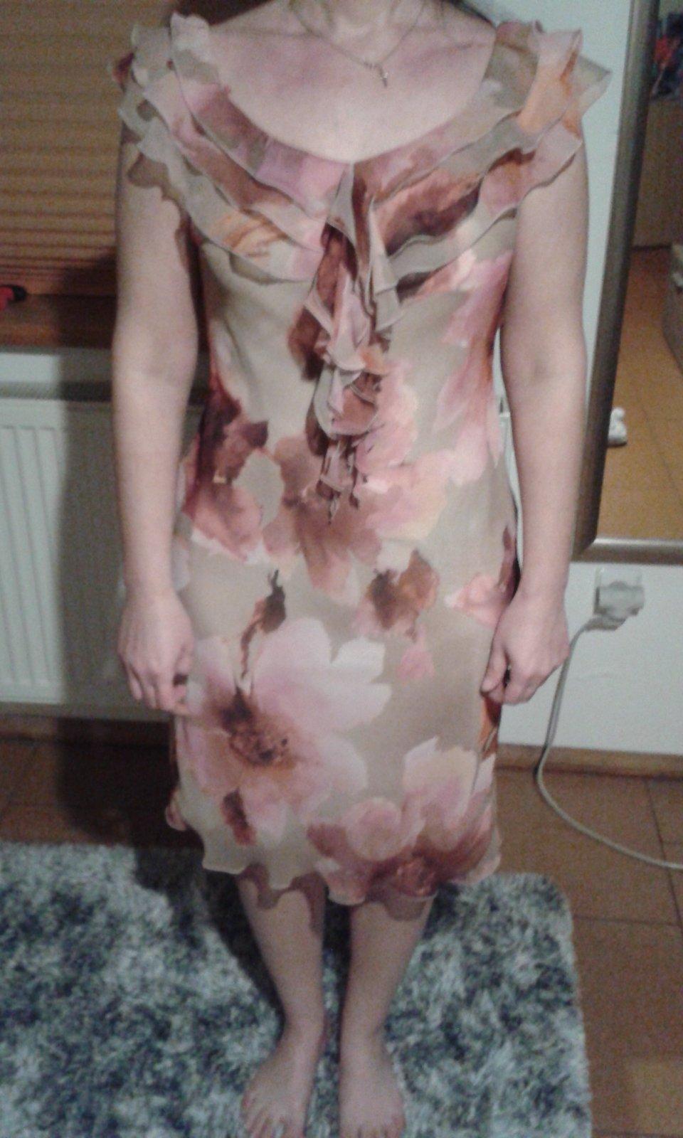Predám dámske šaty kvetované ružovo béžové s volánikom 1x oblečené, materiál lahučký nekrčivý šaty sú celé podšité