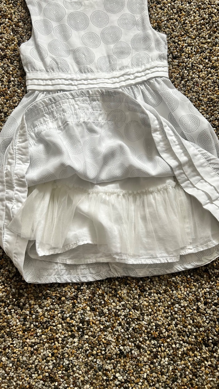 Biele s kruhmi - značka s.Oliver. Našla som na nich dva malé fliačky. Sú odfotené. Pri nosení nevidno, zohľadnené v cene. Je to bavlna. Nie sú elastické. Majú podšívku, ktorá na šatoch robí krásnu sukňu. Vzdadu skrytý zips.