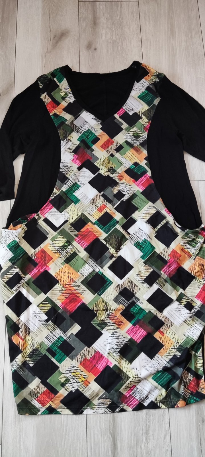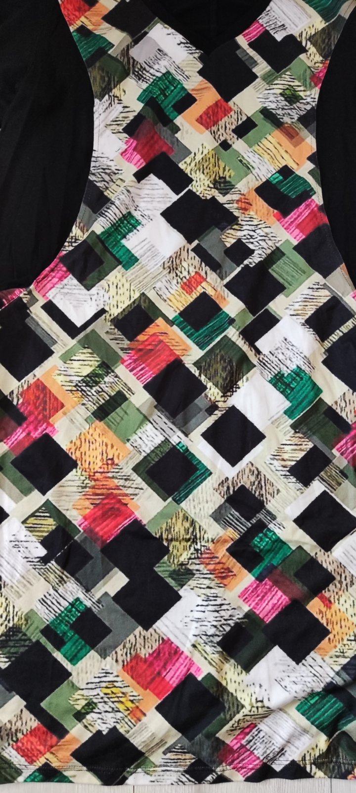 Šaty BF, vzadu čisto čierne, vpredu vzor farebný, na bokoch majú funkčné vrecká, maďarský výrobca Beauty Fashion,