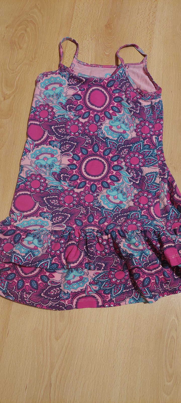 Veľmi dobrý stav! Dievčenské letné kvetované šaty bez rukávov. Elastické.Tenké. Materiál 100%bavlna. ROZMERY:dĺžka (meraná vzadu):66cm,pod pazuchami meraná šírka:2x32cm,od pazuchy dĺžka dole:48,5c...