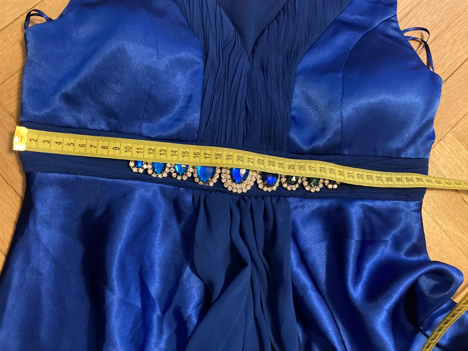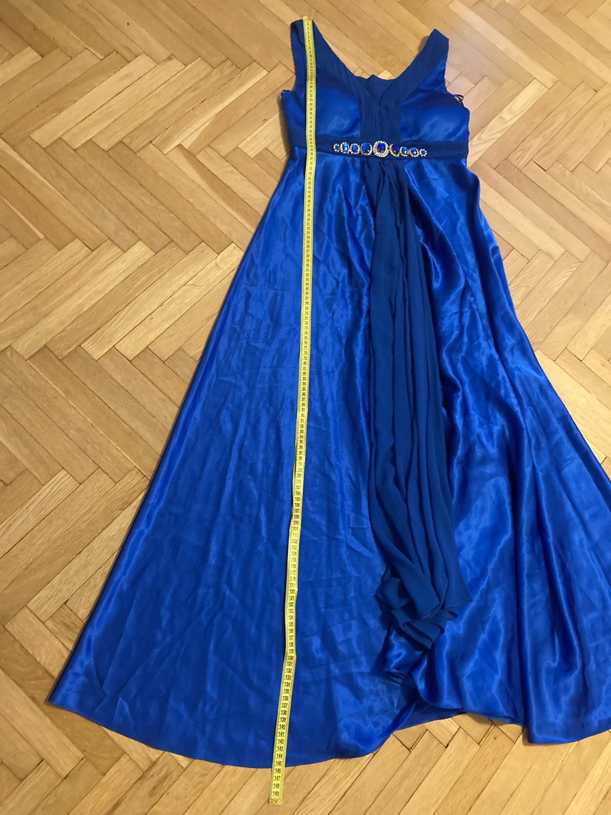 kráľovská modrá - pod prsiami sú prestrihnuté a bohato zdobené kryštálmi - materiál lesklý satén v kombinácii s matným šifónom. Veĺkosť píšu 38, no sedí skôr na S, resp. M s menším poprsím. Na výšku cca 164 cm. Oblečené 1x - bez známok nosenia, poškodenia, stačí vyžehliť :)