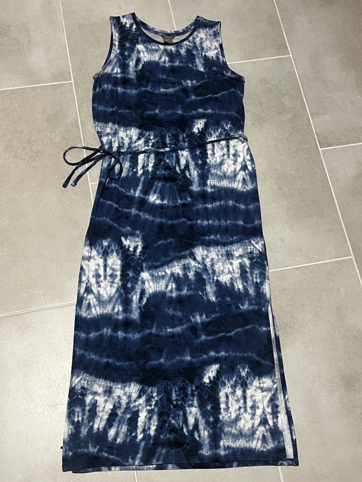 Zavinovacie šaty- modrý základ s oranžovými pruhmi, krásne zoštíhľujú postavu. Veľkosť na visačke je S, ale ja nosievam 38 a sedia jedna báseň. Výstrih je hlbší, krásne by ukázal na plnších prsiach...