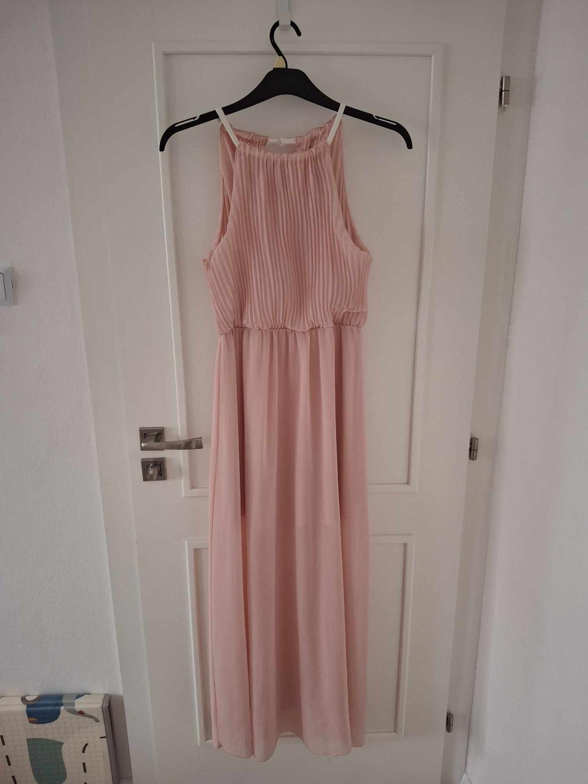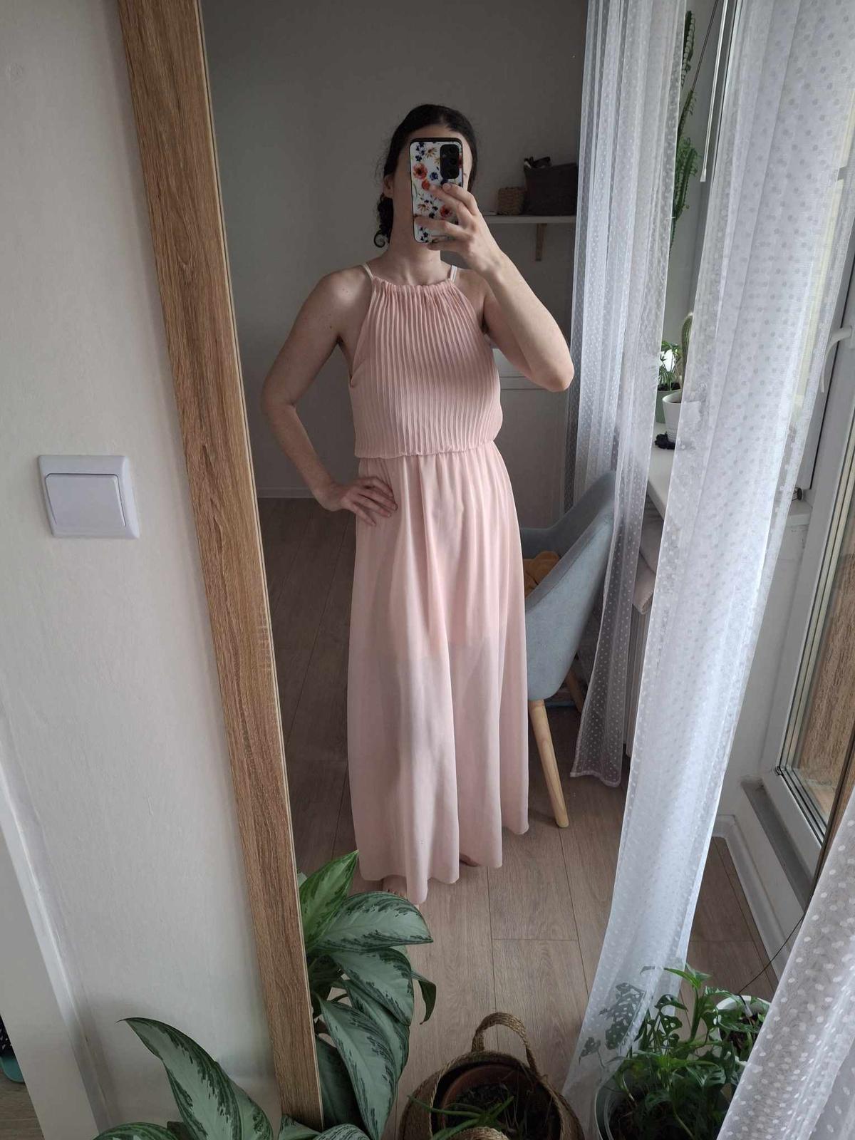 Krásne trblietavé šaty ružovo púdrovej farby, veľkosť písaná S, ja nosím 36/38. Vrch skôr 38. Na moju výšku 168cm boli akurát po zem. Šaty sú nádherné s rozparkom pri stehne. K šatám je aj opasok. ...