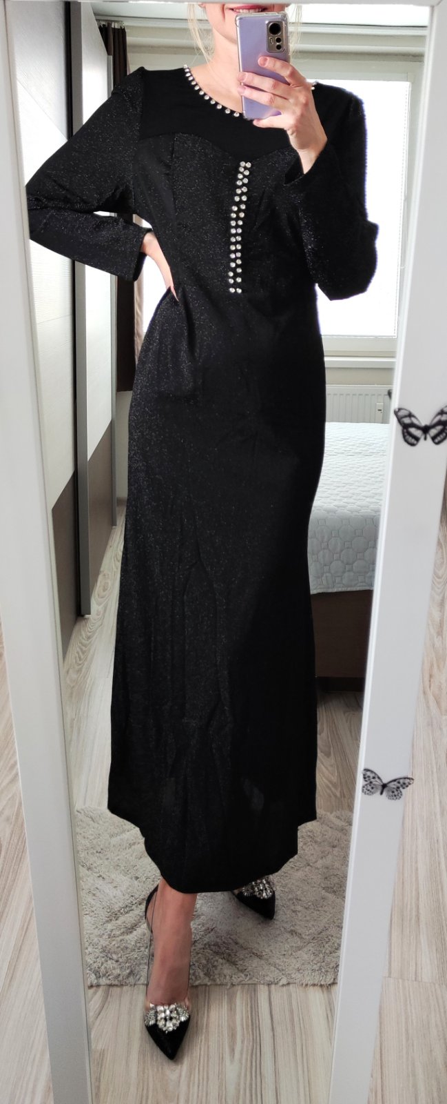 Krásne trblietavé šaty vo veľkosti 3XL, je to skôr 2XL/3XL, prikladám miery: prsia šírka 50-61, pás šírka 46-55, boky šírka 55-65, dĺžka 147, rukáv dĺžka 65. Cena 32 eur.