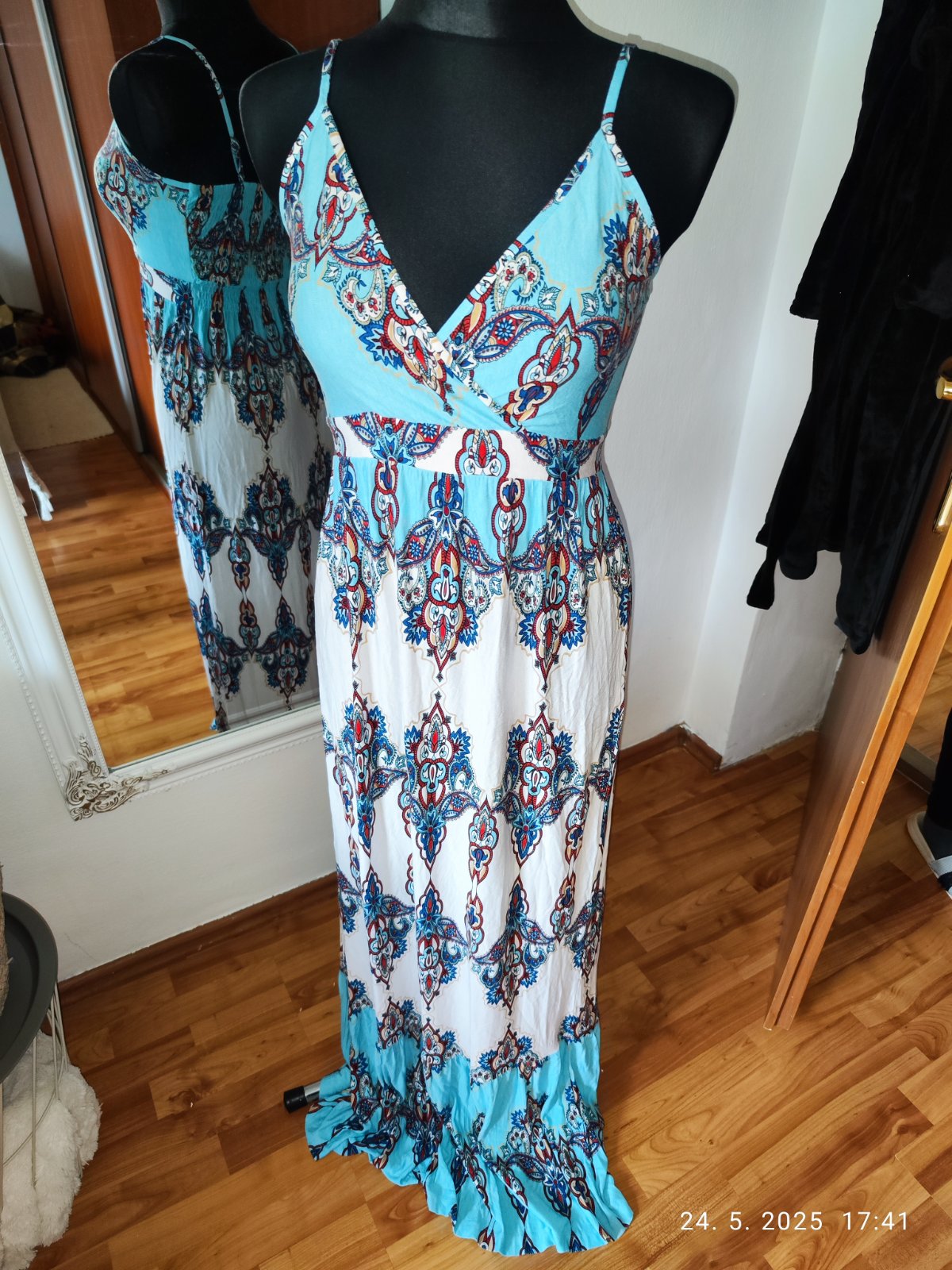 predam uplne nove , nenosene dlhe saty . krasna farba - tyrkysova (ako na prvych fotkach . Velkost Uni. Velmi prijemny taky ten chladivy material . Šaty maju po stranách aj vrecka. Moja vyska 166c...